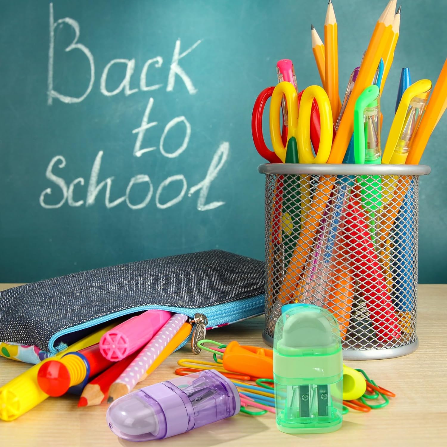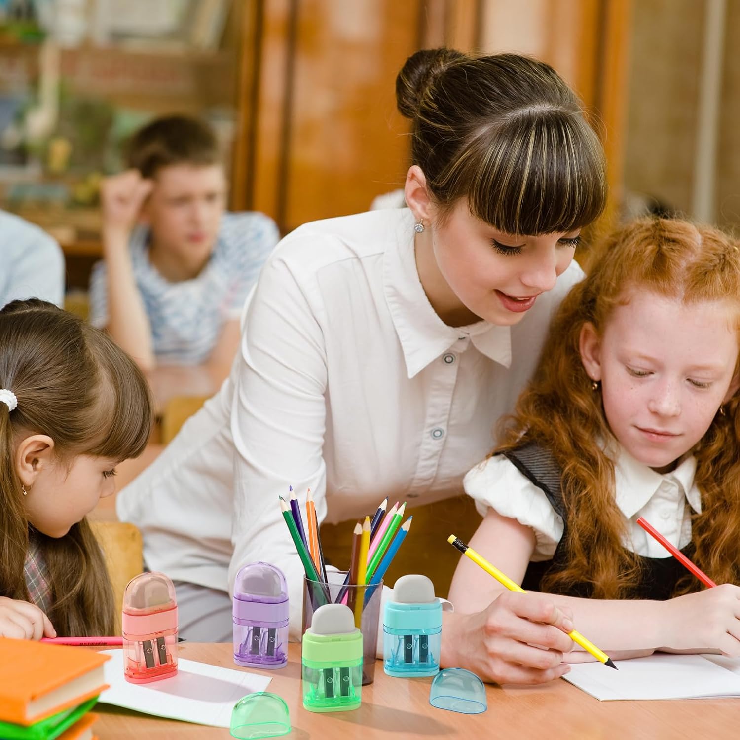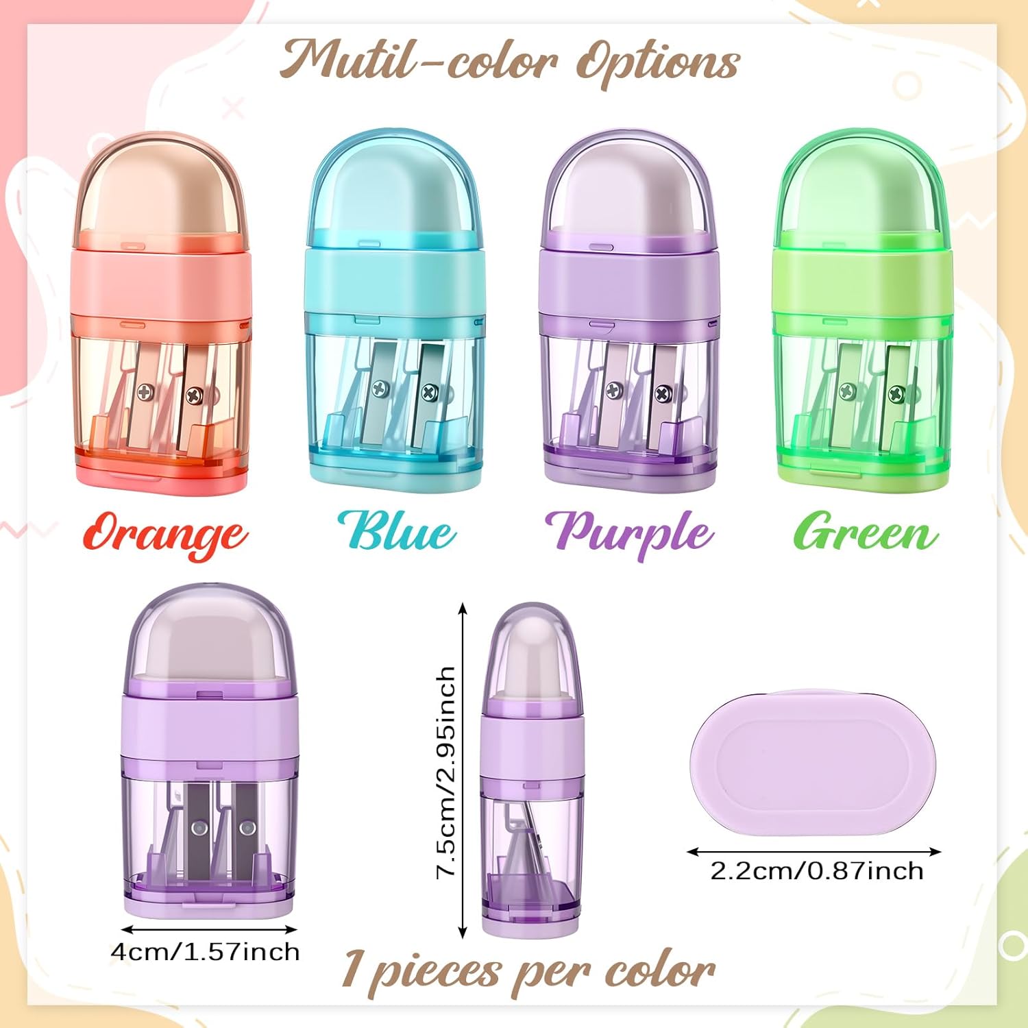 Design unico 2 in 1: questo temperamatite manuale a doppio foro è progettato con una combinazione di gomma, facile da usare e consente di risparmiare spazio per gli utenti; non è solo un temperamatite, ma viene anche fornito con una gomma sull'altra estremità, che può pulire i segni della matita in modo pulito Creativo e attraente: il temperamatite ha 4 diversi colori: verde, blu, arancione e viola, uno di ogni colore, per un totale di 4; i colori diversi e vivaci lo rendono più interessante e piacevole, e può essere facilmente messo nell'astuccio Design intelligente con copertura trasparente: il temperamatite viene fornito con una copertura e i trucioli di matita cadranno nel piccolo vano portaoggetti quando in uso; non c'è bisogno di preoccuparsi di rovinare la scrivania, è possibile mantenere la scrivania in ordine, ed è anche comodo svuotare la spazzatura dopo l'uso Materiale di qualità: il temperamatite è realizzato in plastica resistente e leggera, mentre la lama interna è realizzata in metallo, che consente di tagliare rapidamente le matite senza danneggiarle, rendendolo un accessorio di cancelleria di lunga durata Ampi usi: questi temperamatite colorati possono essere utilizzati non solo per affilare matite, pastelli e matite colorate, ma anche come incentivi per un buon comportamento o divertenti aggiunte alle scatole premio in classe, rendendo l'apprendimento emozionante e divertente