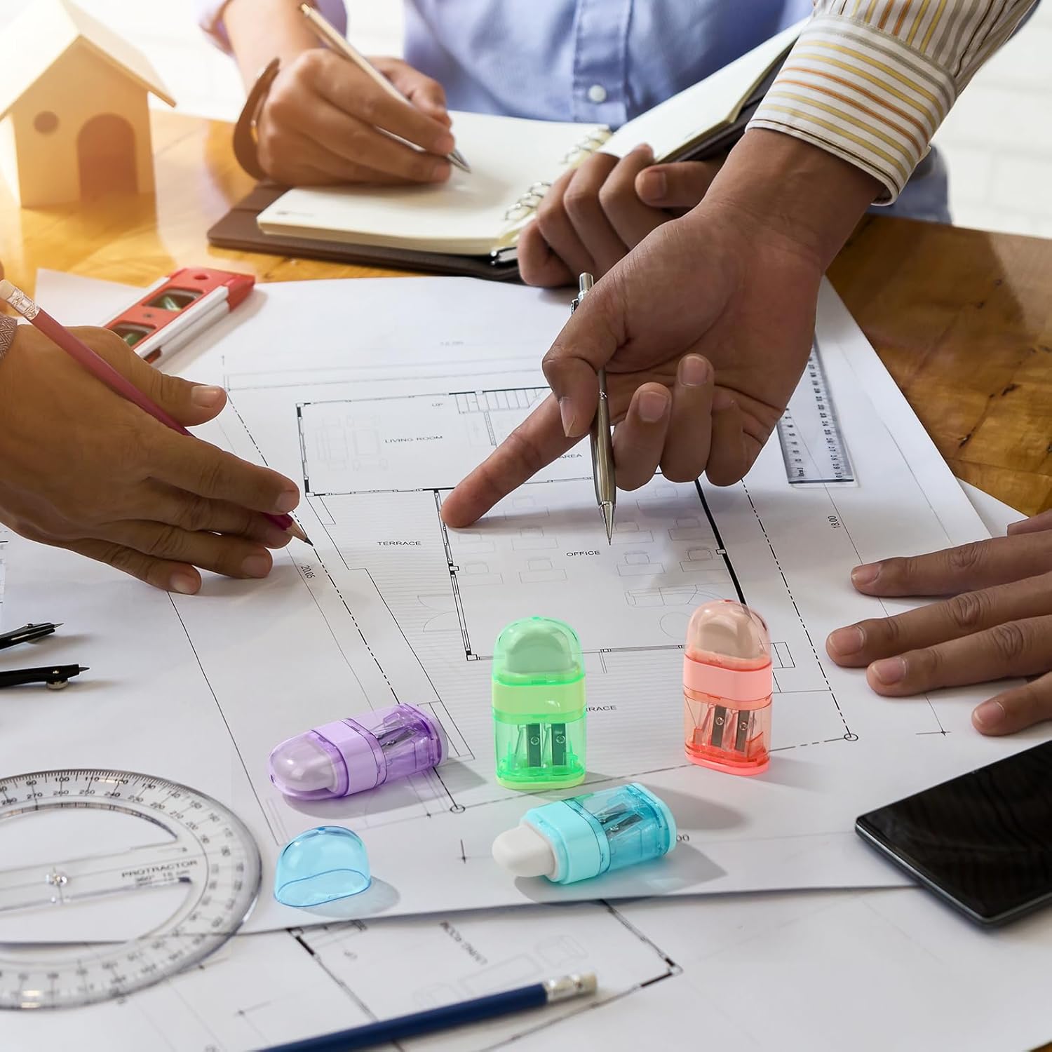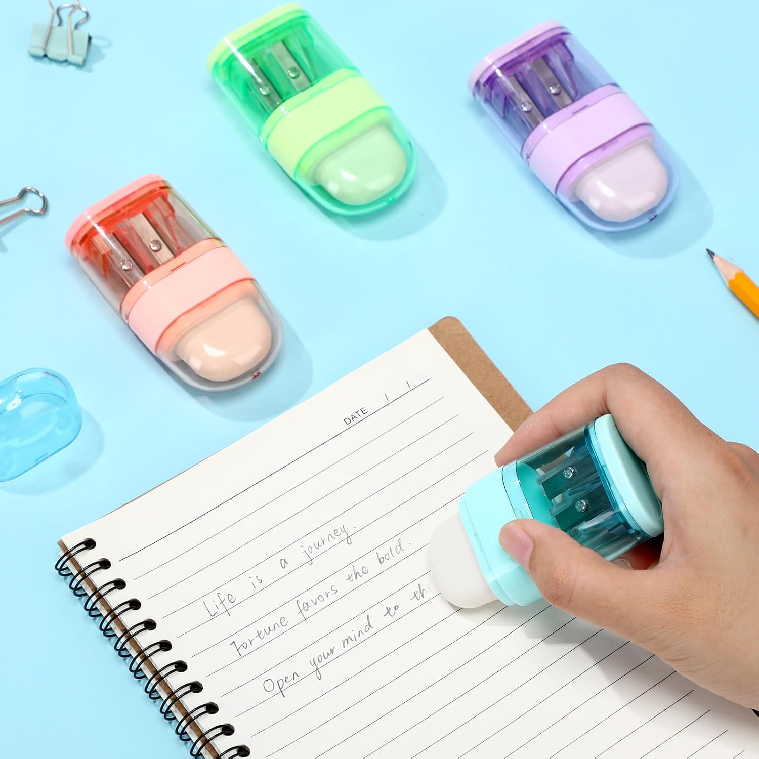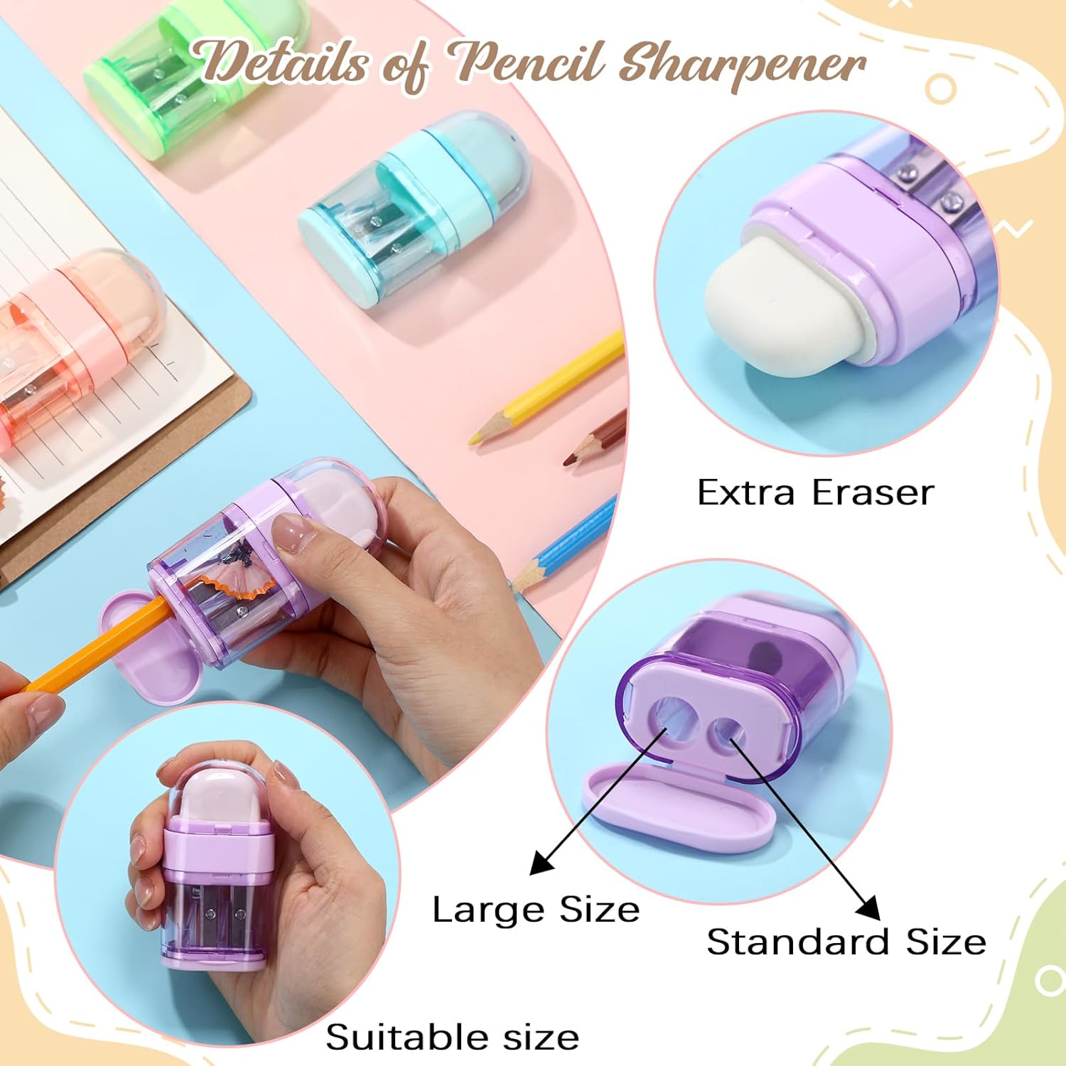 Design unico 2 in 1: questo temperamatite manuale a doppio foro è progettato con una combinazione di gomma, facile da usare e consente di risparmiare spazio per gli utenti; non è solo un temperamatite, ma viene anche fornito con una gomma sull'altra estremità, che può pulire i segni della matita in modo pulito Creativo e attraente: il temperamatite ha 4 diversi colori: verde, blu, arancione e viola, uno di ogni colore, per un totale di 4; i colori diversi e vivaci lo rendono più interessante e piacevole, e può essere facilmente messo nell'astuccio Design intelligente con copertura trasparente: il temperamatite viene fornito con una copertura e i trucioli di matita cadranno nel piccolo vano portaoggetti quando in uso; non c'è bisogno di preoccuparsi di rovinare la scrivania, è possibile mantenere la scrivania in ordine, ed è anche comodo svuotare la spazzatura dopo l'uso Materiale di qualità: il temperamatite è realizzato in plastica resistente e leggera, mentre la lama interna è realizzata in metallo, che consente di tagliare rapidamente le matite senza danneggiarle, rendendolo un accessorio di cancelleria di lunga durata Ampi usi: questi temperamatite colorati possono essere utilizzati non solo per affilare matite, pastelli e matite colorate, ma anche come incentivi per un buon comportamento o divertenti aggiunte alle scatole premio in classe, rendendo l'apprendimento emozionante e divertente