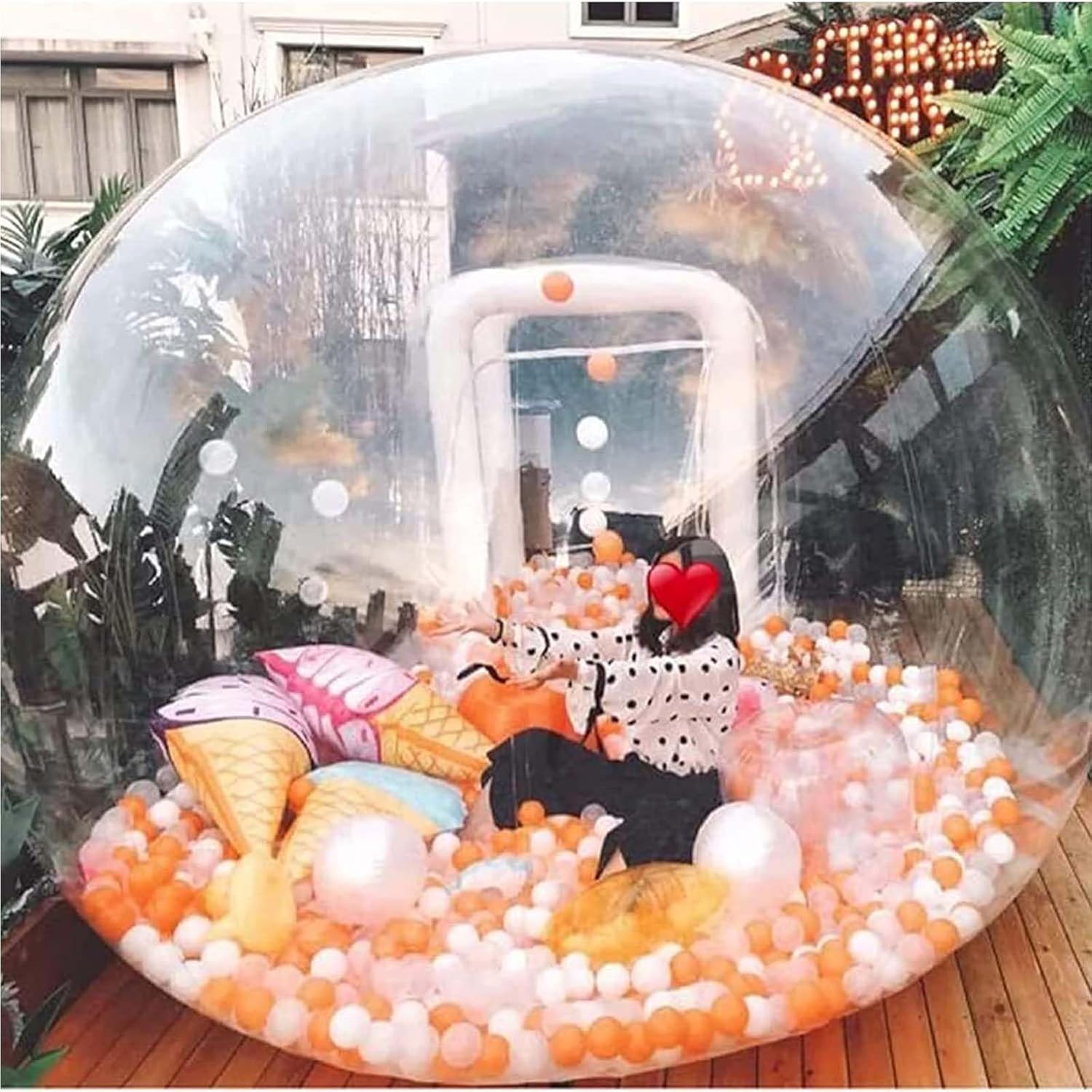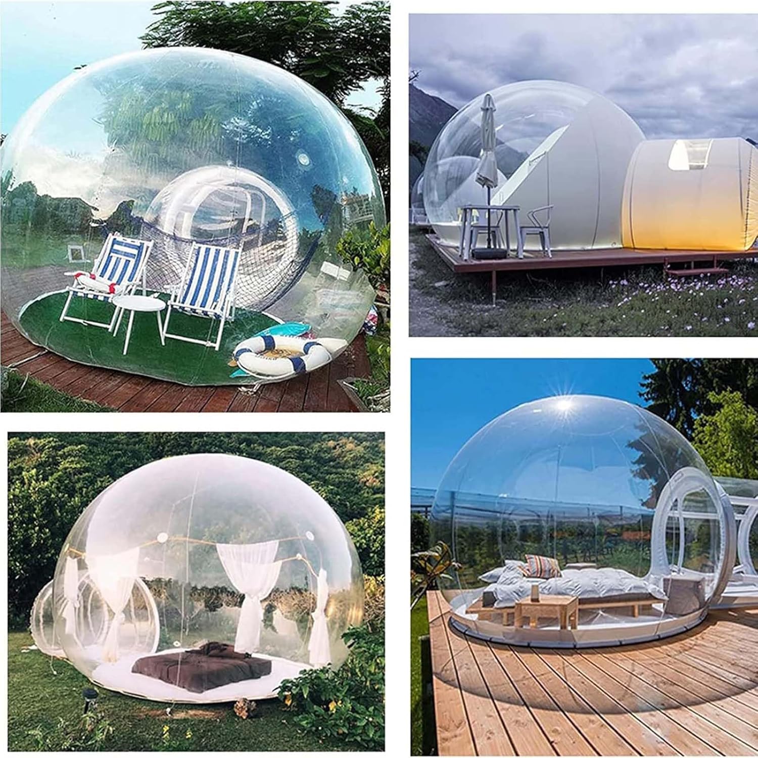 Tenda a bolle gonfiabile: questa tenda a bolle non richiede un assemblaggio complicato. Facile da pulire e trasportare, i fori di gonfiaggio sul lato della tenda a bolle possono essere gonfiati e sgonfiati in breve tempo. Una villa unica sarà presto costruita per te. Tenda a bolle trasparente gonfiabile a 360°: questa tenda a bolle è realizzata in PVC trasparente di alta qualità spesso 0,8 mm, alla moda e innovativo, adatto per il campeggio all'aperto. Goditi il campeggio all'aperto personalizzato, la stessa vita, un'esperienza diversa! Facile da gonfiare e sgonfiare: la casa delle bolle gonfiabile è dotata di un ventilatore d'aria e di una pompa d'aria elettrica. Non è richiesto alcun assemblaggio complicato. Grazie allo speciale principio di funzionamento di questa tenda gonfiabile, è possibile mantenere il ventilatore a una pressione dell'aria costante dopo 10 minuti di gonfiaggio della tenda per mantenere lo stato di bolla della casa delle bolle. Gazebo di lusso per serra: in estate puoi scattare splendide foto da questa tenda. Le tende trasparenti riflettono una luce meravigliosa. Solo quando vedi chiaramente puoi raggiungere la bellezza. Trasforma il tuo giardino o portalo con te al tuo prossimo festival musicale o in campeggio. Soddisfazione garantita: se non sei soddisfatto del tuo acquisto, contatta immediatamente il nostro servizio clienti. saremo felici di risolvere qualsiasi problema per te entro 24 ore, la tua soddisfazione è il nostro obiettivo.