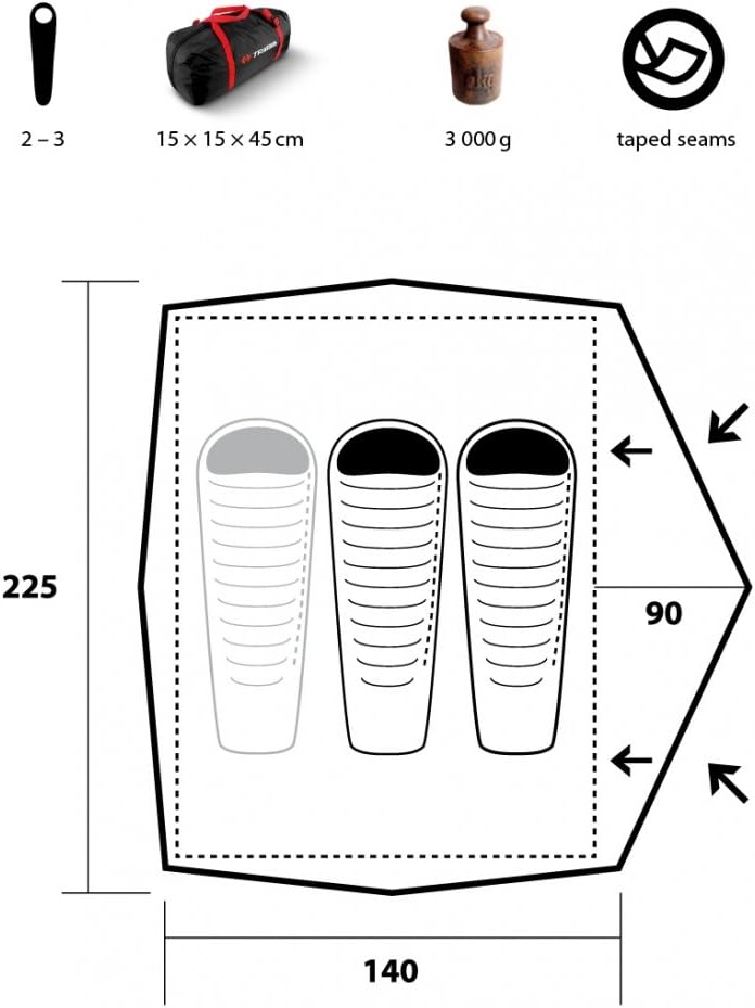 Esterno: 100% poliestere, 4000 mm H2O Pile: 100% nylon - Altezza: 10000 mm Costruzione: Durawrap, 8,5 mm. Interno: 100% PES permeabile WR 2-3 persone.