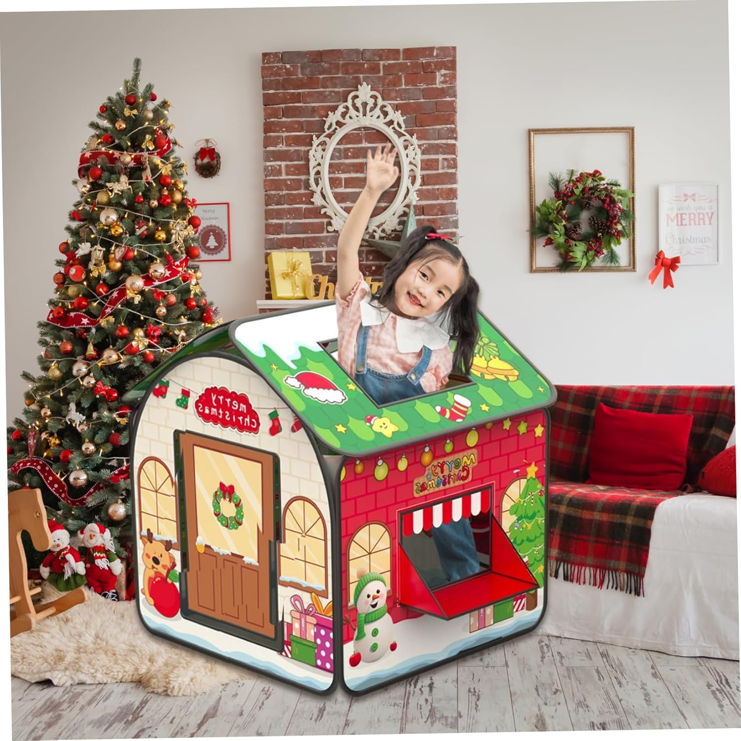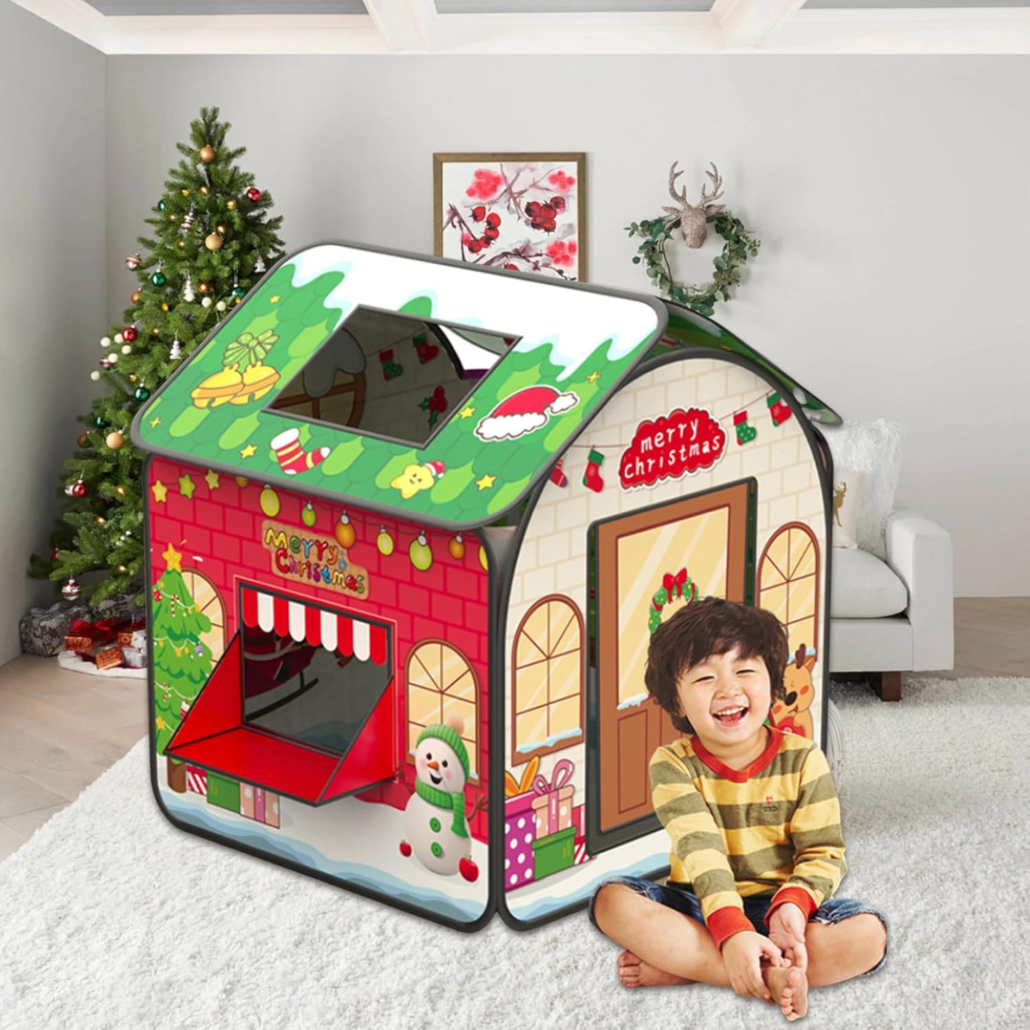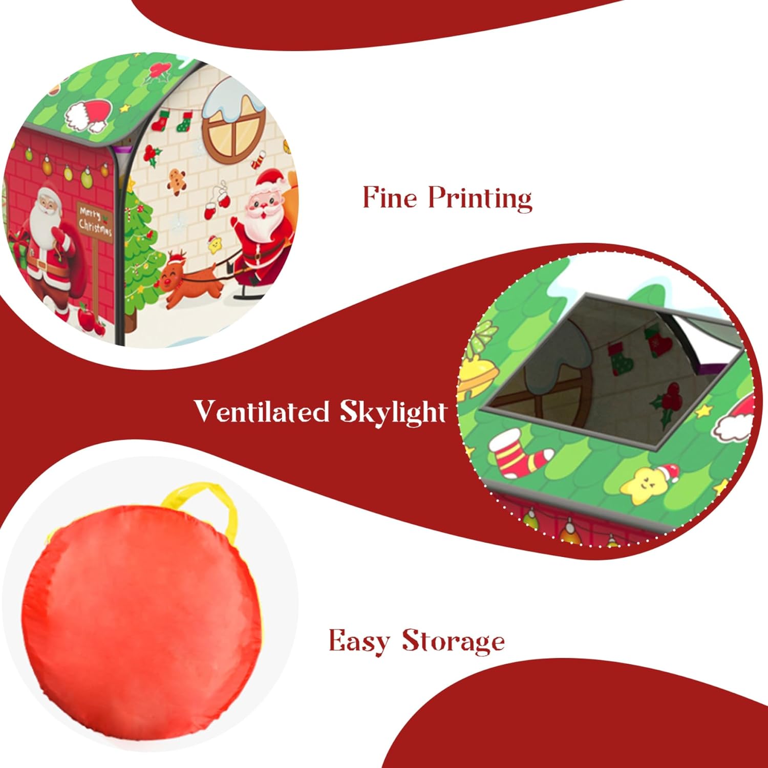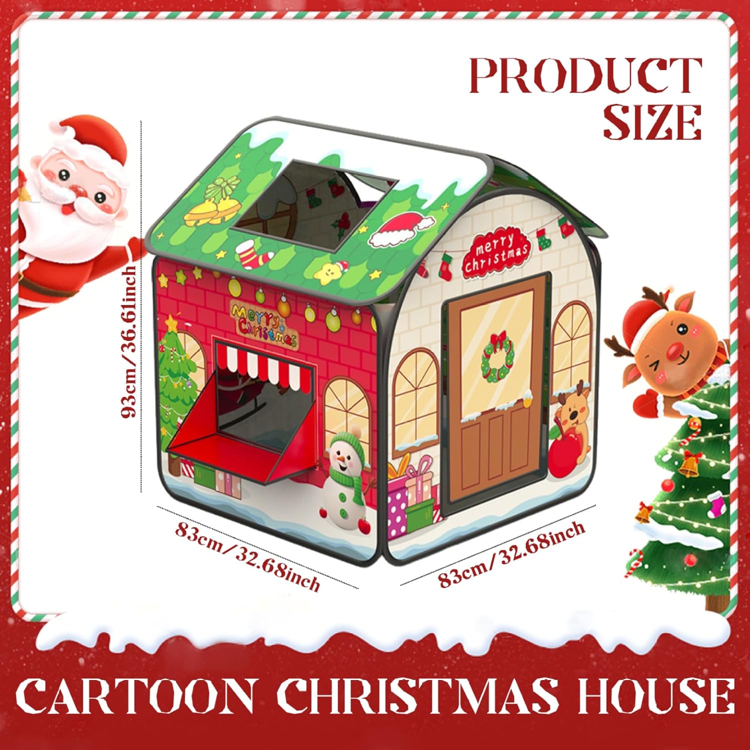 Divertimento festivo: questa tenda per bambini a tema natalizio presenta un design delizioso con Babbo Natale, che la rende perfetta per il gioco festivo..Le finestre aumentano il divertimento, rendendolo un'ottima aggiunta a qualsiasi celebrazione di Natale o festa di compleanno. Spaziosa area giochi: misura 83x83x93 cm (32,68x32,68x36,61 pollici), questa tenda da gioco per bambini offre ampio spazio affinché i più piccoli possano impegnarsi in giochi fantasiosi..Le sue dimensioni generose permettono ai bambini di esplorare e giocare comodamente. Perfetto come regalo: questa tenda da gioco a tema natalizio è un regalo eccellente per i bambini..Il suo design accattivante e le caratteristiche pratiche lo rendono la scelta ideale per regali di festa, compleanni o qualsiasi occasione speciale. Sicura e robusta: realizzata in tessuto morbido, questa casetta per bambini offre un ambiente accogliente e sicuro per i bambini dai 6 mesi in su..Il materiale è resistente e garantisce che possa gestire il gioco regolare mantenendo il suo aspetto vibrante. Facile installazione e conservazione: progettata per comodità, questa casetta può essere installata facilmente senza attrezzi..Dopo il gioco, ripiega per riporlo facilmente e viene fornito con una borsa per il trasporto, che rende il trasporto un gioco da ragazzi.