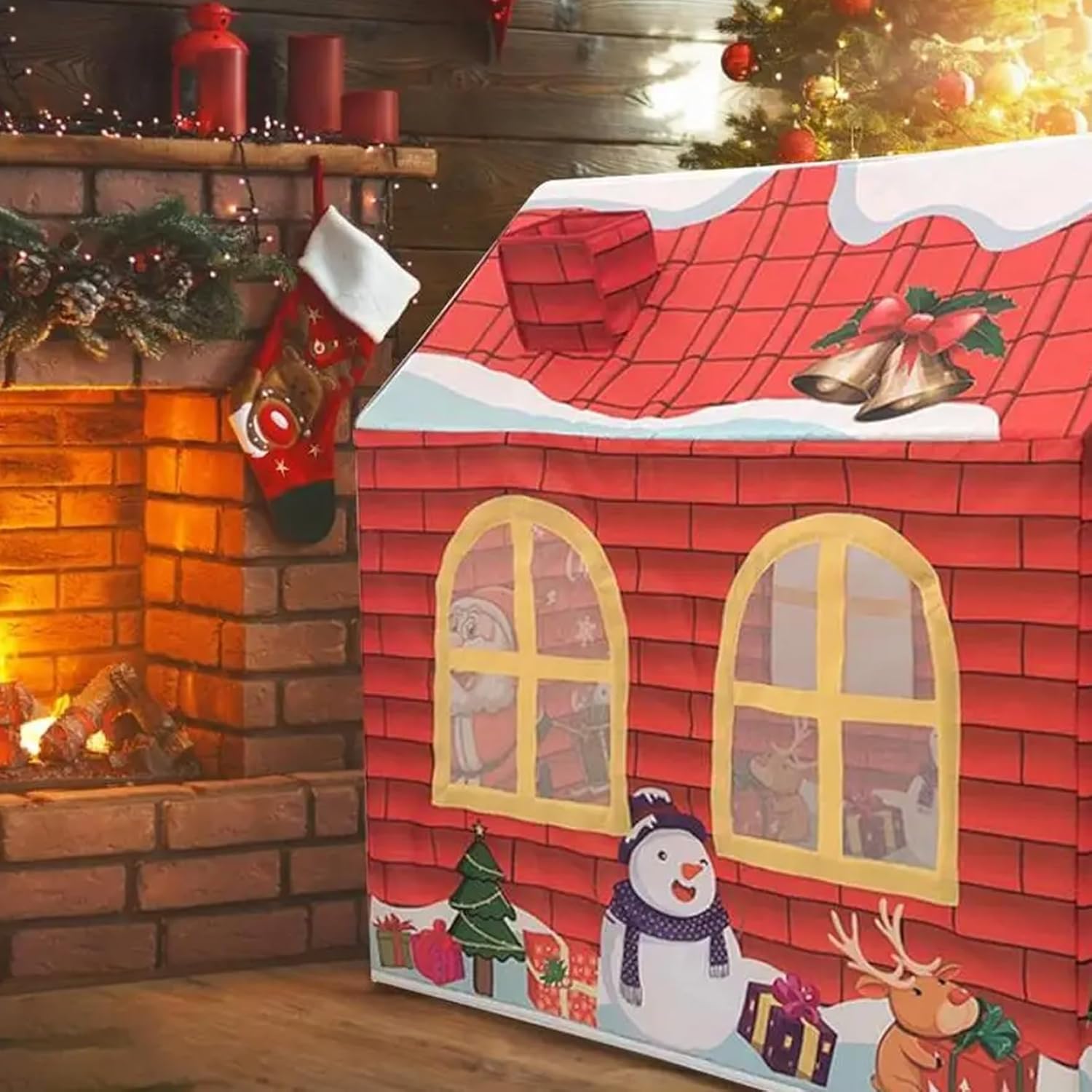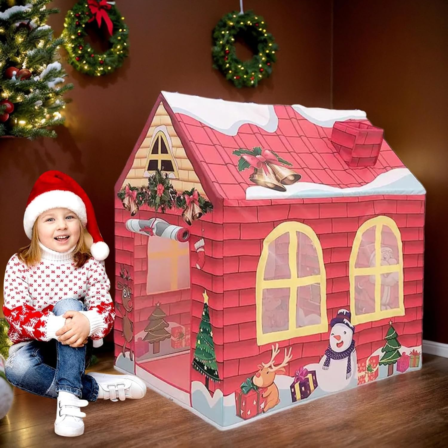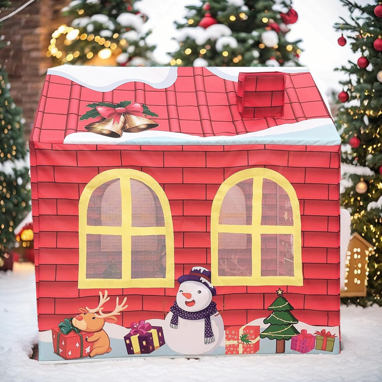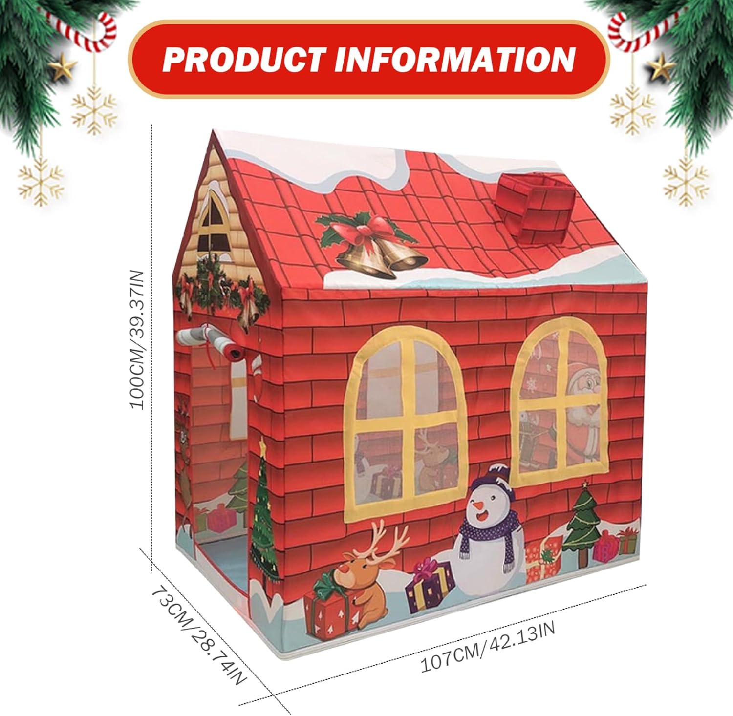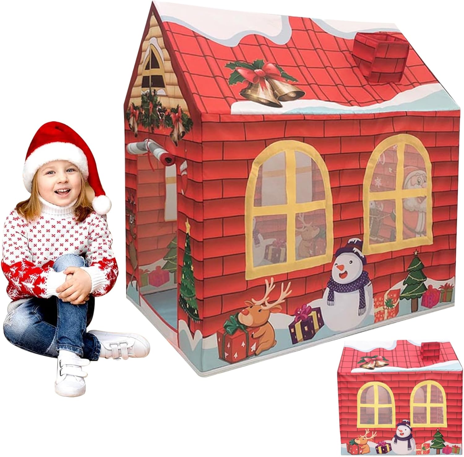Sicura e robusta: realizzata in tessuto Oxford, questa casetta per bambini è allo stesso tempo robusta e morbida, garantendo un ambiente di gioco sicuro e accogliente per i bambini di età superiore a 6 mesi..Il materiale è resistente e resiste al gioco regolare pur mantenendo il suo aspetto vibrante. Facile installazione e conservazione: progettata per comodità, questa casetta può essere installata facilmente senza la necessità di strumenti..Dopo il gioco, ripiega per riporlo facilmente e viene fornito con una borsa per il trasporto, che lo rende facile da trasportare e riporre. Spaziosa area giochi: misurando 42x29x47 pollici (107x73x120 cm), questa tenda da gioco per bambini offre ampio spazio affinché i più piccoli possano divertirsi con un gioco fantasioso..Le sue dimensioni generose consentono ai bambini molto spazio per esplorare e giocare comodamente. Perfetto come regalo: questa tenda da gioco a tema natalizio è un regalo delizioso per i bambini..Il suo design accattivante e le sue caratteristiche pratiche lo rendono una scelta eccellente per regali di festa, compleanni o qualsiasi occasione speciale. Divertimento estivo: questa tenda per bambini a tema natalizio presenta un affascinante design a cartoni animati con colori vivaci, perfetta per il gioco durante le vacanze..Il design festivo, che include una porta avvolgibile e finestre a rete, lo rende un'aggiunta ideale a qualsiasi celebrazione di Natale o festa di compleanno.
