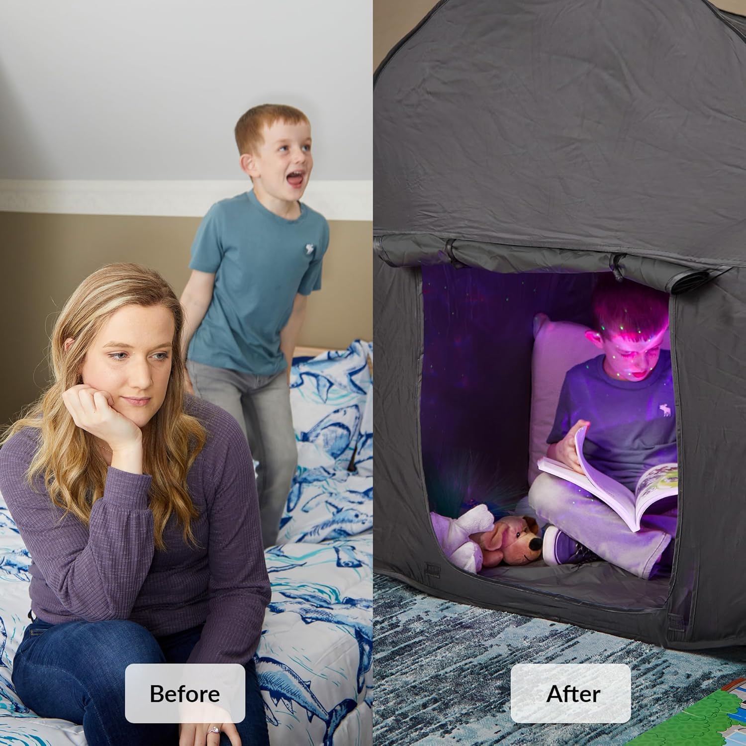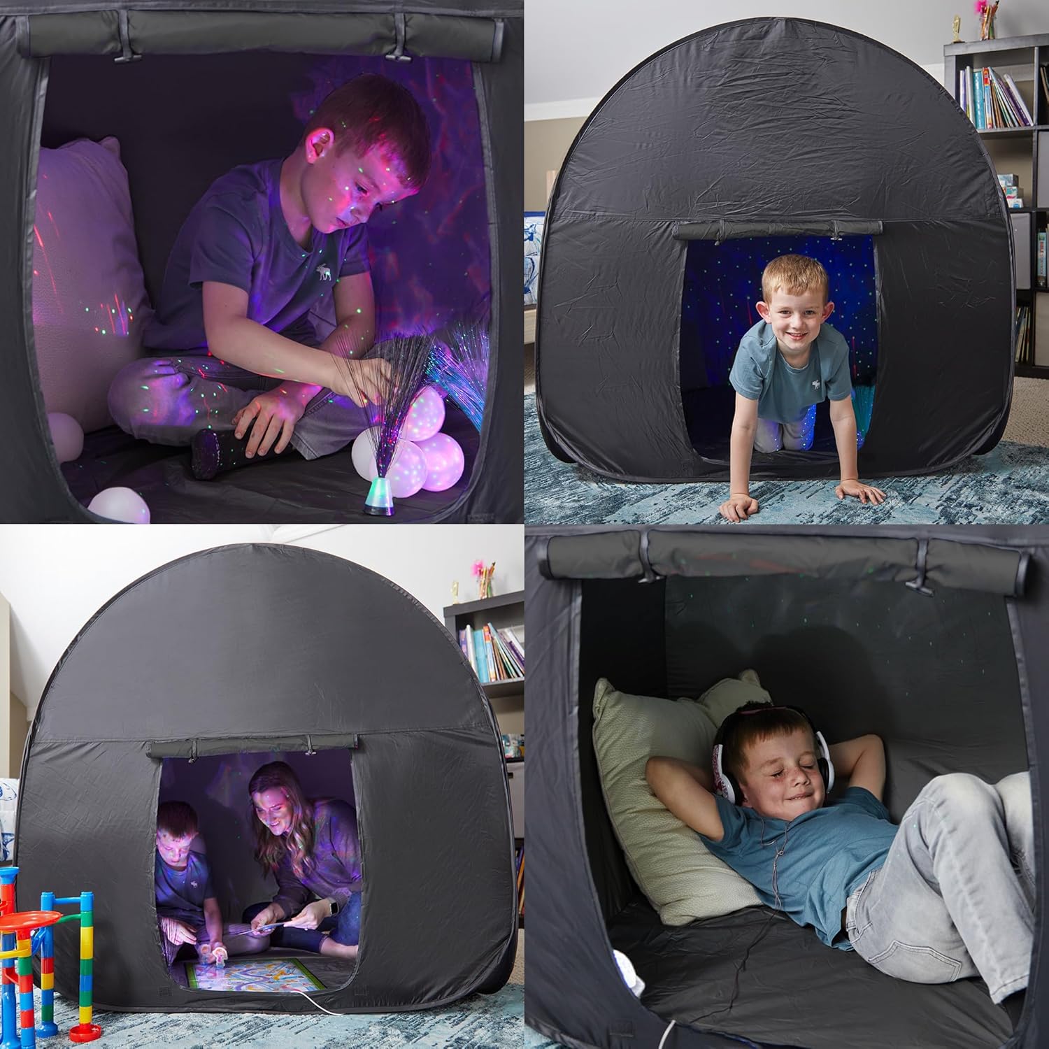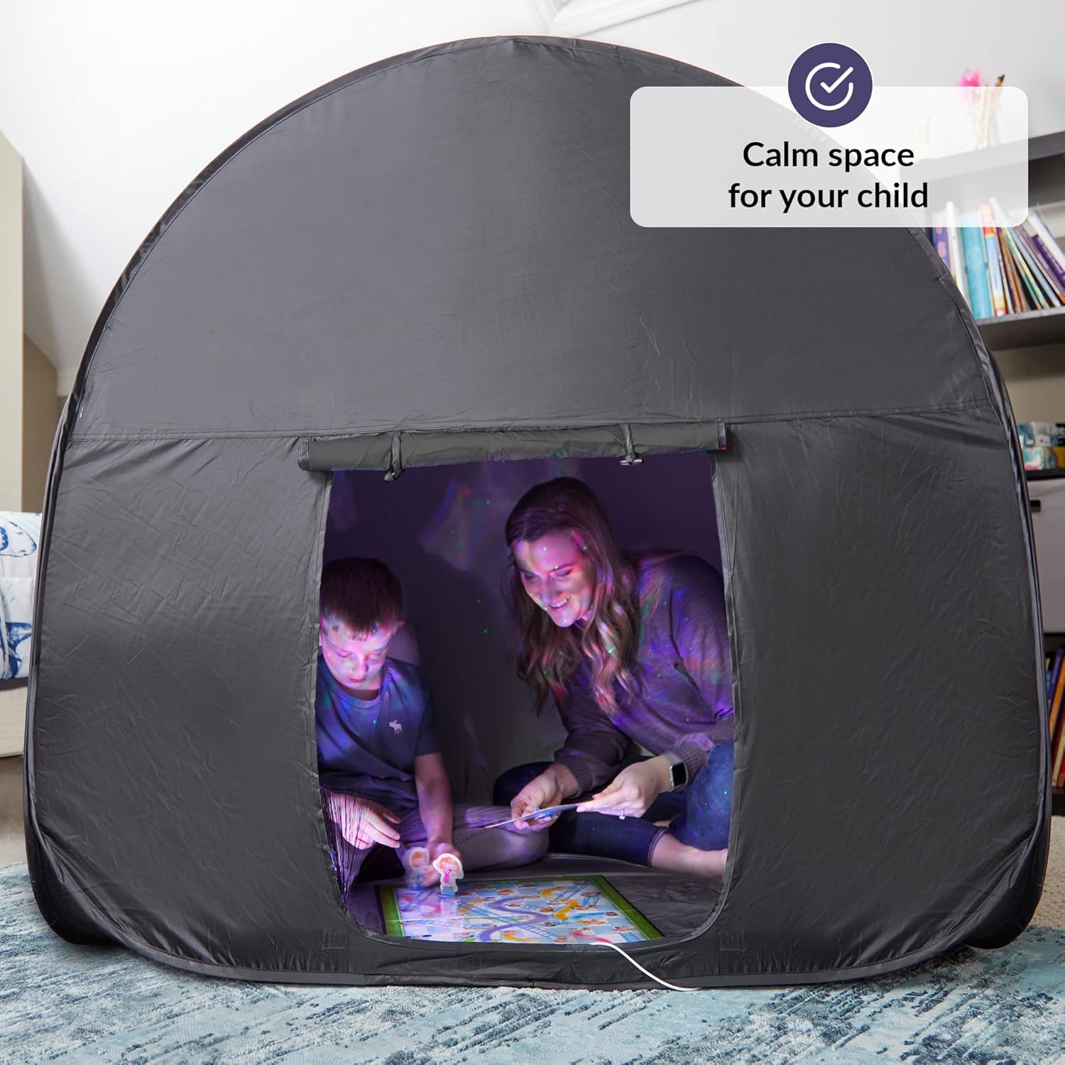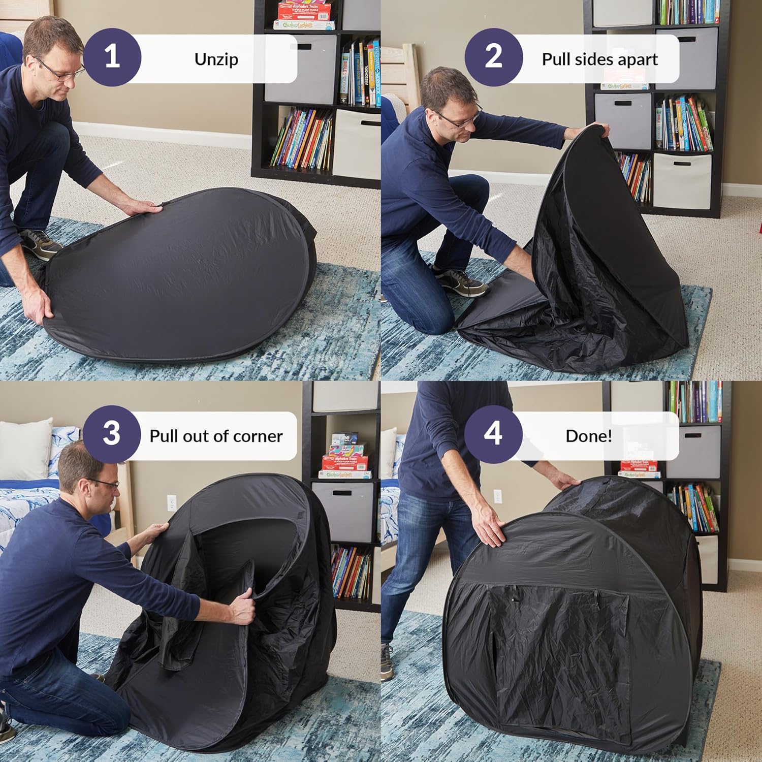 SPAZIO TRANQUILLO PER IL TUO BAMBINO – Costruisci un angolo sensoriale per il tuo bambino, dove può giocare e rifugiarsi dal trambusto della vita di tutti i giorni. Questa tenda tranquilla è perfetta per i bambini con bisogni speciali, che si lasciano facilmente sopraffare e che hanno bisogno di uno spazio sicuro dove rilassarsi a casa o a scuola. IDEALE PER VARIE PATOLOGIE – La tenda sensoriale nera è fatta per gli interni e offre un ambiente calmante e buio, anche durante il giorno. Questo angolino tranquillo è ideale per i bambini con SPD, ansia, autismo o problemi di concentrazione. Lascia che i tuoi bambini si rilassino e si godano questo spazio pacifico mentre la giornata scorre frenetica attorno a loro. COSTRUISCI UNA STANZA SENSORIALE – Grazie all’effetto blackout, questa tana sensoriale è perfetta per i giochi di luce. I bambini possono trasformarla nella loro navicella dei sogni usando luci ultraviolette, proiettori, lampade lava e altri giocattoli luminosi. Arreda la tenda con gli oggetti che rassicurano il tuo bambino, come i suoi giocattoli preferiti, un cuscino e una coperta. MONTAGGIO ISTANTANEO – Monta la tenda in qualche secondo lanciandola e procura rapidamente un momento di rifugio al tuo bambino. La tenda grande da 120 cm fornisce lo spazio sufficiente per uno o due bambini, oppure per un bambino e un adulto. Quindi se vuoi rilassarti con il tuo bambino, potete stare entrambi in questa tana accogliente. LA QUALITÀ DI CUI TI PUOI FIDARE – Ci impegniamo per offrire i migliori prodotti e servizi a tutti i nostri clienti. Se, per qualunque motivo, non dovessi essere soddisfatto dei nostri prodotti non esitare a contattarci e noi saremo felici di rimborsare il tuo ordine, senza fare domande.