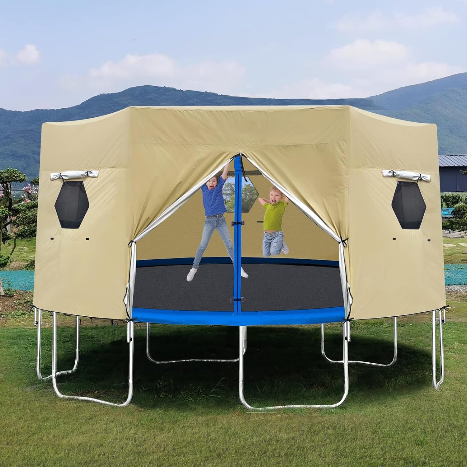 Grande facilità d'uso e di flusso: cerniera, dotato di rete esagonale su cinque lati e copertura impermeabile, fornisce un flusso d'aria bilanciato, traspirabilità e buona usabilità in tutte le condizioni atmosferiche Ombra e copertura antipioggia: Fornisce un mix di ombra, copertura antipioggia e uno spazio per attività divertenti arricchito da tessuto lavabile in lavatrice, comodità pieghevole per riporre e facile montaggio degli attrezzi per un divertimento versatile in famiglia Struttura di sicurezza per bambini: Con una struttura sicura per i bambini, meccanismi di protezione antiscivolo e una buona area di riposo all'interno della tenda trampolino per ore di divertimento sicuro, all'interno o all'esterno nel tenda con trampolino Migliore utilità di raccolta: questo trampolino fornisce un'ampia ombra, rendendolo ideale per riunioni di famiglia e una varietà di attività all'aperto, garantendo allo stesso tempo una programmazione flessibile per le interazioni genitore-figlio nei trampolini rotondi Durata per tutte le stagioni: il tessuto in poliestere a lunga durata garantisce sicurezza duratura con protezione UV e blocco dell'umidità per una copertura completa del telaio in condizioni di impermeabilità e antivento