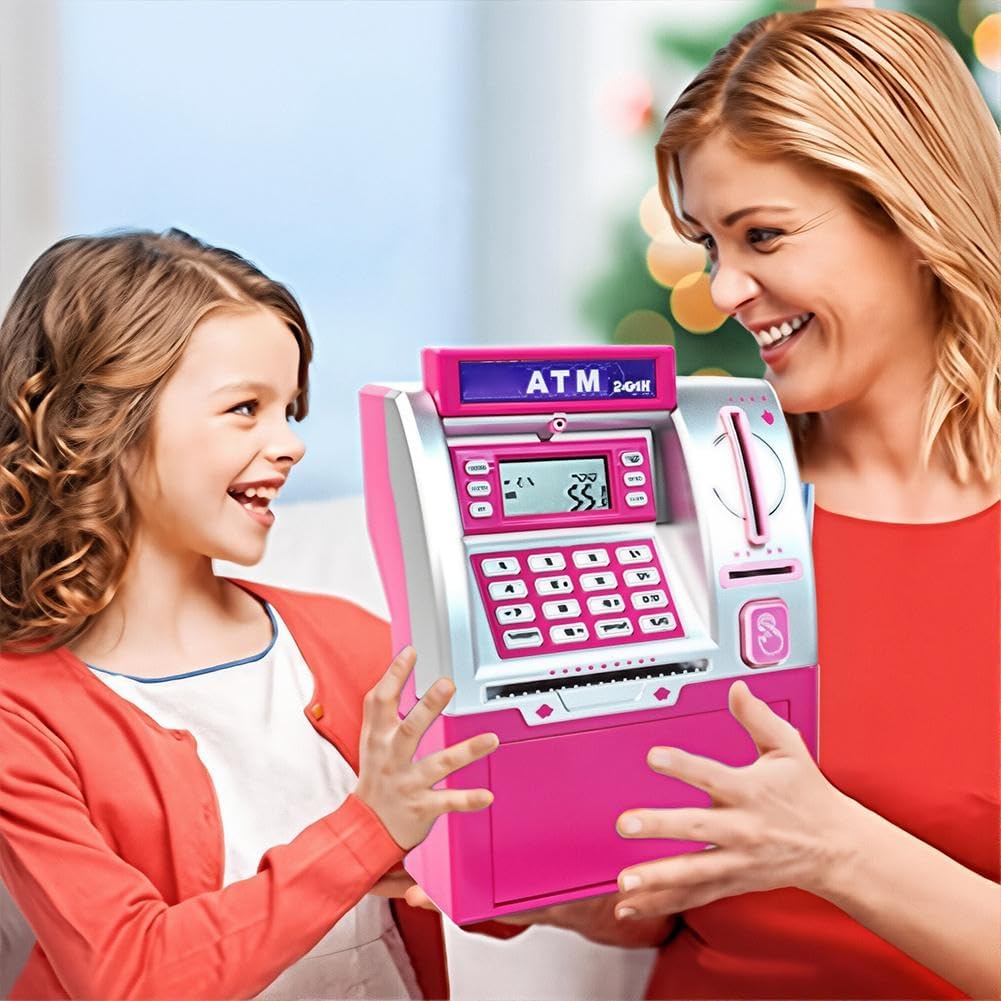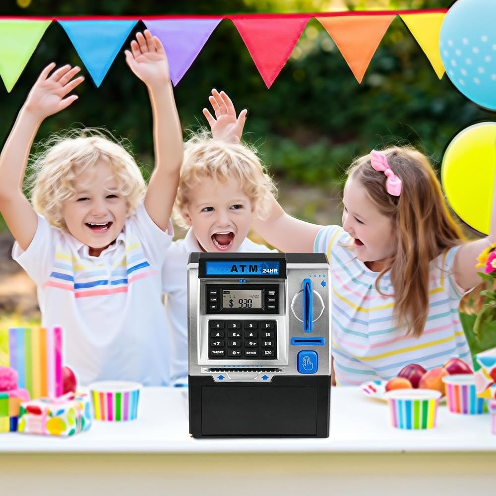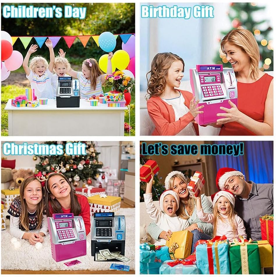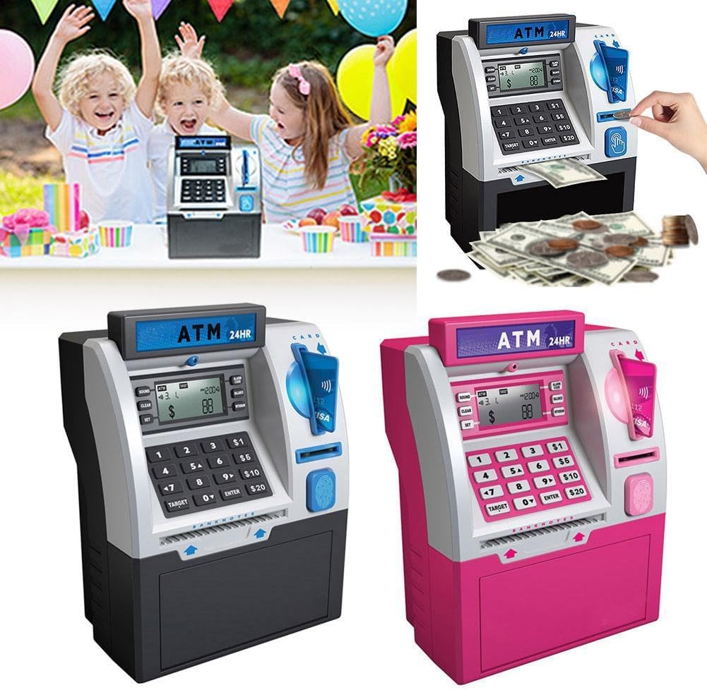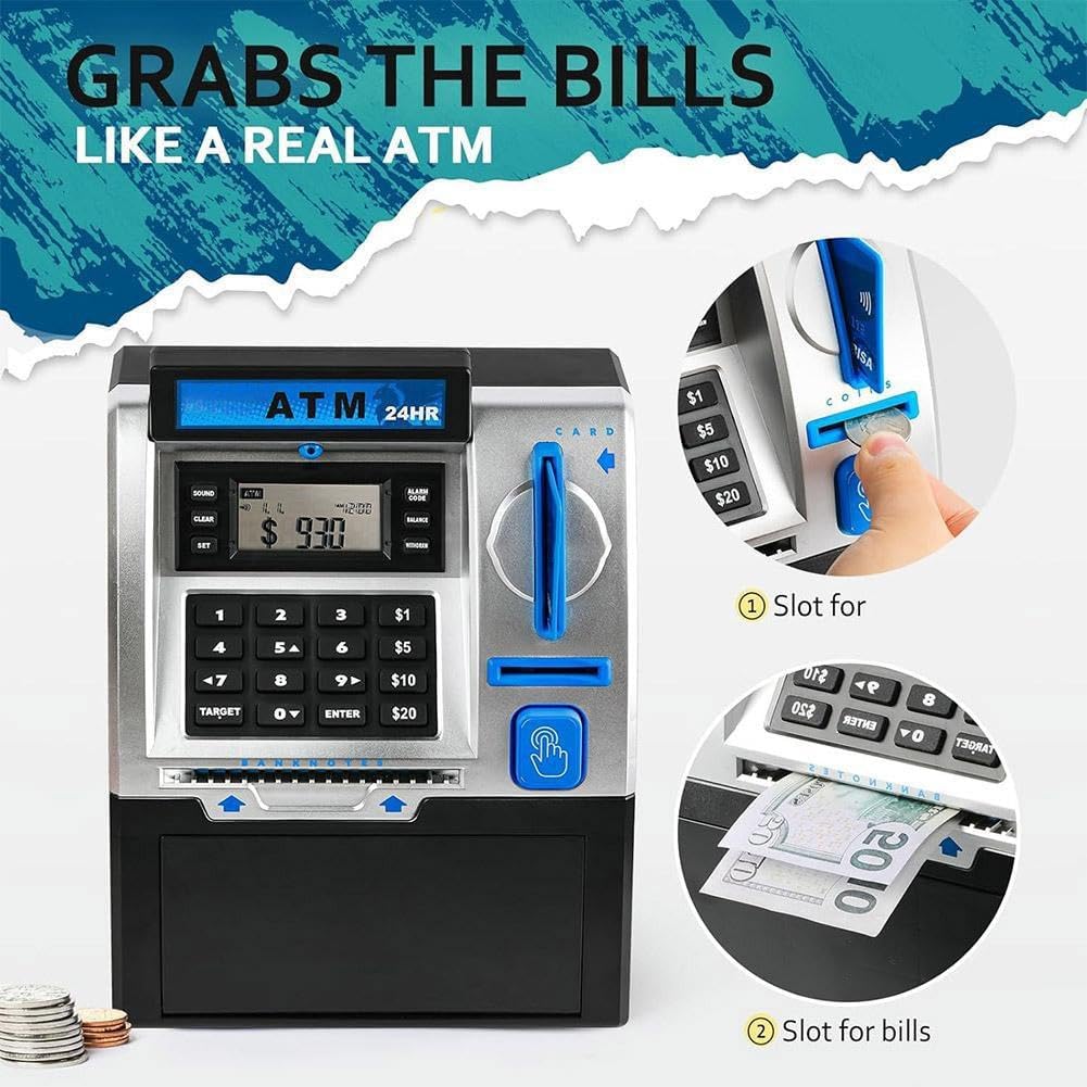 Esperienza interattiva ATM: porta a casa i servizi bancari con Smart ATM Piggy Bank, una mini cassa di risparmio interattiva che parla e interagisce. Questa cassa di risparmio elettronica presenta suoni autentici delle transazioni, luci lampeggianti, uno schermo digitale e una protezione con password, rendendo ogni deposito reale come una transazione presso una banca Doppio sistema di riconoscimento automatico: supporta depositi di monete e banconote. Dispone di riconoscimento automatico delle monete e funzionalità di aspirazione automatica delle bollette. Il saldo digitale viene aggiornato in tempo reale ad ogni deposito, eliminando la necessità di calcoli manuali Esperienza bancaria: il nostro salvadanaio è come un bancomat in grado di memorizzare denaro reale, permettendoti di sperimentare operazioni bancarie reali non solo favorirà la consapevolezza finanziaria, ma li aiuterà anche a imparare ad accumulare i propri risparmi Rotoli automatici: premere il tasto "Deposito", inserire l'importo della banconota, quindi premere il tasto "Conferma", mettere la banconota sul rotolo e la banconota verrà automaticamente aspirata nella macchina Regalo educativo perfetto: che si tratti di compleanni, vacanze o premi di successo, questa mini cassa di risparmio bancomat rende l'alfabetizzazione finanziaria divertente e coinvolgente. Questa versatile cassa di risparmio bancomat è il regalo perfetto