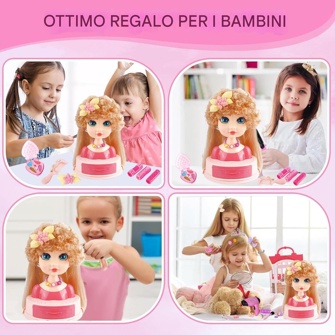 Opzioni Gioco Complete: 26 strumenti inclusi offrono esperienze di styling diversificate per bambini, favorendo l'apprendimento pratico e soddisfacendo le preferenze creative individuali durante il gioco con la testa per acconciature Materiale Eccezionale: Testa per capelli realizzata con materiali di alta qualità, inodore e dalla superficie liscia, garantendo un'esperienza piacevole e sicura durante i giochi di acconciatura per bambini. Regalo : Progettato per ispirare la fantasia, questa testa di bambola è un regalo per compleanni o feste, incoraggiando il gioco interattivo e l'espressione artistica tramite l'acconciatura. Espressione Artistica: Favorisce la creatività dei bambini incoraggiando il divertimento interattivo con l'acconciatura, nutrendo le loro abilità manuali e sviluppando la passione per l'espressione creativa durante il gioco piacevole Gioco creativo capelli:Stimola lo styling immaginativo attraverso trecce, acconciature e decorazioni che danno vita al gioco del parrucchiere, promuovendo apprendimento pratico e creatività senza limiti durante le sessioni di hair play per giovani appassionati