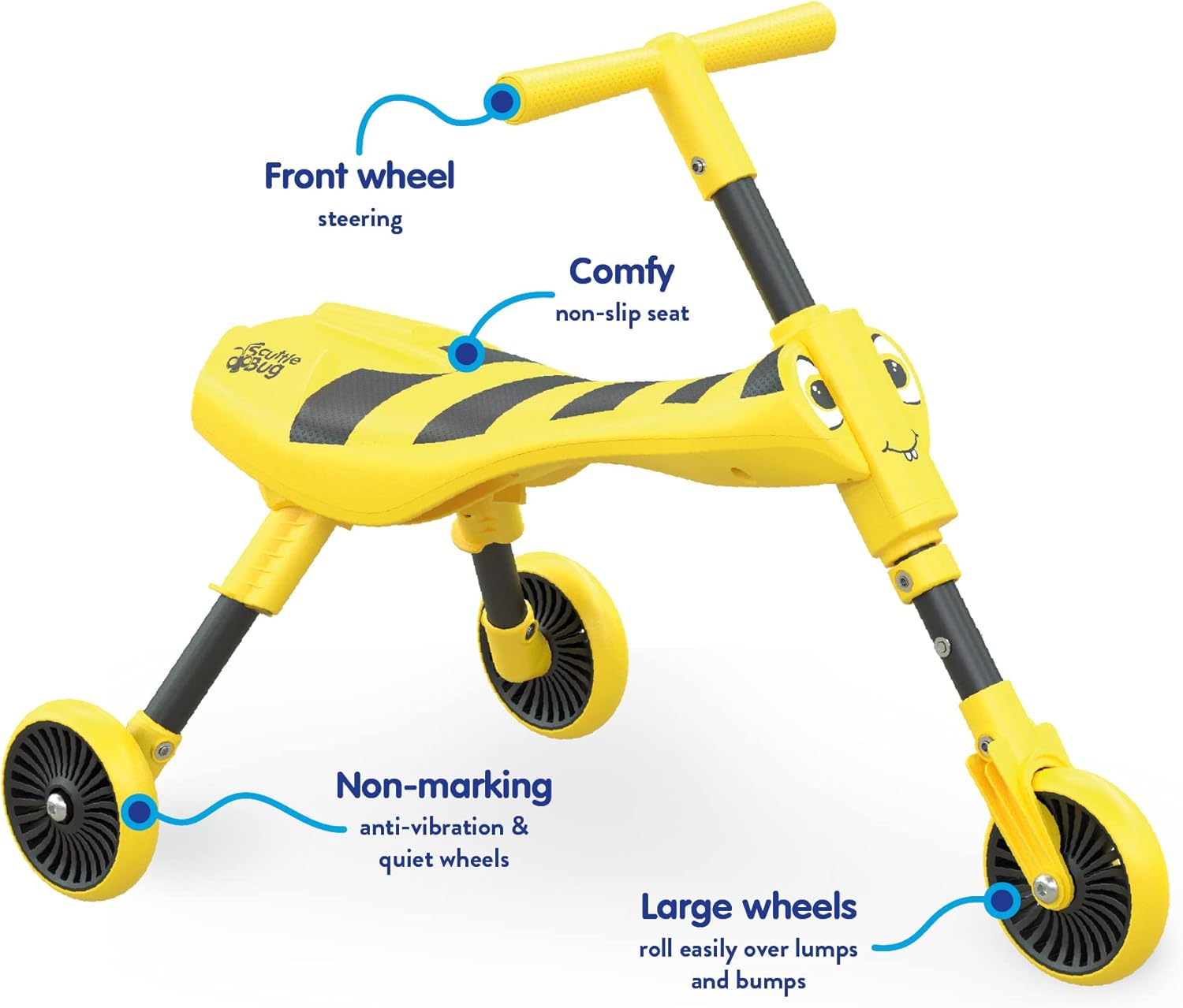 GIOCATTOLI PER LO SVILUPPO: Gli Scuttlebugs sono giocattoli per bambini progettati per aiutare i bambini a sviluppare l'equilibrio e le capacità motorie imparando a spingere, girare un manubrio e coordinarsi. Questo triciclo è un ottimo modo per incoraggiare i tuoi bambini a impegnarsi in attività fisiche PROGETTATO PER ESSERE CONVENIENTE: è dotato di 3 ruote stabili, durevoli e resistenti ai graffi che non lasciano segni sulle superfici interne o esterne, ruote sterzanti per una migliore manovrabilità e un semplice sistema di piegatura a 3 clic per riporlo facilmente PROGETTATO PER LA SICUREZZA: questi cavalcabili sono sicuri, affidabili e robusti e richiedono un assemblaggio minimo. Sono adatti a bambini di età superiore a 12 mesi e fino a 20 kg. Da utilizzare sotto la diretta supervisione di un adulto e con dispositivi di protezione. Non utilizzare in aree trafficate. REGALO PERFETTO PER I BAMBINI PIÙ PICCOLI: Questi giocattoli da cavalcare sono ideali come primi cavalcabili, giocattoli da esterno o regali di compleanno per un bambino o una bambina di un anno. Aiutano il tuo bambino a scoprire nuovi modi per stimolare il suo equilibrio e le sue capacità motorie