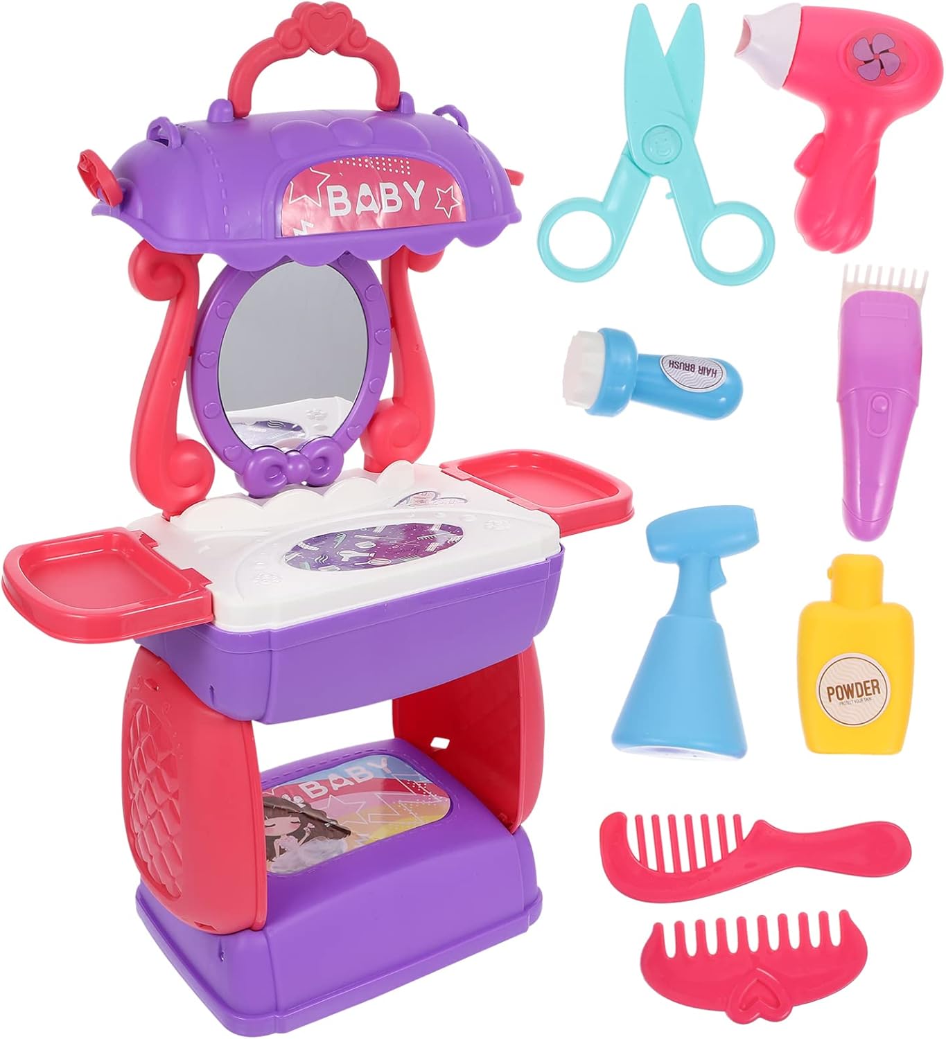 Il salone di bellezza nel famoso stile rosa di Barbie incanterà tutte le fan del fascino e dello stile Sedendo sul robusto sgabello e usando con amore pettine, spazzola, fermagli, mollette e lacca, non saranno solo i capelli delle bambole ad assumere velocemente un meraviglioso look Molte cose possono essere riposte negli scaffali girevoli e nel grazioso cassettone Truccarsi e travestirsi, oltre a essere divertente per i bambini, aiuta ad allenare le abilità motorie, l'immaginazione e la creatività Dimensioni: 54 cm x 23 cm x 82 cm; adatto per bambini dall'età di 3 anni