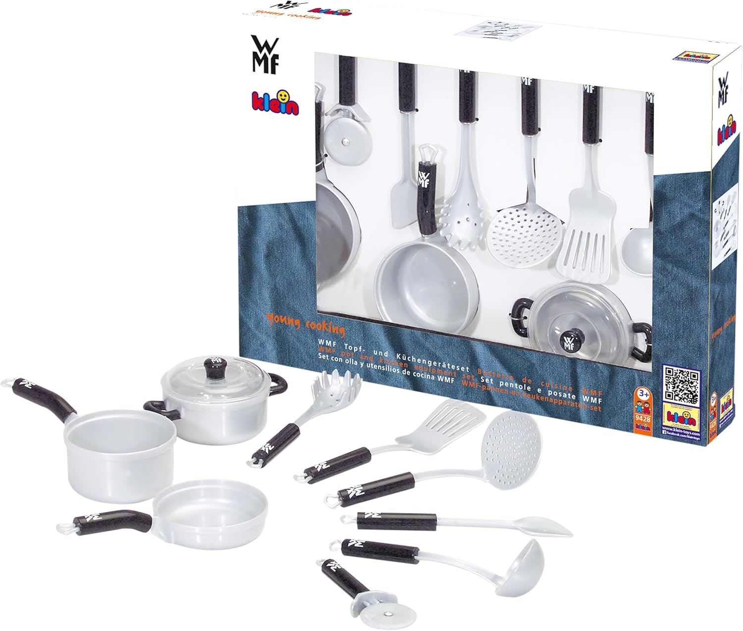 Grazie alla robusta padella, le due pentole, una delle quali con coperchio, potete allegramente friggere e cuocere la minestra sui fornelli da gioco Include anche posate giocattolo da cucina di alta qualità: Sono inclusi cucchiai da pasta e per miscelazione nonché un cucchiaio fessurato, un pratico cucchiaio da dolci e un tagliapizza Mescolare quel che bolle in pentola, preparare e rigirare le finte uova e patate fritte in padella non è solo divertente, ma allena anche le abilità motorie e la creatività Grazie alle sue dimensioni, l'alta qualità e la robustezza del prodotto, la cucina giocattolo è adatto per i bambini dai 3 anni in su