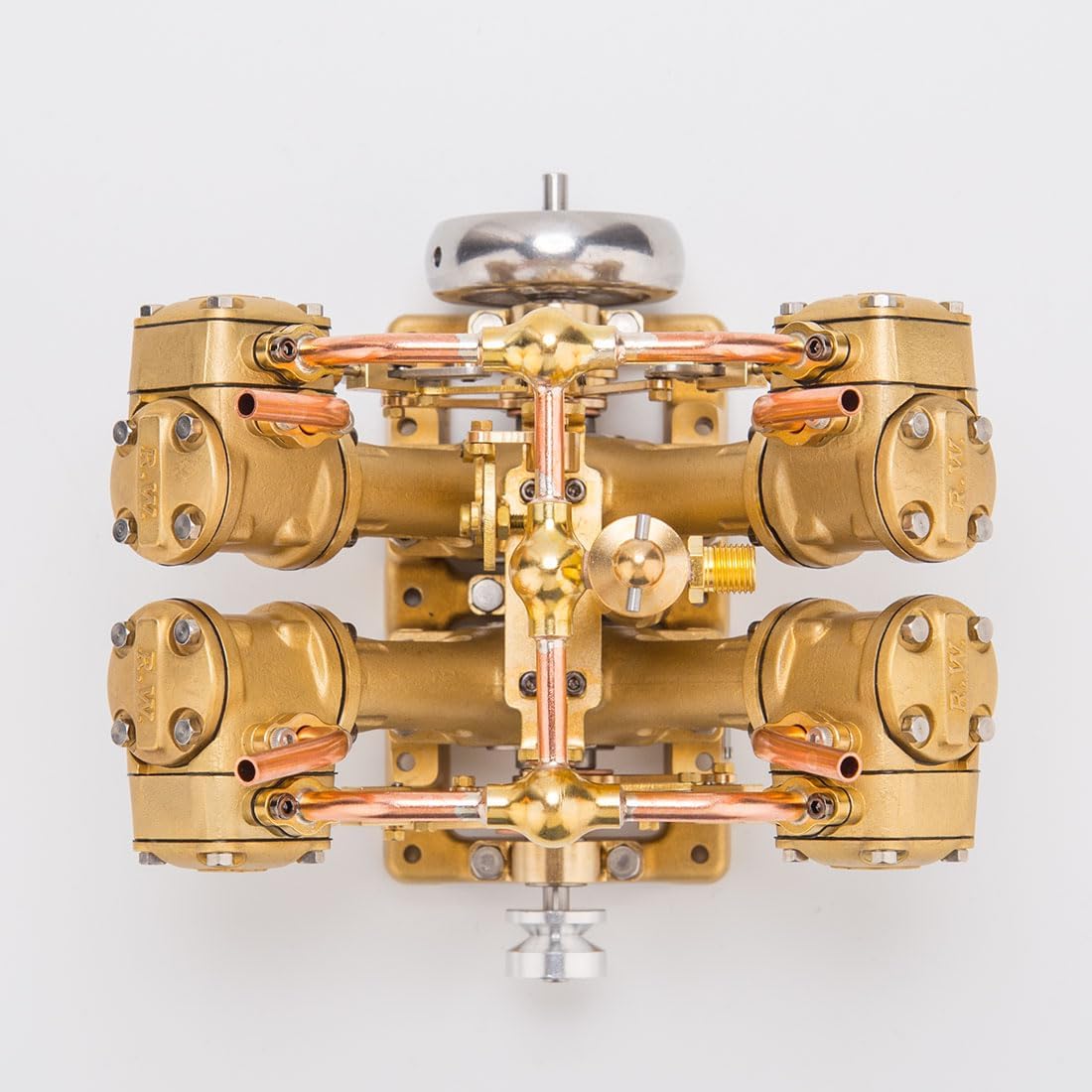 Innovativo design a 4 cilindri di tipo V: come modello di punta della serie RW, questo motore presenta un layout a 4 cilindri di precisione a V con banche a doppio cilindro su una trasmissione coassiale. Questo design raggiunge un eccellente equilibrio tra dimensioni e potenza, rendendolo ideale per navi a vapore compatte (90-150 cm), ingegneria di modelli di fascia alta o uso industriale in cui lo spazio e la produzione sono fondamentali. Ingegneria ad alta precisione con componenti aggiornati: a differenza dei modelli bicilindrici standard, questo motore è costruito con un bilanciere lavorato a CNC e presenta un cuscinetto a manicotto in ottone per l'albero di retromarcia, fornendo maggiore stabilità e longevità. Il corpo in ottone pressofuso, le maniche cilindriche in acciaio inossidabile e le parti finemente lavorate garantiscono prestazioni fluide, affidabili e di lunga durata anche in condizioni difficili. Coppia e prestazioni eccezionali: la configurazione V4 offre un'uscita potente con rotazione ultra fluida, simile a un motore elettrico. Offre una coppia superiore e una fluttuazione minima, rendendolo perfetto per modellini di navi su larga scala, sistemi meccanici guidati da precisione o dimostrazioni educative funzionali. Le sue prestazioni superano significativamente gli altri motori della sua categoria. Controllo avanti e indietro: l'ingranaggio della valvola Stephenson integrato consente una rotazione regolare in avanti e indietro. Questa flessibilità consente facili cambi direzionali, rendendolo adatto per configurazioni meccaniche complesse, modellini manovrabili e demo dinamiche. Ideale per gli utenti che richiedono una potenza del vapore versatile e reattiva. Meticolosamente costruita con garanzia di qualità: ogni unità è assemblata da tecnici qualificati e viene sottoposta a rigorosi controlli di qualità e test delle prestazioni prima della spedizione. Dalla selezione dei pezzi alla calibrazione finale, ogni dettaglio viene gestito con cura per offrire un motore di alta qualità che soddisfi le aspettative di costruttori professionisti, collezionisti ed educatori.
