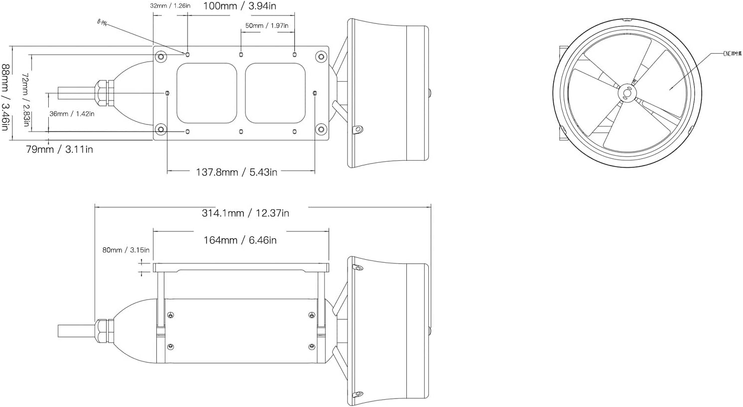 [azionamento integrato] dotato di un'unità integrata, il propulsore elimina la necessità di cablaggio di ESC esterno. Questo incorporato migliora la dissipazione del calore, garantendo stabile e prolungato prevenendo al contempo danni dal calore 'unità. [MACCHING CNC] L'alloggiamento del propulsore è lavorato e anodizzato CNC, fornendo finitura. Questa ingegneria garantisce che il propulsore mantenga un aspetto delicato e una lunga durata, anche in condizioni esigenti. [Propeller CNC] L' è meticolosamente realizzata utilizzando la tecnologia CNC, offrendo una forza dura e un eccellente equilibrio dinamico. L' migliora le prestazioni e l'efficienza del propulsore, garantendo in varie applicazioni marine. [Struttura sigillata] Progettato con un corpo completamente sigillato, questo propulsore subacqueo isola efficacemente il motore dall'acqua esterna. Il design protettivo prolunga la vita del motore ma rende anche il propulsore adatto all'uso in ambienti difficili come le acque reflue e l'acqua di mare. [Design leggero] Il propulsore presenta una copertura deflettore in nylon che riduce significativamente il suo peso complessivo. A differenza dei tradizionali deflettori di metallo, questa copertura in nylon è più leggera e fortemente per l'acqua di mare, garantendo la durata e la facilità di manipolazione.