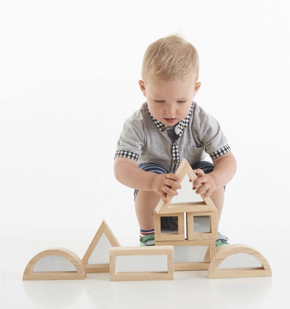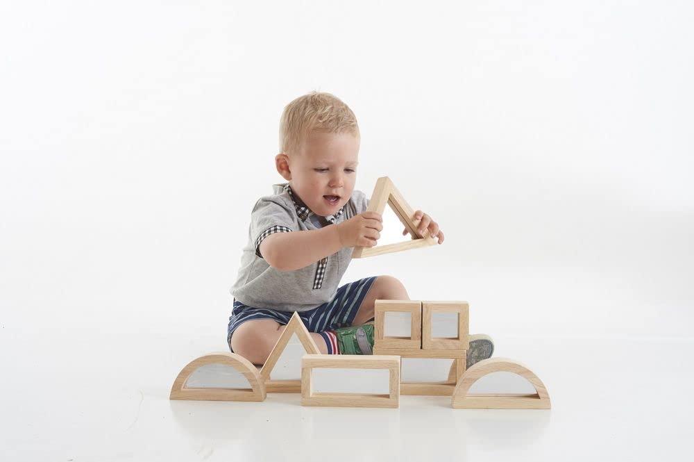 Il set comprende: 8 blocchi di legno di 4 forme diverse (quadrato, rettangolo, triangolo e semicerchio) con inserti a specchio in acrilico Dimensioni: rettangolo L 14 cm x L 7 cm x P 3 cm Età: adatto a partire da 12 mesi