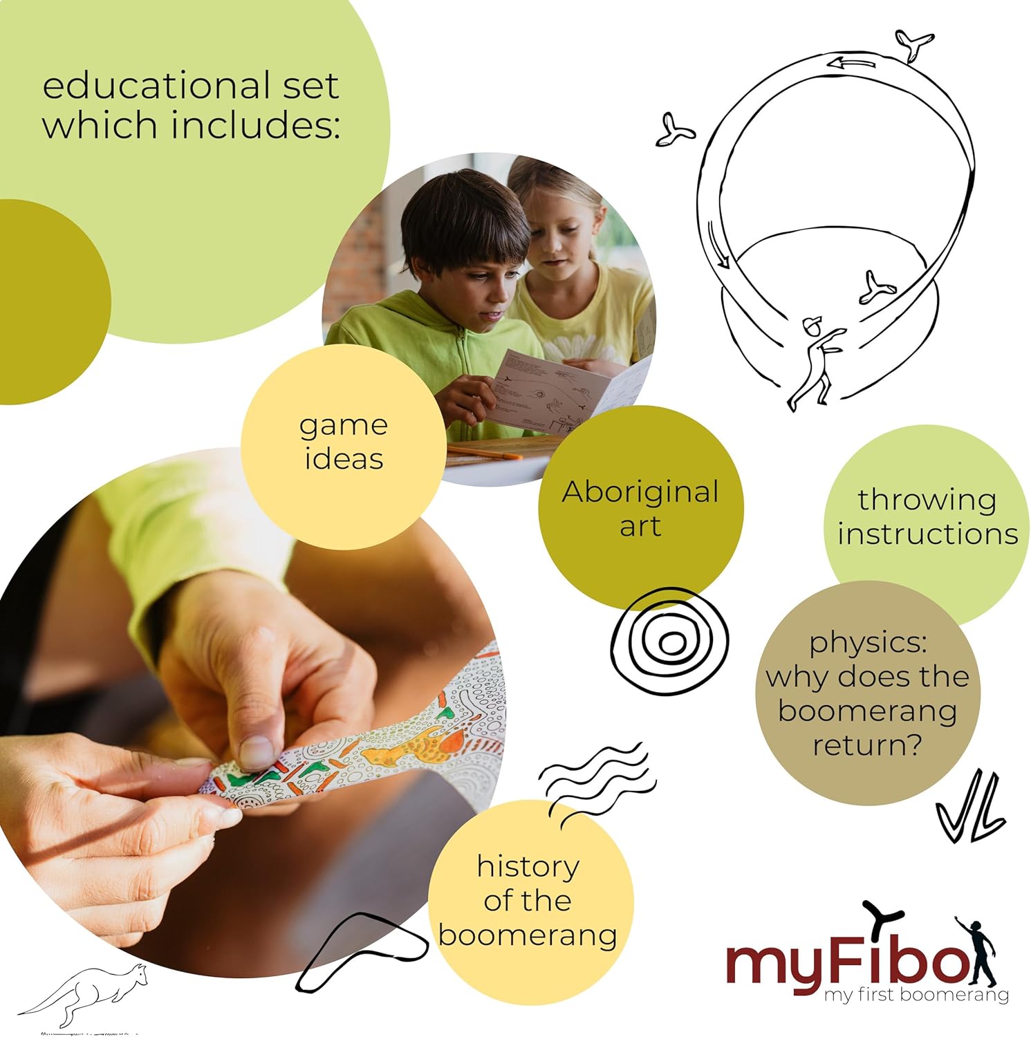 I bambini possono dipingere i loro boomerang e praticare il lancio. Le istruzioni del gioco sono disponibili sotto forma di modelli di copia A4, in modo che la storia e la fisicità del boomerang possano essere esplorate insieme 30 x boomerangs canguru per principianti (a partire da 6 anni). 1 x istruzioni (modello di copia A4)