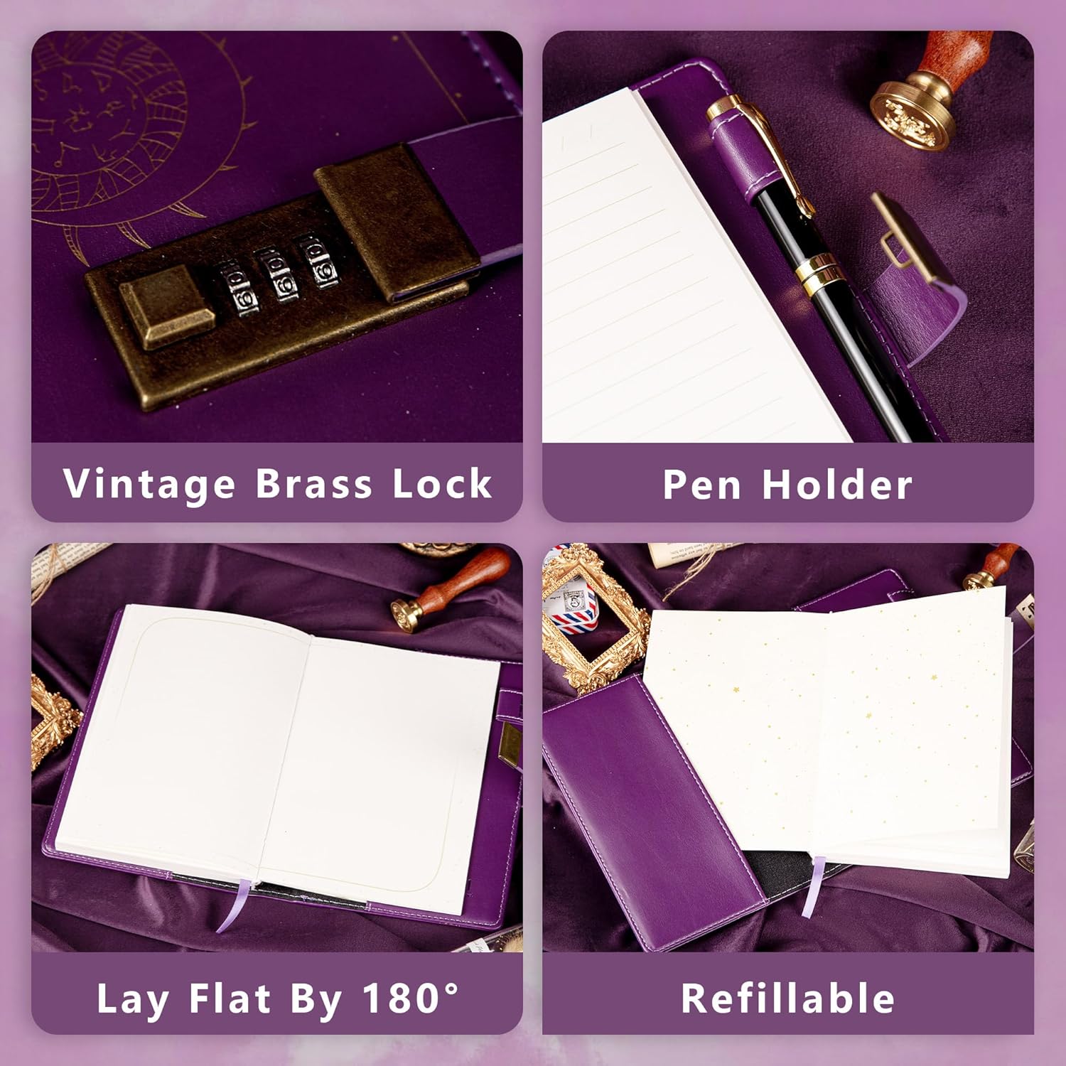 Diario con serratura: classico lucchetto a combinazione in metallo color bronzo, una combinazione di tre cifre da 0 a 9, migliaia di combinazioni di password. Ricorda di non dimenticare la password e di non dire ad altri di proteggere il tuo segreto. Inoltre, se hai dimenticato la password, segui le istruzioni per reimpostarla. Notebook in pelle: pregiata pelle che cambia colore, comoda e resistente all'usura. In diverse condizioni di illuminazione, il colore del riflesso della pelle sarà diverso, il che è normale. Design unico: il motivo artistico contiene il sole, la luna, le costellazioni, la stampa a caldo 3D sulla pelle ed è pieno di fascino retrò e alla moda. Questo diario in pelle come capsula del tempo per i tuoi pensieri registra i tuoi ricordi essenziali, i tuoi successi, i tuoi fallimenti. Carta ricaricabile: 112 fogli di carta a righe da 100 g/m²; la carta interna può essere facilmente riempita, la copertura in pelle può essere riutilizzata. Dimensioni portatile: 8×14 cm, peso 0,6 kg. Porta facilmente questo diario vintage nel tuo lavoro, apprendimento, viaggio. Regalo ideale: un diario è il tuo compagno ideale perché ti consente di esprimere i tuoi pensieri e sentimenti, fissare obiettivi e compiti mantenendo i tuoi pensieri privati. Perfetto per regali di Natale, Capodanno o compleanno. Ogni pianificatore viene fornito con le istruzioni. Se non apri o dimentichi il passcode, non esitare a contattarci, possiamo aiutarti a risolvere il problema.