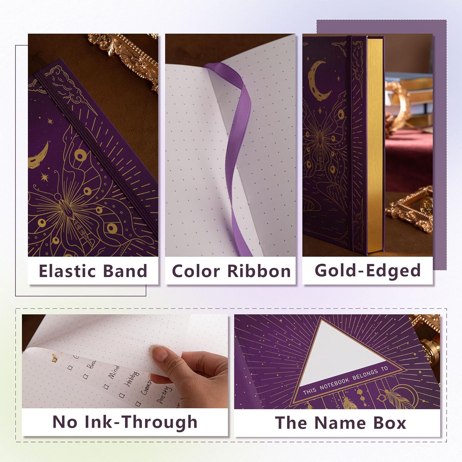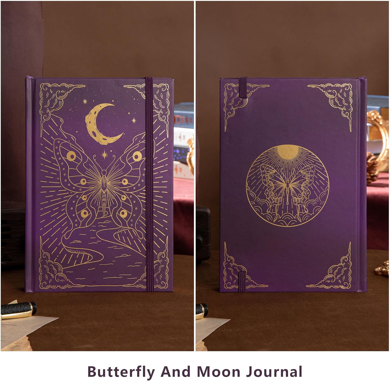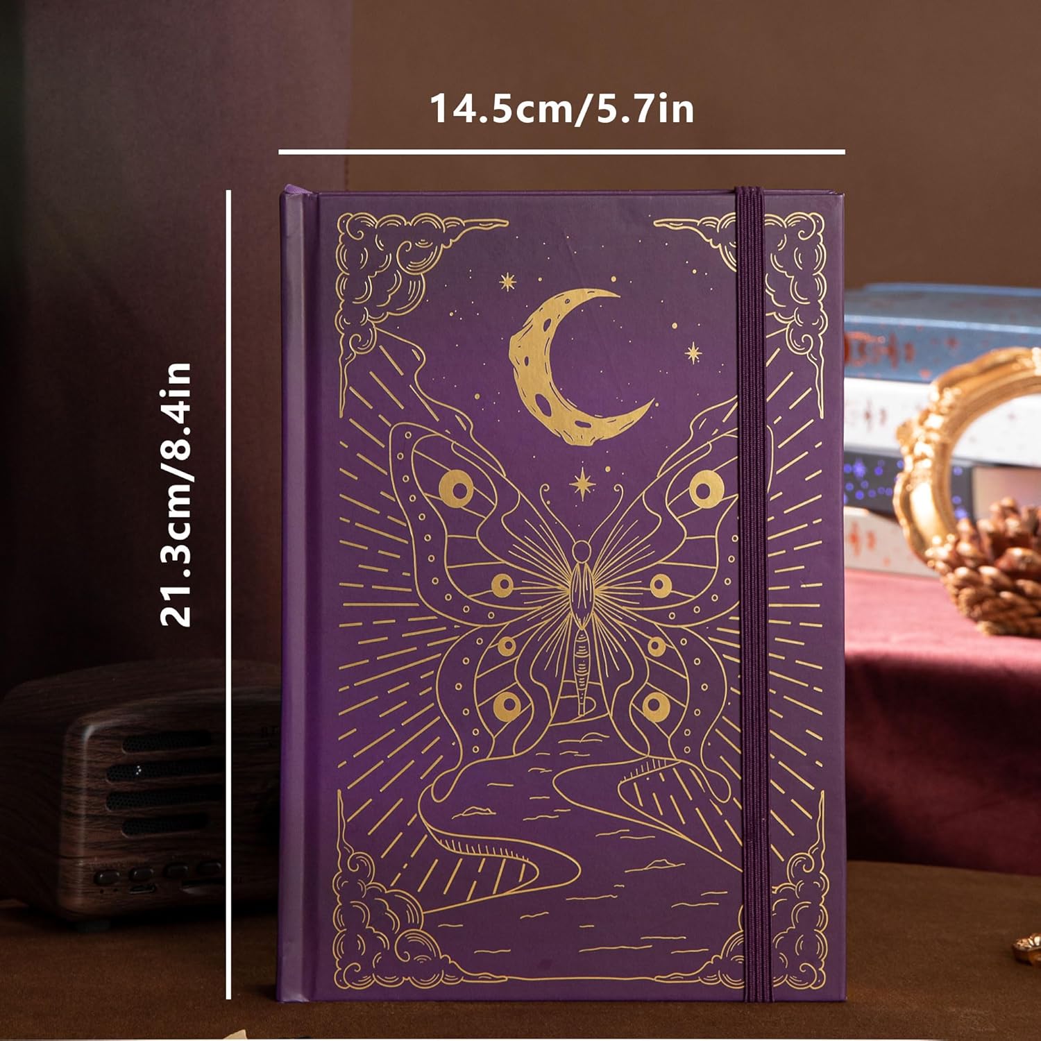 DIARIO PREMIUM DA 140 GMS: Immergiti nel mondo della scrittura con il nostro diario a farfalla con copertina rigida realizzato in carta spessa da 140 g/m². Le pagine punteggiate offrono ampio spazio affinché le tue idee creative possano fluire liberamente. Non preoccuparti, la carta da 140 g è progettata per non perdere, garantendo un'esperienza di scrittura fluida. SCATOLA PER NOME TRIANGOLARE PERSONALIZZATA: Abbraccia un tocco di personalizzazione con il nostro design unico della scatola per nome triangolare. Il diario viene fornito con un set di adesivi in metallo da 26 lettere, per un totale di 130 lettere per scrivere il tuo nome. Incolla il tuo nome sull'apposita casella per rendere questo diario davvero tuo ed evitare che si perda tra le tue cose. BEN NUMERATO E ORGANIZZATO: rimani organizzato senza sforzo con il nostro diario cartaceo numerato da 256. Il taccuino intuitivo è dotato di numeri di pagina, segnalibri a nastro e cinghie elastiche, che consentono di individuare rapidamente note e pensieri importanti. Con 256 pagine, questo taccuino offre ampio spazio per documentare il tuo viaggio tutto l'anno. Squisito design a forma di luna e farfalla: decorato con un incantevole design a forma di luna e farfalla sul davanti e sul retro, il nostro diario con copertina rigida presenta una delicata stampa a caldo. Il taccuino presenta inoltre bordi spruzzati oro sul frontespizio e sulle pagine laterali interne, aggiungendo un tocco di eleganza in più alla tua esperienza di scrittura. REGALO PERFETTO PER GLI AMANTI DEI DIARIO: Formato A5 (21,4 × 14,5 cm), il nostro diario vintage a farfalla è perfetto per gli zaini. Che tu lo regali a qualcuno che ama leggere e prendere appunti o che lo usi per sviluppare la tua abitudine di scrittura quotidiana, questo bellissimo diario sicuramente delizierà e ispirerà. Ideale per prendere appunti in classe, disegnare, scrivere a mano, registrare piccole storie e catturare i tuoi pensieri più preziosi.