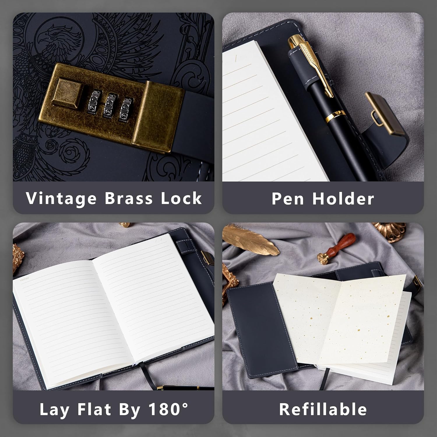 TACCUINO PHOENIX: L'originale motivo mitologico retrò contiene elementi come la Fenice, motivi floreali pieni di segreti. Pelle di alta qualità, comoda da indossare, resistenza all'usura. In diverse condizioni di illuminazione, il colore del riflesso della pelle è diverso, il che è normale. Diario con serratura: classico lucchetto a combinazione in metallo color bronzo, una combinazione di tre cifre da 0 a 9, migliaia di combinazioni di password. Ricordati di non dimenticare la tua password e di non dire ad altri di proteggere il tuo segreto. Se hai dimenticato la password, segui anche le istruzioni per reimpostarla. CARTA RICARICABILE: carta da lettere beige da 100 g, 96 fogli (192 pagine) di carta a righe, 16 fogli (38 pagine) di carta bianca, nessuna perdita di inchiostro, carta interna liscia come la seta, facilmente ricaricabile, copertina in pelle riutilizzabile. Questo diario in pelle è una capsula del tempo dei tuoi pensieri per preservare i tuoi ricordi essenziali, i tuoi successi, i tuoi fallimenti. Diario portatile: le dimensioni del notebook sono 20 × 14,5 cm, pesa 600 g. Porta facilmente questo diario vintage al lavoro, allo studio e ai viaggi. Può essere utilizzato come forniture per ufficio o taccuino da viaggio. Miglior regalo: un diario è il tuo compagno perfetto perché ti consente di esprimere i tuoi pensieri e sentimenti, fissare obiettivi e compiti mantenendo i tuoi pensieri privati. Perfetto per regali di Natale, regali di Capodanno o regali di compleanno. Ogni diario viene fornito con le istruzioni. Se non riesci ad aprire o dimentichi la password, non esitare a contattarci, possiamo aiutarti a risolverlo.