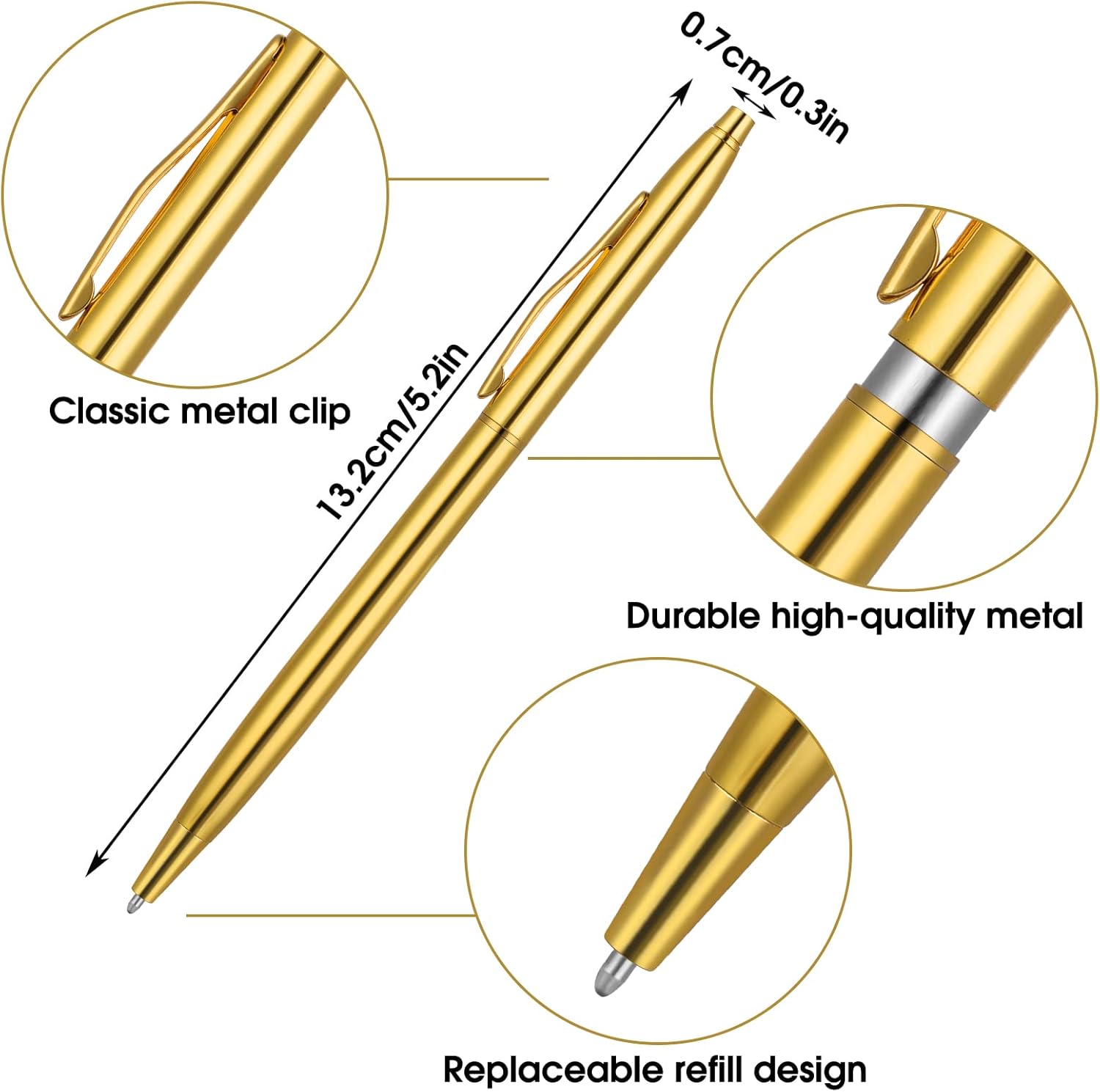 Penne a sfera metalliche: penne dorate in metallo, con una finitura superficiale di qualità che non si ossiderà mai, azione girevole per aprire, bel peso da impugnare con un buon equilibrio, ed è molto elegante da tenere in mano. Design pratico: il design a torsione impedisce alla punta della penna di inchiostrare la tasca. Una clip in metallo resistente mantiene la penna sul libro, sugli appunti o sul notebook, e puoi anche agganciarne una facilmente alla tasca della camicia per portarla in giro, a portata di mano per applicarla in tempo. Aspetto squisito: chic e splendido, perfetto per le donne, soprattutto infermiere e assistenti di volo poiché il suo design estetico, elegante e femminile illumina facilmente il tuo umore. Scrittura fluida: penne classiche economiche con alto volume di inchiostro supportano un uso prolungato. Inchiostro sostituibile utilizzando ricariche standard, è facile acquistare la cartuccia di ricambio dal mercato. È necessaria una leggera pressione per scrivere, fornisce linee definite e funziona in modo fluido e uniforme senza sbavature o saltare, rendendo la scrittura a mano un piacere assoluto. Penne regalo perfette: questi eleganti strumenti di scrittura sono perfetti per il tavolo del libro degli ospiti a matrimoni, docce, feste o ovunque sia necessario un libro degli ospiti. Regalo perfetto per Natale, Capodanno, laurea, affari, uomini, insegnanti, festa del papà, ecc