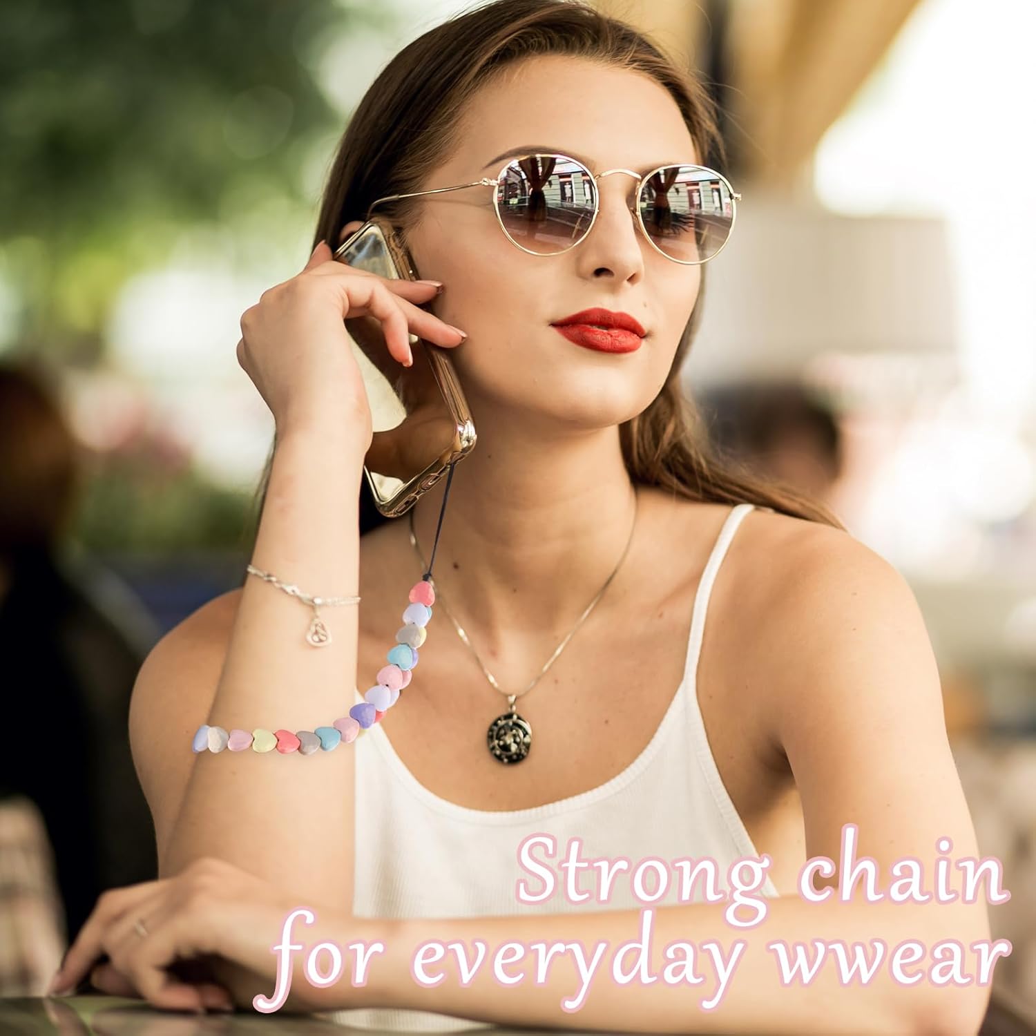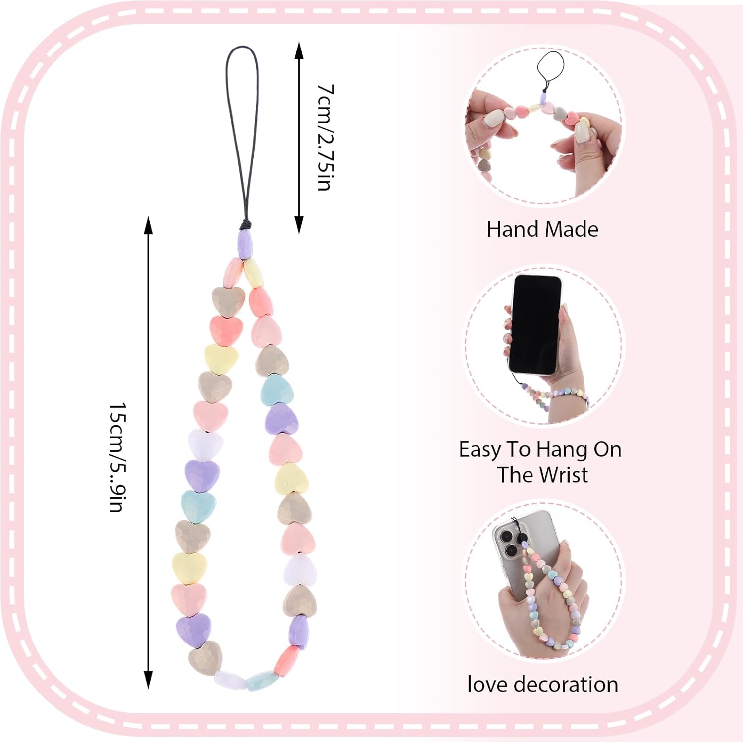 "----------------- BENVENUTI NEL NOSTRO NEGOZIO -----------------" TIESOME - Cordino per telefono con perline a forma di cuore, cinturino da polso per cellulare, fatto a mano, per donne e ragazze Materiale: acrilico. Dettagli sulle taglie: L'intera catena del telefono cellulare: 22 x 3 x 1,5 cm/8,66 x 1,18 x 0,59 pollici Parte amore: 15 cm. Cuore singolo: 1,15 x 1,07 x 0,5 cm. La confezione 2 cordini per telefono. Adatto per: donne, ragazze. La vostra soddisfazione è la nostra prima priorità, quindi non esitate a contattarci per qualsiasi problema. Se qualcosa è andato storto, faccelo sapere e ti risponderemo entro 24 ore.