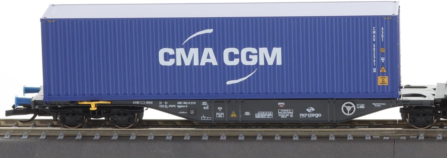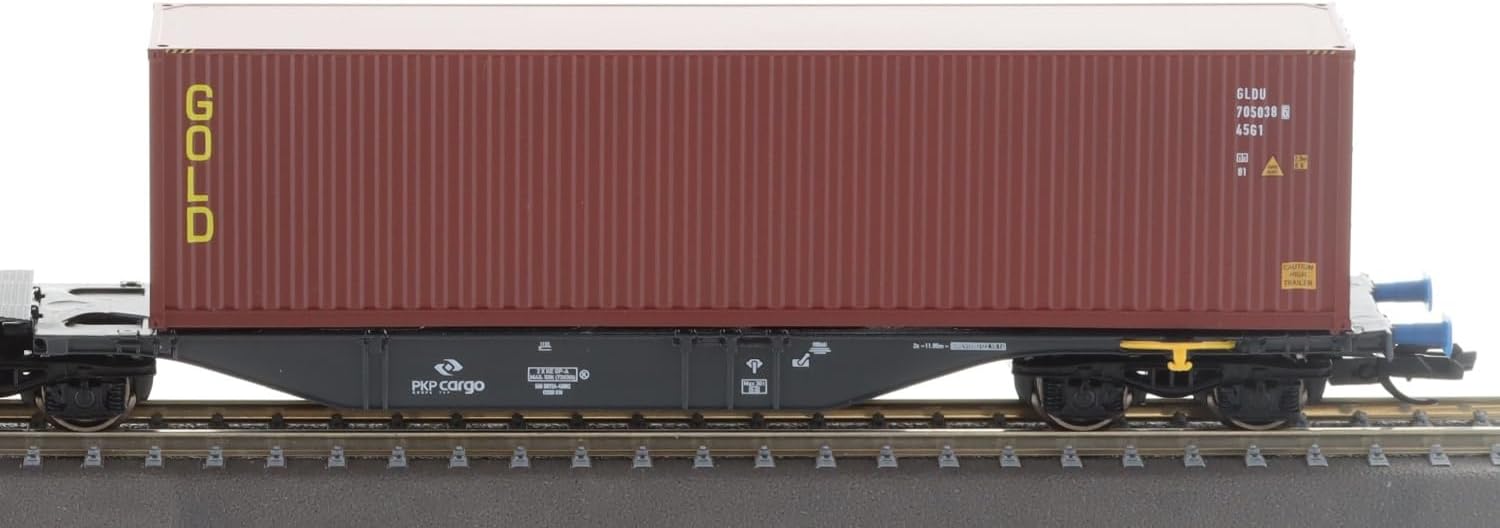 Il carrello per container Sggmrss del PKP Cargo, carico con due contenitori da 40 ′, convince con le migliori stampe e verniciature. Il modello TT ha una lunghezza di 246 mm e dispone di un attacco frizione e una cinematica a frizione corta. Caratteristiche: epoca: V-dimensione nominale: TT: 1:120- Scartamento: 12 mm. Lunghezza tramite buffer: 246 mm - attacco frizione e cinematica a frizione corta