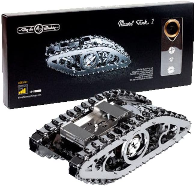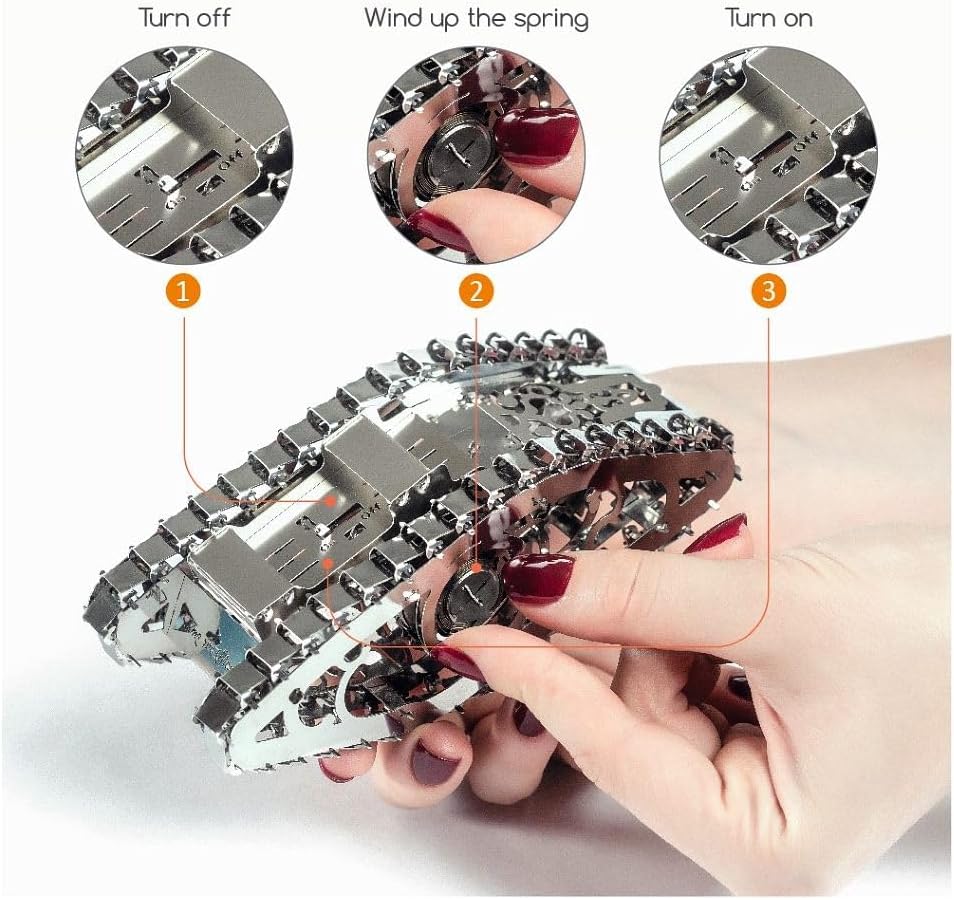 Kit di attrezzi incluso: un elegante puzzle in metallo ispirato allo steampunk per la costruzione fai-da-te, basato su un vero carro armato britannico della prima guerra mondiale. Taglia grande: si tratta di modelli di taglia media, non di giocattoli piccoli (vedere i dettagli sulle taglie nelle informazioni tecniche di seguito). Meccanismo di carica unico – Questo kit modello in metallo presenta un meccanismo di movimento, unico sul mercato, basato su una molla e una leva di carica. Sezioni apri/sposta: parti mobili uniche come cingoli, cofano e leva di avvio/arresto. Costruzione in metallo di alta qualità: il kit modello di serbatoio è dotato di resistenti piastre metalliche in acciaio inossidabile, un elevato standard di produzione e design.