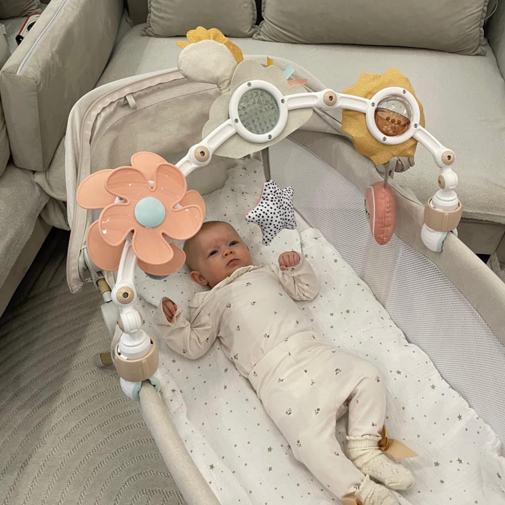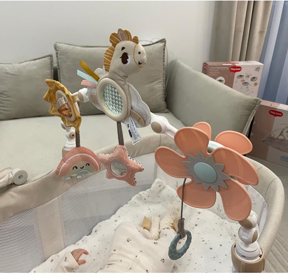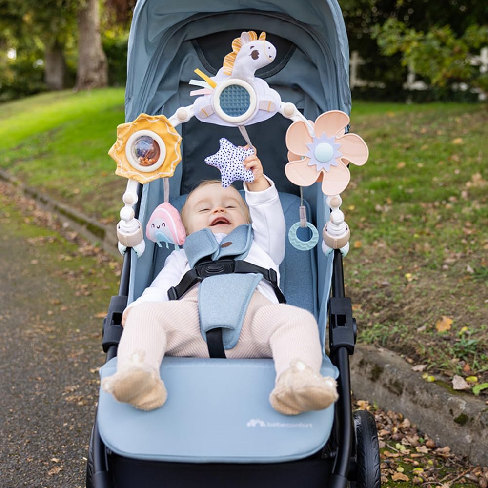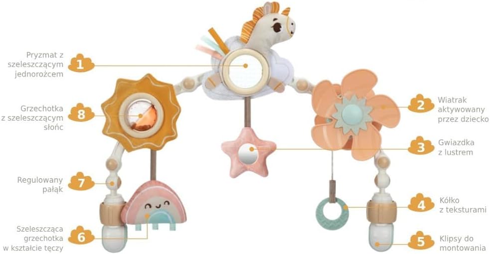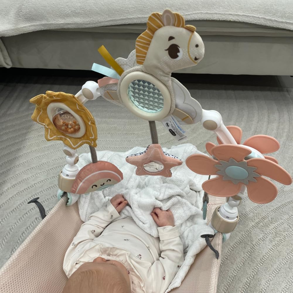 0-2 MESI: UNA STIMOLAZIONE VISIVA PER IL BAMBINO: Nei primi tre mesi i bambini hanno bisogno di stimoli visivi per imparare a mettere a fuoco. Devono essere posti a 20-30 cm e includere movimento. 3-5 MESI: PROMOZIONE DELLE ABILITÀ FINO-MOTORIE: I bambini giocano con l’arco in modo più sofisticato. Lascia che esplorino attività come tirare l’elica, guardare nello specchio e girare le perline per rafforzare le dita. 5+ MESI: APPRENDIMENTO DELLE BASI DI CAUSA ED EFFETTO: Lo sviluppo della coordinazione occhio-mano consente ai bambini di esplorare con sicurezza. L’elica rotante insegna che la loro azione provoca un risultato (movimento). CREATO DA ESPERTI: Questa magica giostrina musicale è creata con amore e cura dai nostri esperti di sviluppo infantile e stimola i sensi e lo sviluppo cognitivo del bambino. ESPLORARE E SVILUPPARE: La varietà di texture e le funzioni audio-visive incoraggiano l’esplorazione sensoriale fin dal primo giorno. UN’ESPERIENZA MAGICA, OVUNQUE ANDIATE: 6 giocattoli interattivi con design vivace e funzioni di sviluppo per divertirsi e imparare ovunque. FLESSIBILE E REGOLABILE: L’arco flessibile si regola facilmente in base all’età e si adatta alla maggior parte dei passeggini con clip sicure. PROGETTATO PER BRILLARE: La collezione Unicorn Wonderlands è pensata per genitori che vogliono regalare un po’ di magia ogni giorno al loro bambino.