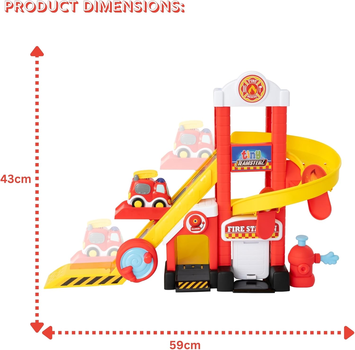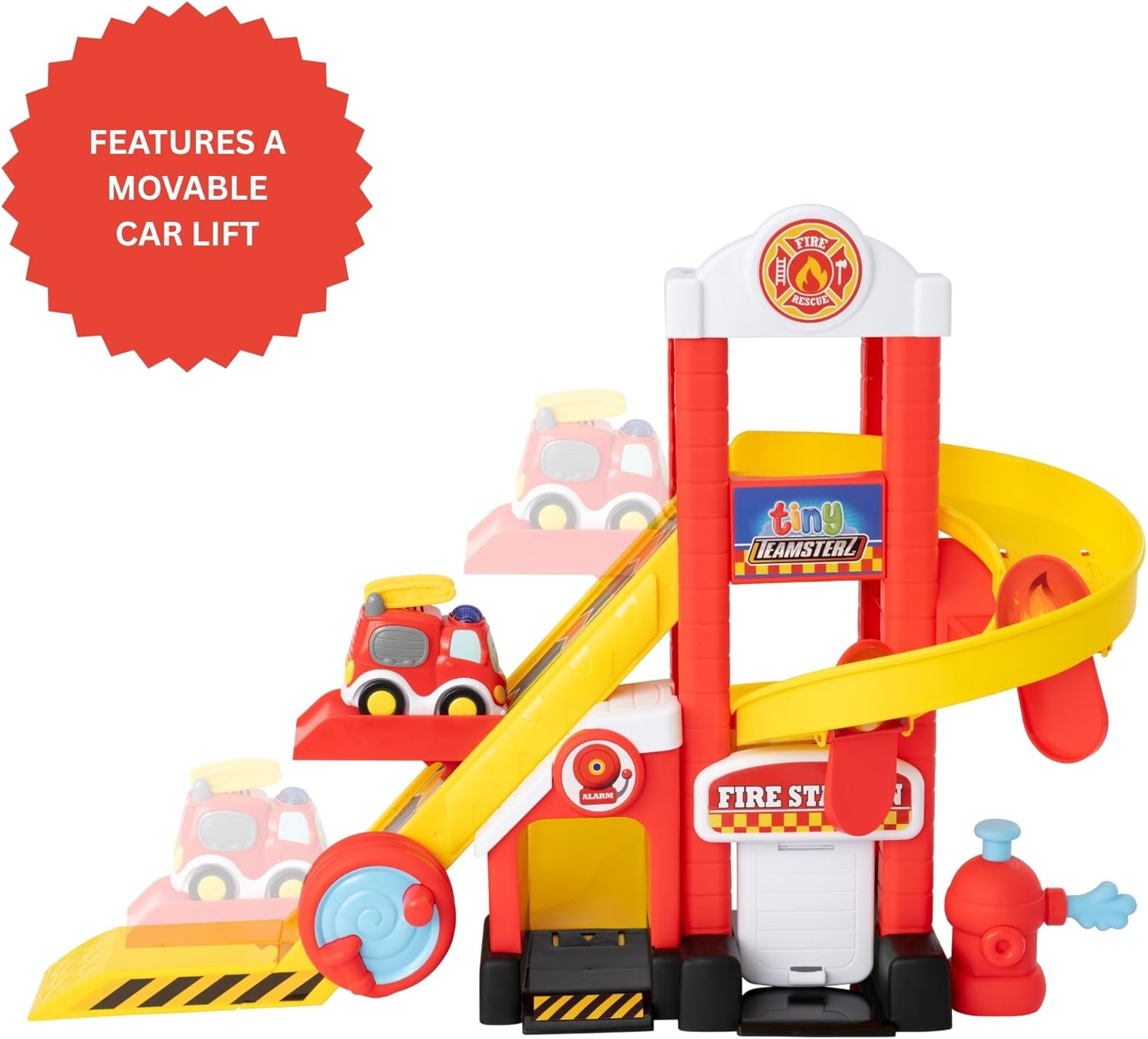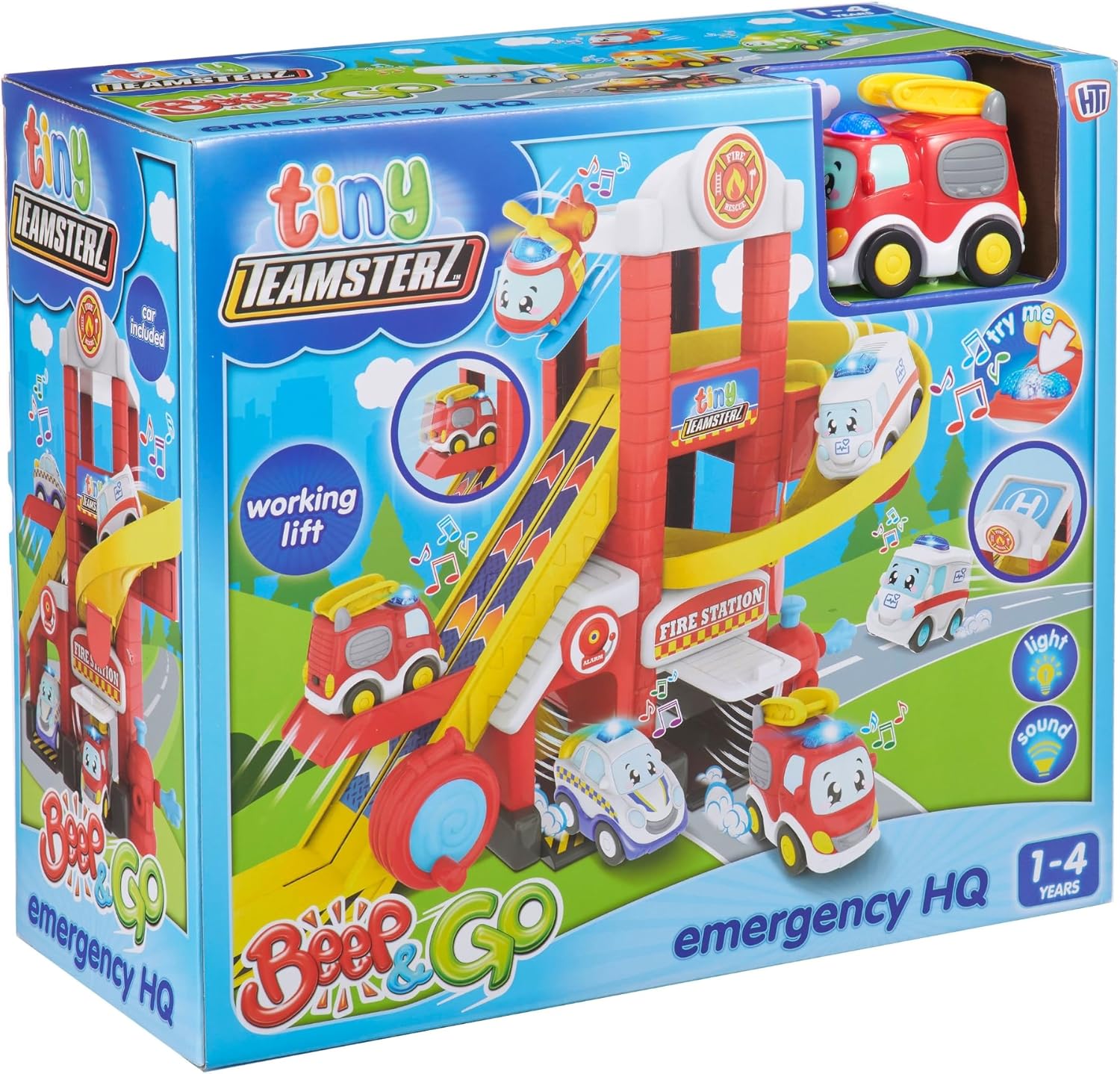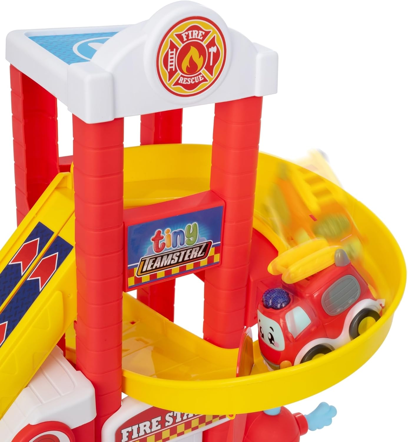 PLAYSET INTERATTIVO PER BAMBINI - Il Tiny Teamsterz Beep & Go Fire Station HQ include un divertente set da gioco da garage e un giocattolo grosso e a ruota libera. Progettato per bambini di età compresa tra 1 e 4 anni, questo set di salvataggio di emergenza incoraggia il gioco fantasioso e supporta lo sviluppo delle abilità motorie. Il dettagliato quartier generale offre un'esperienza realistica della stazione dei pompieri che i più piccoli Caratteristiche luci, suoni e design grosso: il motore dei vigili del fuoco Beep & Go incluso presenta luci lampeggianti luminose ed emozionanti effetti sonori per dare vita alle missioni di salvataggio. Costruito pensando alle piccole mani, il design robusto rende facile per i bambini afferrare, spingere e giocare. È l'introduzione perfetta al gioco dei veicoli e al gioco di ruolo di emergenza per i vigili del fuoco in erba. Gioco multilivello con sollevatore e pista a vento: questo set di giocattoli per caserma dei pompieri è ricco di funzioni divertenti tra cui un ascensore scorrevole a spirale, una pista a spirale, porte della stazione dei pompieri drive-through, un elipad e persino un idrante interattivo. Questi elementi offrono ore di divertimento pratico mentre aiutano a sviluppare il coordinamento, le capacità di narrazione e la comprensione di causa ed effetto. Set ideale per il primo motore del fuoco per bambini da 1 a 4 anni – Appositamente progettato per bambini piccoli e bambini, il quartier generale della stazione dei pompieri Tiny Teamsterz è realizzato con materiali resistenti e sicuri per i bambini. I componenti su larga scala e le parti facili da usare garantiscono un divertimento senza frustrazioni incoraggiando il gioco indipendente e sociale. Un'ottima scelta per introdurre i bambini in età prescolare ai servizi di emergenza e al lavoro di squadra. Regalo perfetto per i giovani fan dei veicoli: cerchi il regalo di compleanno o di Natale ideale per un bambino che ama i pompieri? Questo set completo da gioco con luci, suoni e funzioni interattive è un regalo emozionante ed educativo. Promuovi la creatività e l'apprendimento pratico con questo divertente set di giocattoli dei pompieri che sicuramente accenderà l'immaginazione!