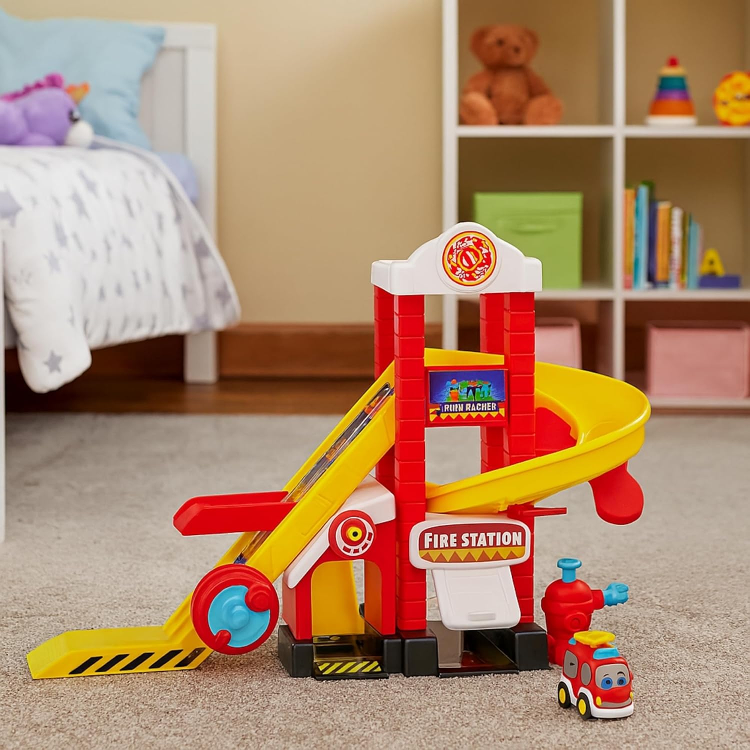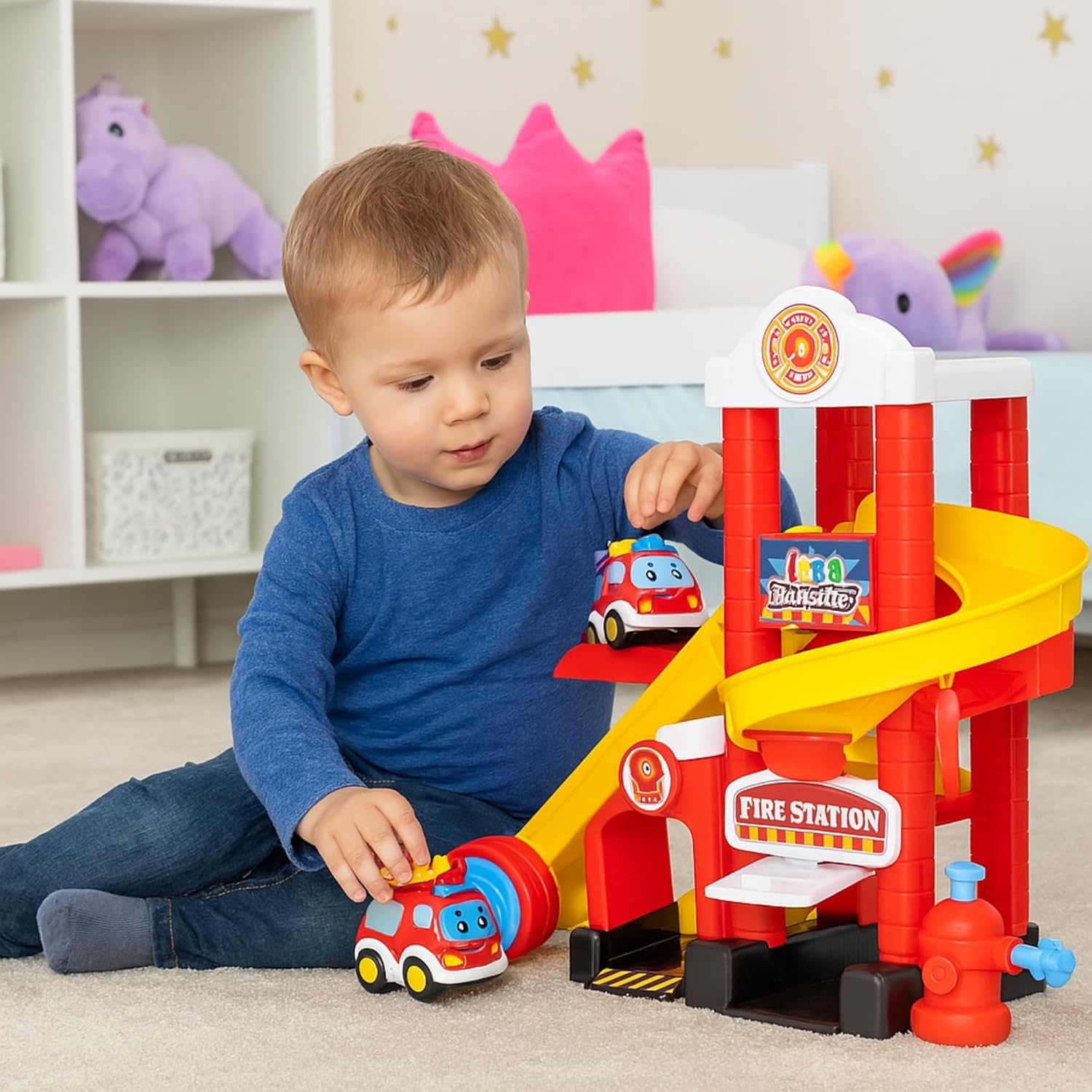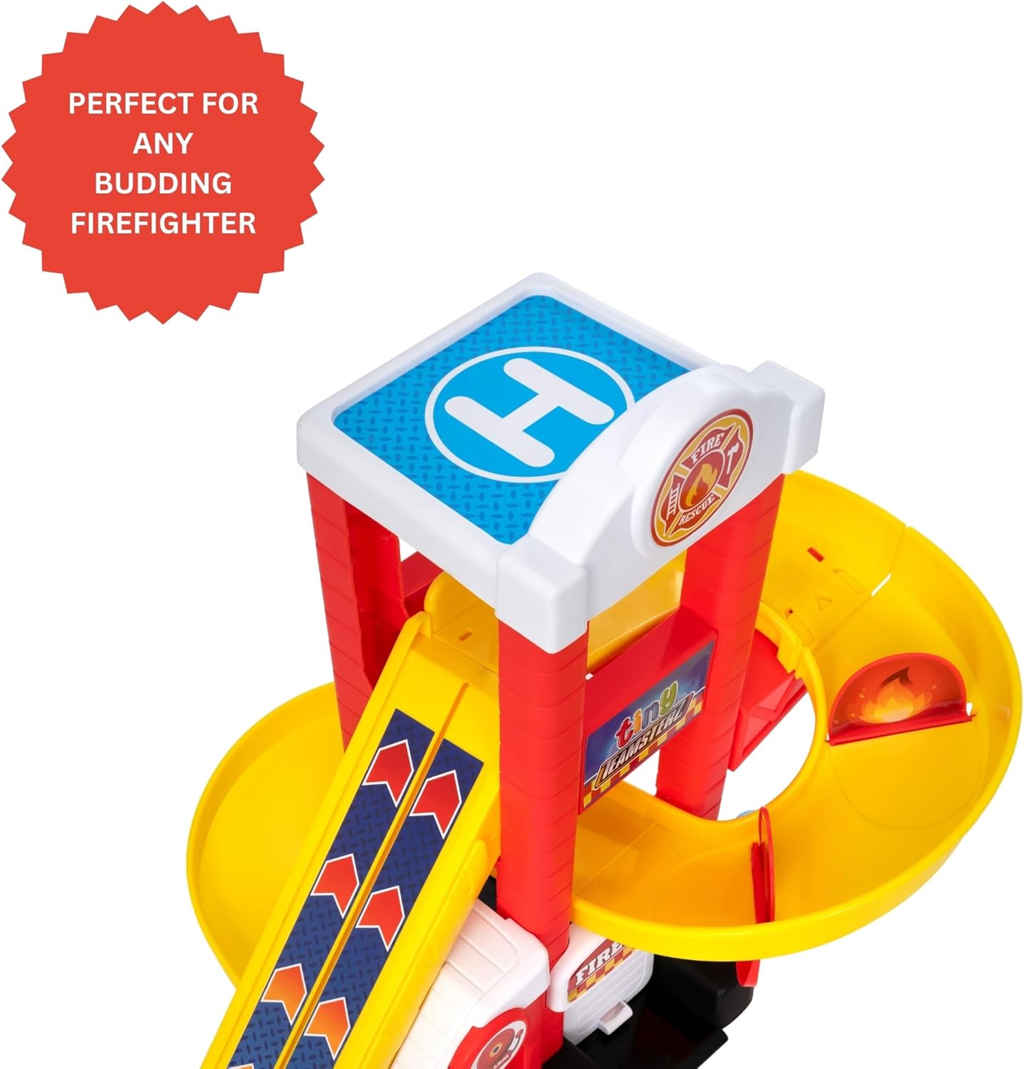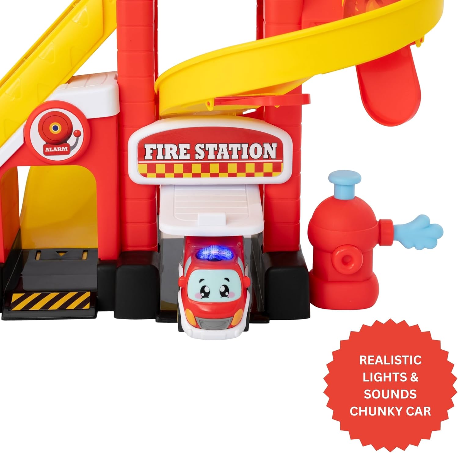 PLAYSET INTERATTIVO PER BAMBINI - Il Tiny Teamsterz Beep & Go Fire Station HQ include un divertente set da gioco da garage e un giocattolo grosso e a ruota libera. Progettato per bambini di età compresa tra 1 e 4 anni, questo set di salvataggio di emergenza incoraggia il gioco fantasioso e supporta lo sviluppo delle abilità motorie. Il dettagliato quartier generale offre un'esperienza realistica della stazione dei pompieri che i più piccoli Caratteristiche luci, suoni e design grosso: il motore dei vigili del fuoco Beep & Go incluso presenta luci lampeggianti luminose ed emozionanti effetti sonori per dare vita alle missioni di salvataggio. Costruito pensando alle piccole mani, il design robusto rende facile per i bambini afferrare, spingere e giocare. È l'introduzione perfetta al gioco dei veicoli e al gioco di ruolo di emergenza per i vigili del fuoco in erba. Gioco multilivello con sollevatore e pista a vento: questo set di giocattoli per caserma dei pompieri è ricco di funzioni divertenti tra cui un ascensore scorrevole a spirale, una pista a spirale, porte della stazione dei pompieri drive-through, un elipad e persino un idrante interattivo. Questi elementi offrono ore di divertimento pratico mentre aiutano a sviluppare il coordinamento, le capacità di narrazione e la comprensione di causa ed effetto. Set ideale per il primo motore del fuoco per bambini da 1 a 4 anni – Appositamente progettato per bambini piccoli e bambini, il quartier generale della stazione dei pompieri Tiny Teamsterz è realizzato con materiali resistenti e sicuri per i bambini. I componenti su larga scala e le parti facili da usare garantiscono un divertimento senza frustrazioni incoraggiando il gioco indipendente e sociale. Un'ottima scelta per introdurre i bambini in età prescolare ai servizi di emergenza e al lavoro di squadra. Regalo perfetto per i giovani fan dei veicoli: cerchi il regalo di compleanno o di Natale ideale per un bambino che ama i pompieri? Questo set completo da gioco con luci, suoni e funzioni interattive è un regalo emozionante ed educativo. Promuovi la creatività e l'apprendimento pratico con questo divertente set di giocattoli dei pompieri che sicuramente accenderà l'immaginazione!