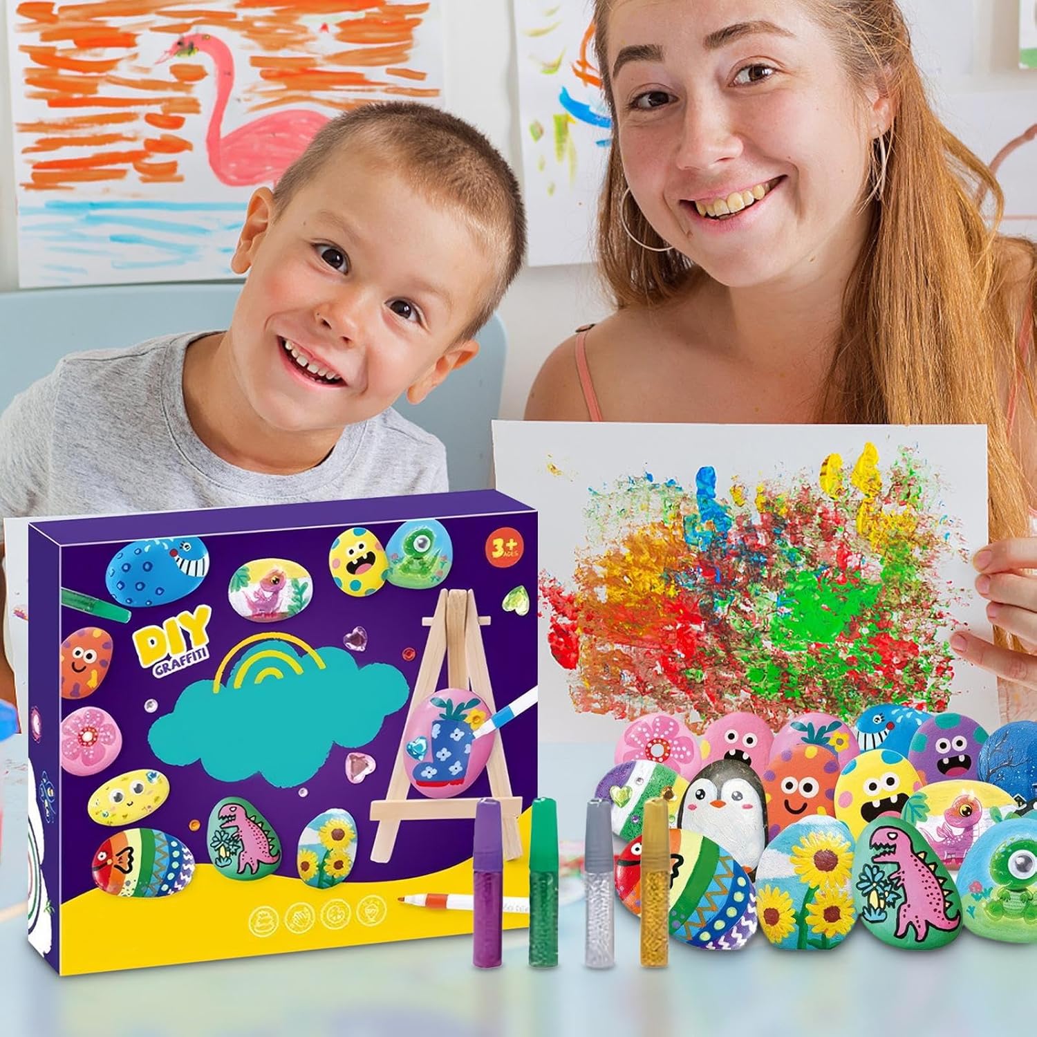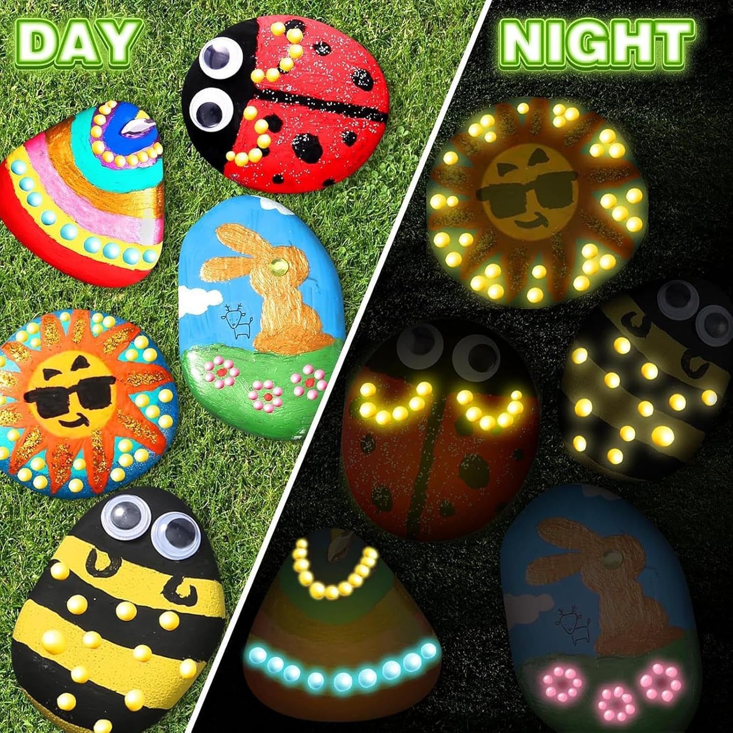 Essenziali per pittura creativa: Include pennelli e rocce per tecniche di doodling, gradienti e stratificazione, consentendo ai bambini di realizzare facilmente dipinti luminosi su rocce con materiali pronti all'uso fin dall'inizio Espressione Artistica: Il kit promuove l'attenzione e coltiva l'apprezzamento estetico, aiutando i bambini a migliorare la coordinazione dei colori e la consapevolezza spaziale, potenziando la creatività e supportando lo sviluppo artistico attraverso la pittura su rocce tridimensionali Sviluppo della Creatività Artistica: Colori facili da stendere e dalla texture morbida, combinati con pennelli dai manici arrotondati, offrono un'esperienza artistica ideale per bambini dai sei anni in su, permettendo di esplorare la creatività in autonomia durante il gioco o attività di gruppo con momenti artistici significativi Pigmenti Fluorescenti Incorporati: I pigmenti fluorescenti inclusi nel kit permettono di realizzare disegni luminosi e originali, ideali per creare motivi brillanti ispirati al cielo notturno e stimolare la creatività notturna con un'esperienza artistica e coinvolgente Scudo Arte Resistente: Forma strato protettivo idrorepellente per resistere sbiadimento in caso di pioggia o acqua, garantendo che i lavoretti manuali rimangano vibranti con una durata cromatica di lunga durata per uso interno ed esterno