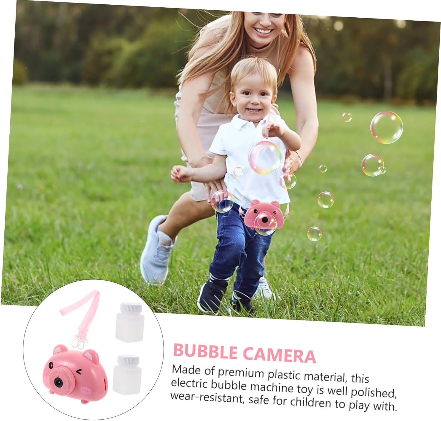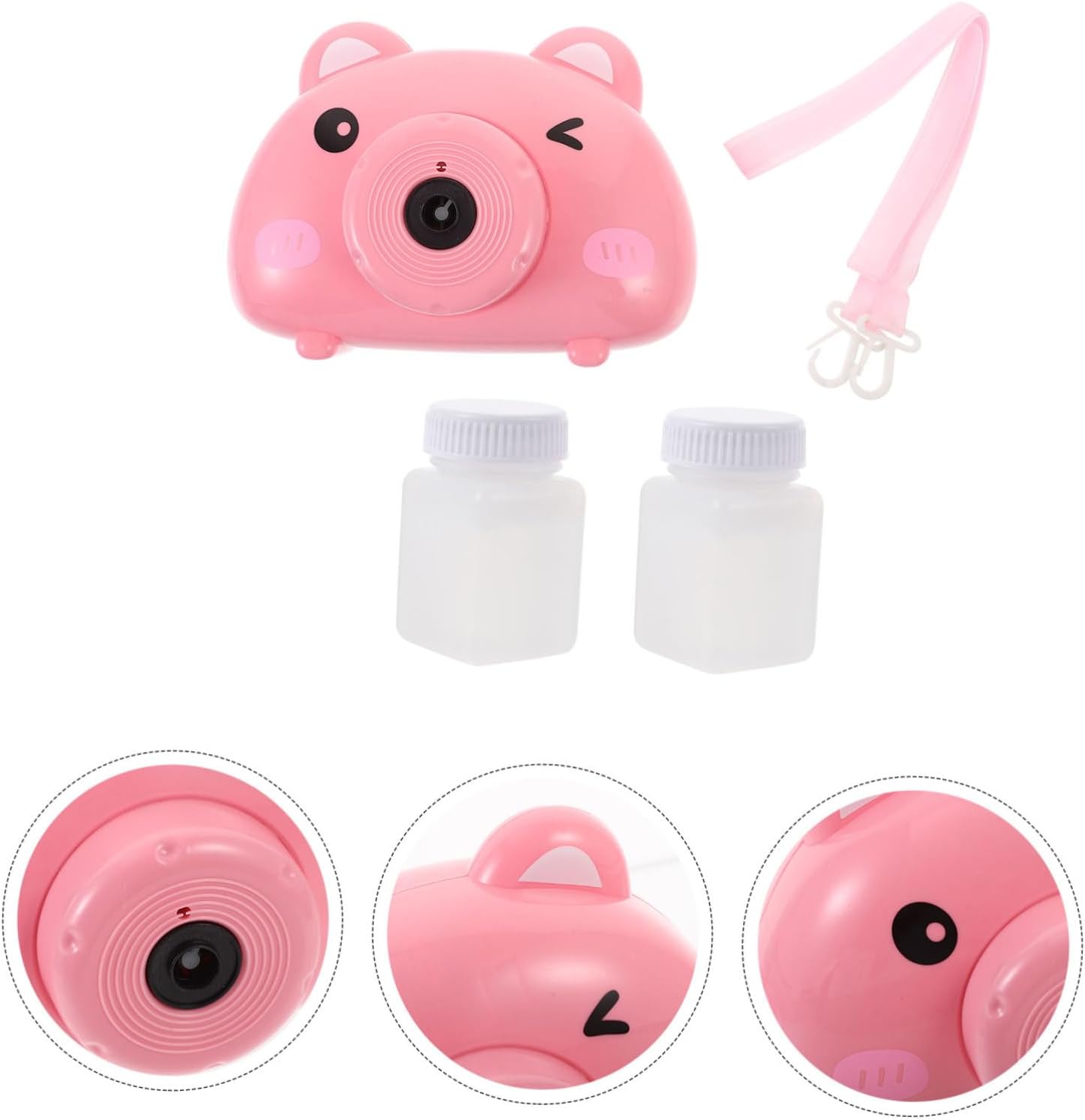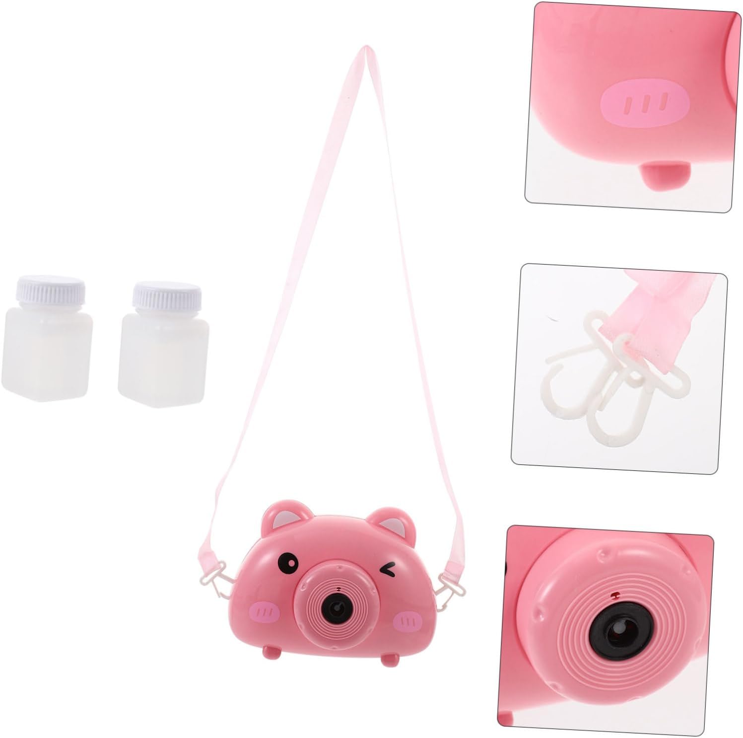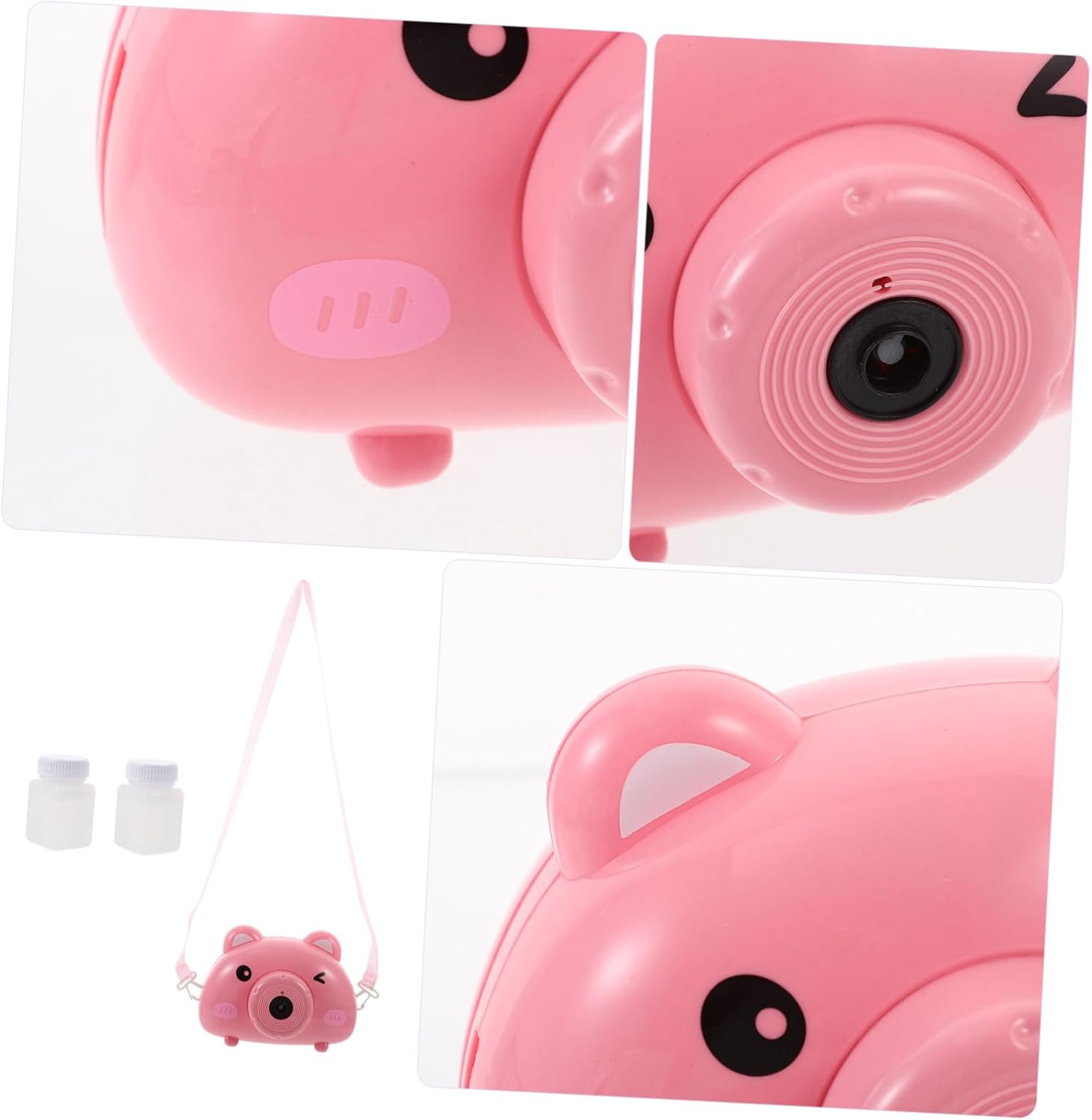 Design giocoso: la macchina per produrre bolle Bubble Camera combina l'aspetto di una macchina fotografica con un simpatico motivo a forma di maiale, offrendo un attraente giocattolo a bolle che delizia i bambini con colori vivaci e una forma divertente. Uso versatile: questa macchina elettrica per le bolle è ideale per feste, spiaggia e attività all'aperto, aprendo una varietà di possibilità per momenti giocosi all'aria aperta e offrendo tanto divertimento. Sicuro e robusto: realizzato in plastica resistente, il soffiatore per bolle di sapone offre una manipolazione sicura senza il rischio di lesioni, così i bambini possono stare tranquilli Crea e divertiti con le bolle di sapone Pratico e: dotato di una pratica tracolla, il soffiatore di bolle per bambini può essere facilmente portato ovunque per consentire il gioco in giardino, nel parco giochi o durante le riunioni di famiglia. Atmosfera felice: il giocattolo elettrico della macchina per bolle produce musica mentre gioca, creando un'atmosfera vivace che incoraggia i bambini a vivere momenti felici e ad arricchire esperienze condivise