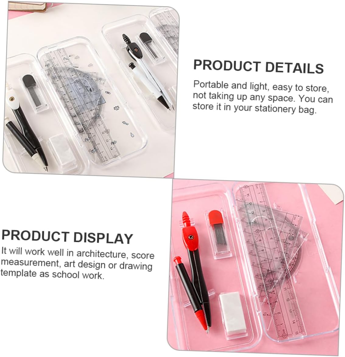 Gomma da disegno: funzionerà per l'architettura, la misurazione del punteggio, il design artistico, il modello di disegno, il lavoro scolastico, la matita di precisione. Bussola a matita di precisione: per matematica, geometria, arte, design, disegno e altri campi, gli studenti disegnano una bussola. Compassi da disegno: processo rigoroso, produzione di materiali plastici e metallici selezionati, apparentemente semplici, ma ovunque sono strumenti da disegno delicati e multifunzionali. Kit righello bussola: con diversi strumenti di disegno, in grado di soddisfare le diverse esigenze di utilizzo, disegna bussole. Strumento di disegno circolare: strumenti di disegno pratici e pregevole fattura ti forniranno un utilizzo confortevole, strumento di geometria della bussola.