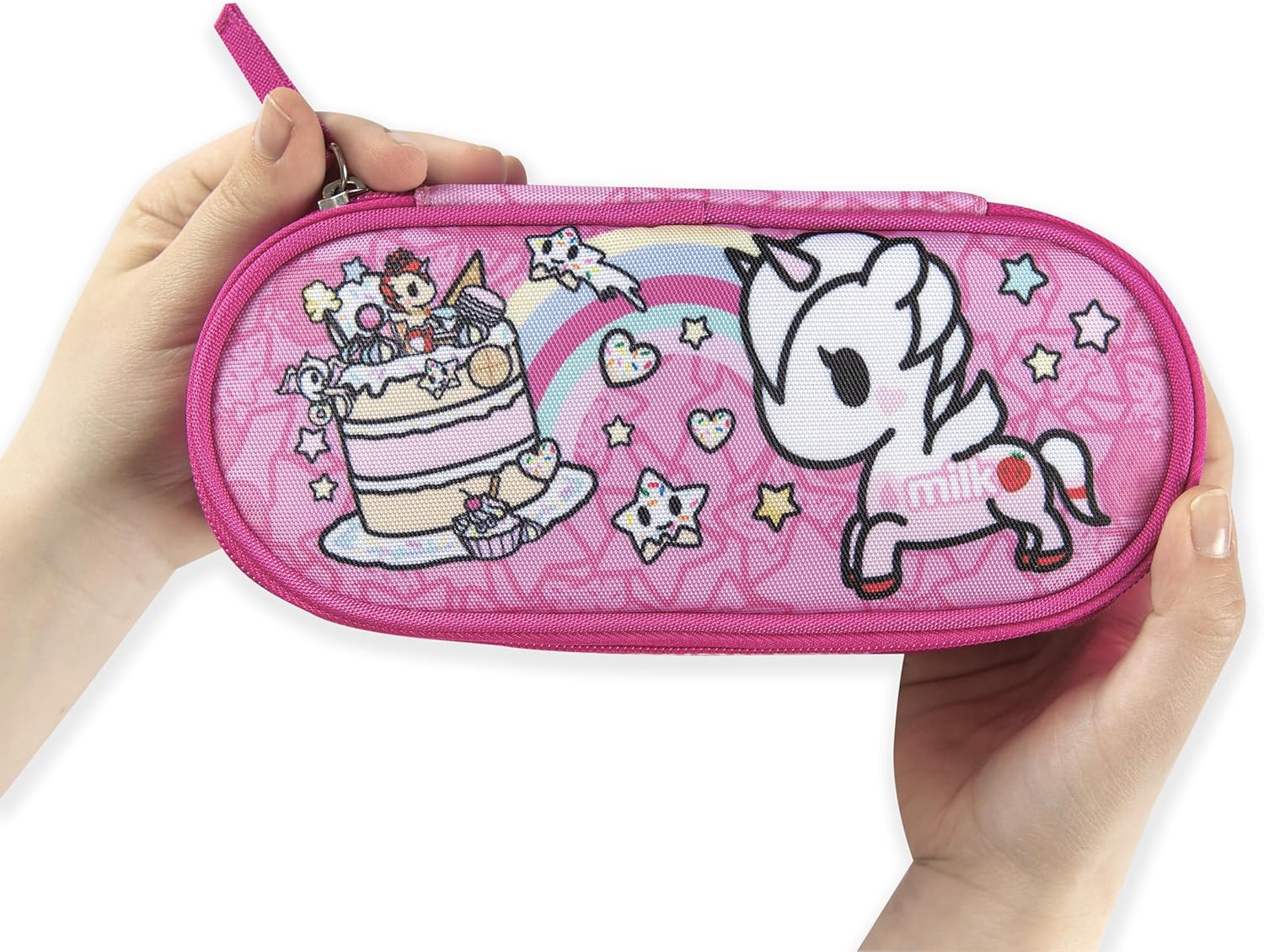 L'astuccio ovale personalizzato Tokidoki è ideale per bambine ed è distribuito con licenza originale da Franco Cosimo Panini Editore. Grazie alle dimensioni di 22 x 7 x 9,5 cm, alla tasca interna e al divisorio con passanti elastici su entrambi i lati, permette di contenere e organizzare in modo ottimale penne, matite, gomme e altro ancora. Preparati ad esprimere la tua creatività in modo organizzato e divertente!