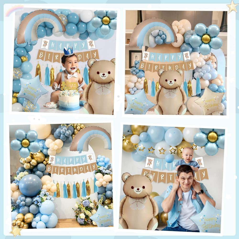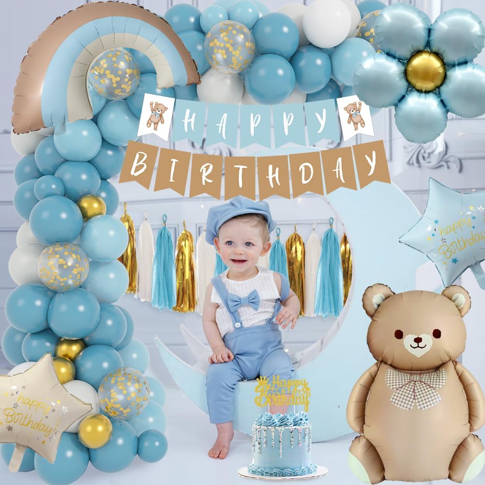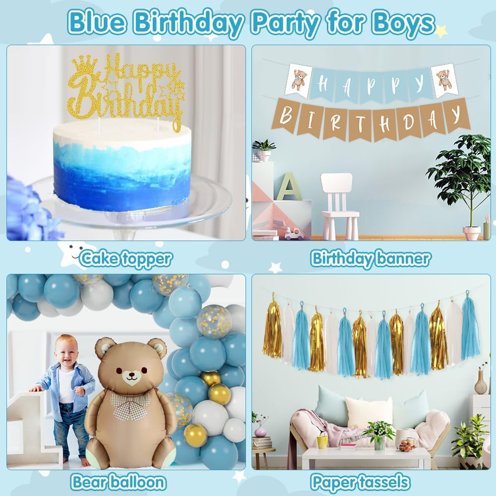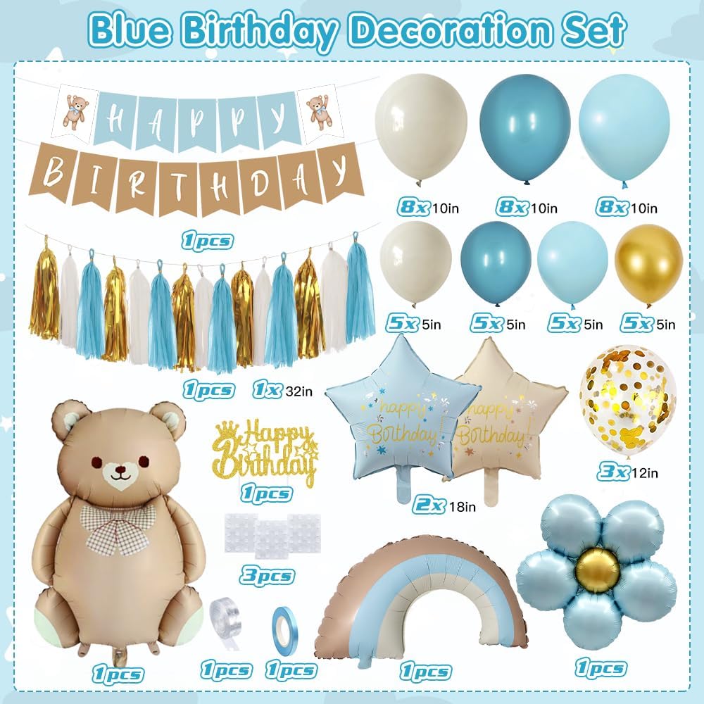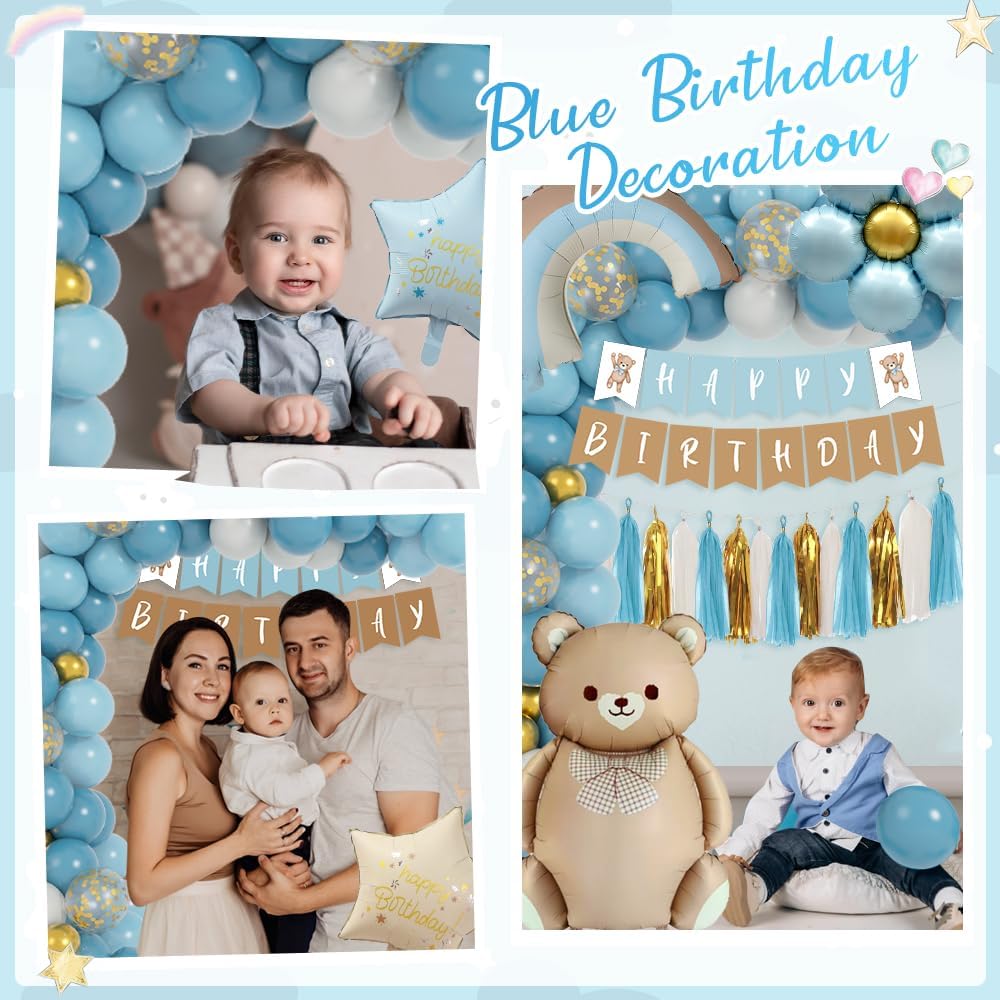 【Decorazioni per feste di compleanno】 Questo set di decorazioni di compleanno blu include 4 colori di palloncini (blu polvere / celeste / oro metallizzato / bianco sabbia), 24 palloncini da 10", 8 palloncini da 12", 20 palloncini da 5", 1 palloncino con fiori blu, 1 palloncino con orso bruno, 1 palloncino arcobaleno blu, palloncini con 2 stelle, 12 nappe di carta, 1 ghirlanda di buon compleanno, 1 cake topper, 1 nastro per palloncini blu - tutto ciò di cui hai bisogno un kit 【Decorazioni di Compleanno per Ragazzi】 Parti per un'avventura gioiosa con le forniture di compleanno dei nostri bambini in bellissime tonalità di blu.Il nostro adorabile set di orsetti include incredibili palloncini blu, un grande palloncino in foil a forma di orsetto, uno striscione "Happy Birthday" in tenui toni di blu. Un affascinante palloncino in foil e un simpatico cake topper in rilassanti tonalità vintage di blu forniscono un tema versatile perfetto per i ragazzi Il palloncino in lattice è accuratamente selezionato per garantire che sia sicuro per i bambini e perfetto per il riempimento di aria o elio.Il tema dell'orso, creando un look più completo e organico. 【Decorazioni di Compleanno per Bambini】Il nostro set per feste con orsi è ideale per festeggiare il primo compleanno del tuo bambino. Il mix di tonalità blu retrò crea un'atmosfera da sogno e incantevole per l'occasione Ragazzo】 Siamo convinti della qualità e dello stile elegante di questo classico palloncino di compleanno a forma di orso realizzato con materiali di alta qualità. Sono perfettamente adatti per decorare il primo compleanno di ragazzi e ragazze, per feste di compleanno a tema orso e per decorare i baby shower.