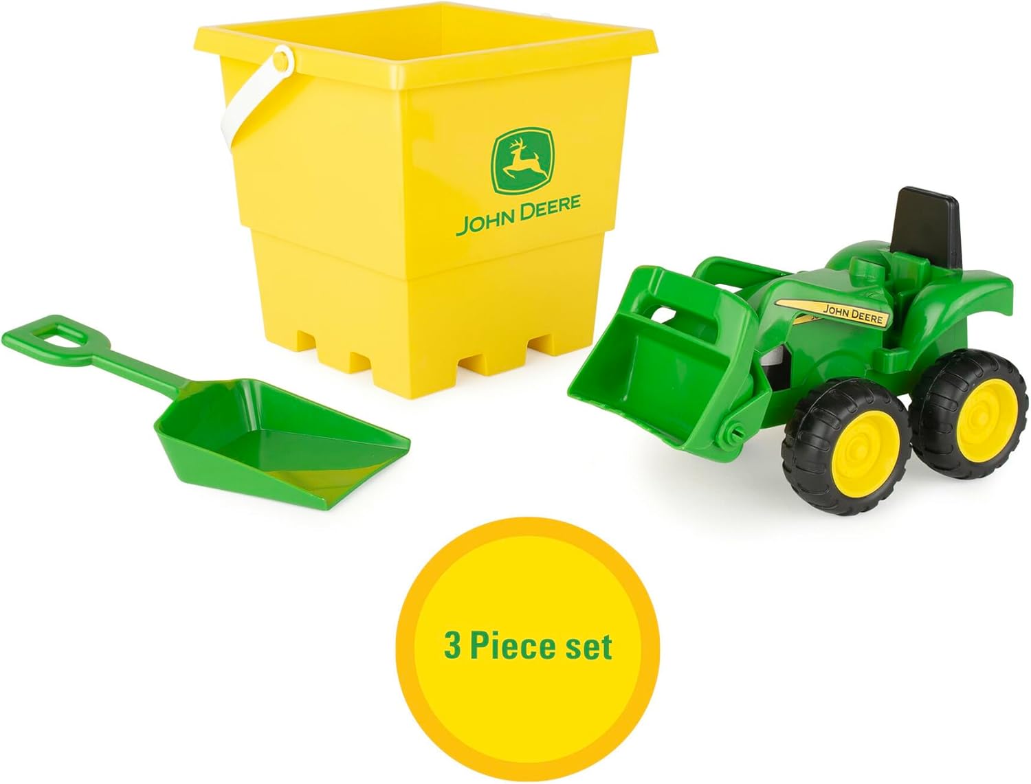 Set di giocattoli sandbox: include un secchio quadrato, una pala e un autocarro con cassone ribaltabile John Deere verde per realizzare bellissimi castelli di sabbia. Robustezza: realizzato con materiali sicuri e durevoli per garantire la robustezza degli accessori Giocattolo del trattore: il trattore John Deere è dotato di ruote a scorrimento libero e di un caricatore che si alza e si abbassa, perfetto per caricare la sabbia! Gioco creativo: ispira momenti di gioco fantasioso per i più piccoli dai 18 mesi in su Prodotto con licenza ufficiale John Deere