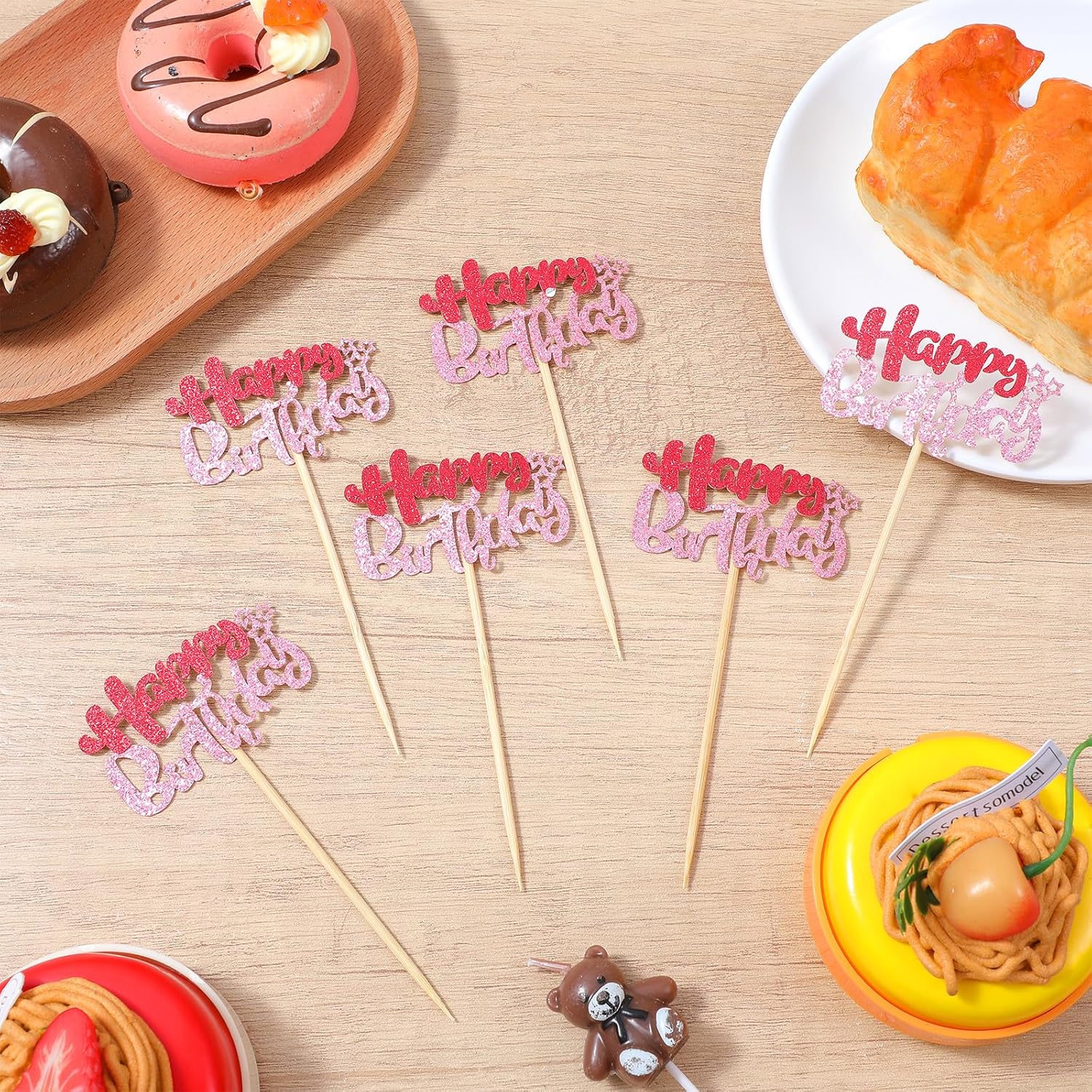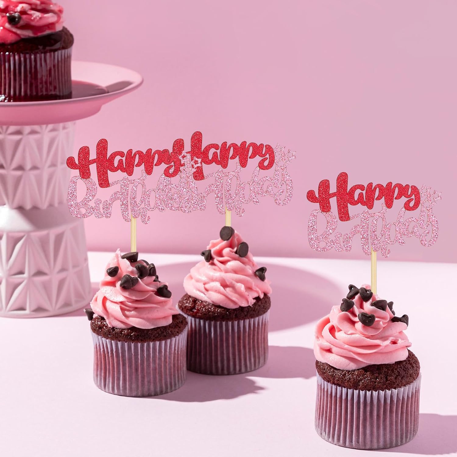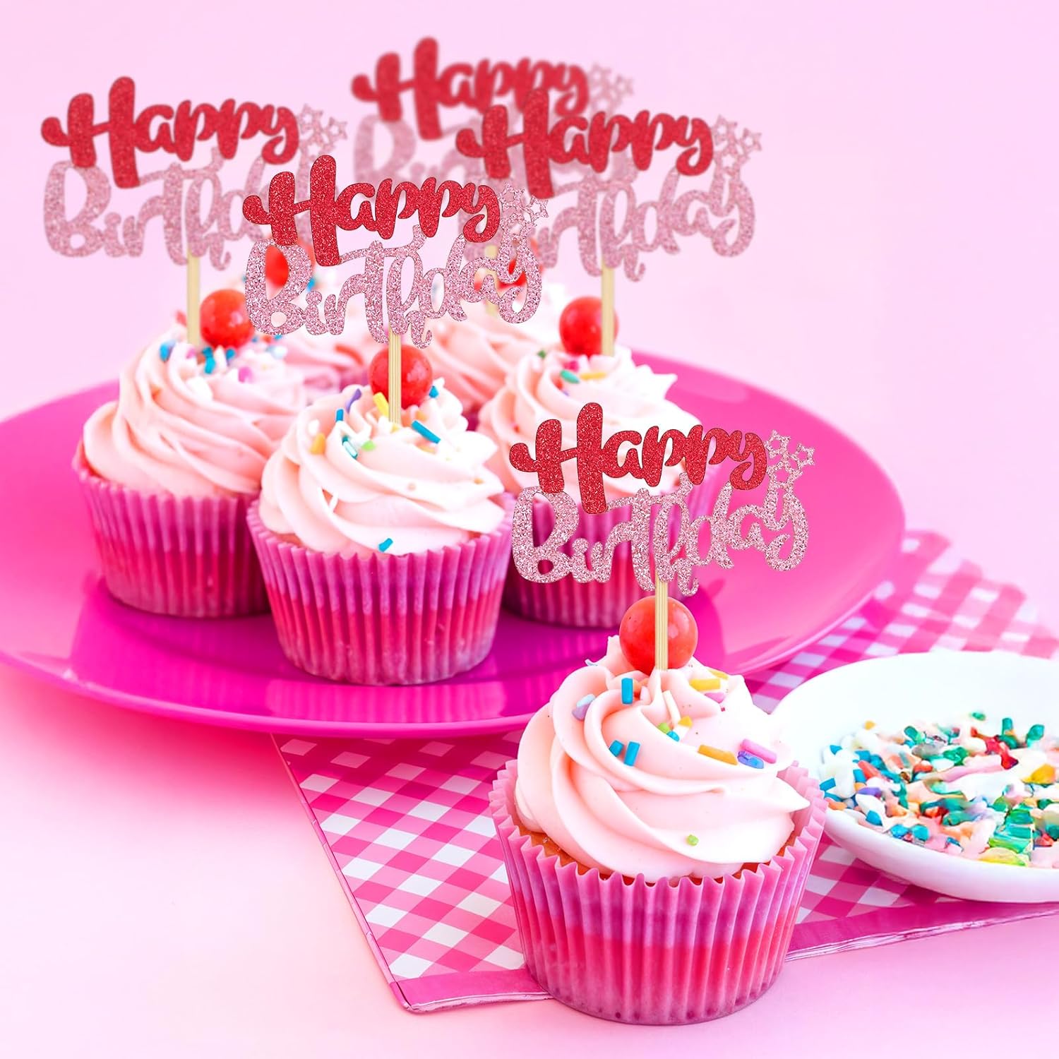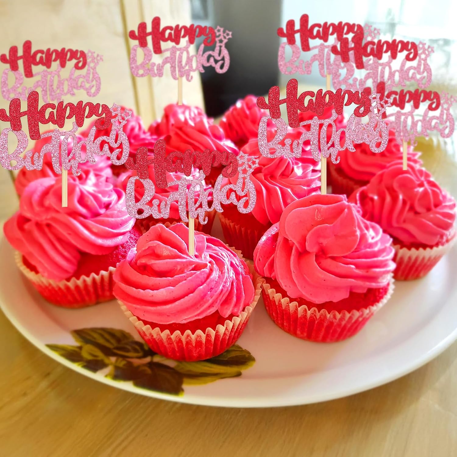 Set completo di 24 toppers per torta rosa di buon compleanno: sufficienti per decorare torte di compleanno, cupcake o muffin per feste di compleanno e decorazioni per feste. Design scintillante: con un effetto topper cupcake scintillante e una struttura a doppio strato, aggiungono un tocco festoso e vivace a torte e prodotti da forno, perfetti per un pezzo da esposizione accattivante. Dimensioni pratiche: ogni topper per muffin ha un inserto di 6 × 4 cm e una dimensione totale di 6 × 12 cm - adatto a torte e cupcake di diverse dimensioni senza sovraccaricare i prodotti da forno. Materiale cartaceo leggero: realizzato in carta per topper per torta di compleanno, peso totale: 38 g, facile da maneggiare, abbastanza stabile per la decorazione e sicuro per il contatto con gli alimenti. Colore rosa: il topper per torta di compleanno di colore rosa fresco si adatta a temi femminili, decorazioni pastello o abiti colorati per le feste: un'ottima aggiunta agli accessori per feste di compleanno.