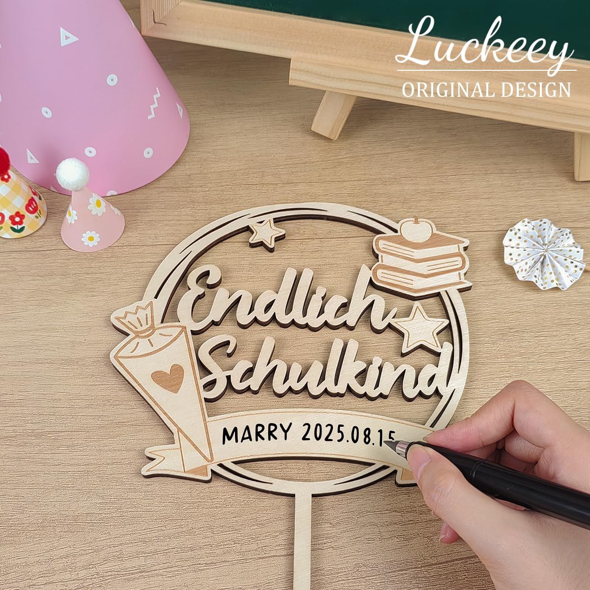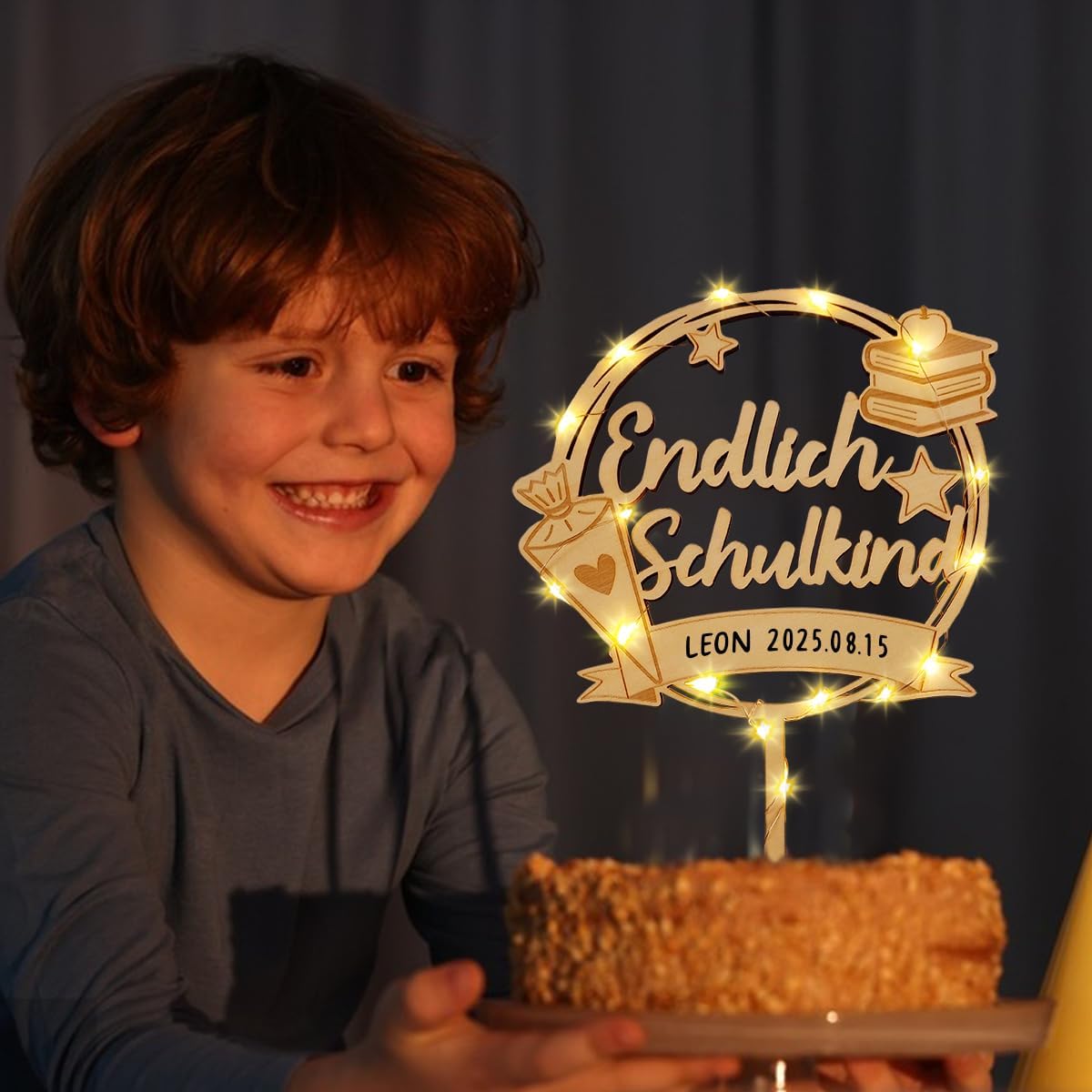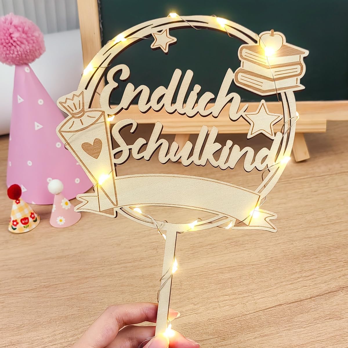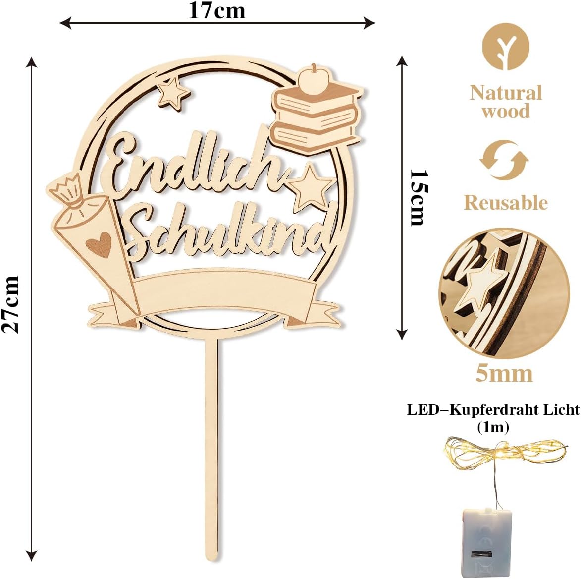 Decorazione torta per il rientro a scuola: 1 decorazione torta “Finalmente scolaro” (27 cm x 17 cm, spessore: 4 mm) e una ghirlanda leggera (1 m). Materiali di prima qualità: questo topper per torta per il rientro a scuola è realizzato in legno di prima qualità, è durevole, ecologico, inodore e riutilizzabile. Puoi scrivere il nome del tuo bambino e la data nello spazio libero sul cake topper. Design raffinato: è ricco di vari elementi per il rientro a scuola: decorato con libri scolastici, bustine di zucchero e stelline, ha anche la scritta "Endlich Schulkind". La calda ghirlanda di luce bianca conferisce inoltre un'atmosfera particolarmente calda. UTILIZZO VERSATILE: Questo cake topper per il rientro a scuola è ideale come decorazione per la festa di ragazze e ragazzi, il rientro a scuola richiede una certa celebrazione - e questo bellissimo cake topper per il rientro a scuola abbellisce la festa del rientro a scuola dei bambini e dà loro più vita. Servizio clienti: questo prodotto è solo per la decorazione di torte e non è commestibile. Se riscontri problemi dopo la ricezione, contattaci immediatamente: faremo il possibile per ottenere una soluzione soddisfacente.