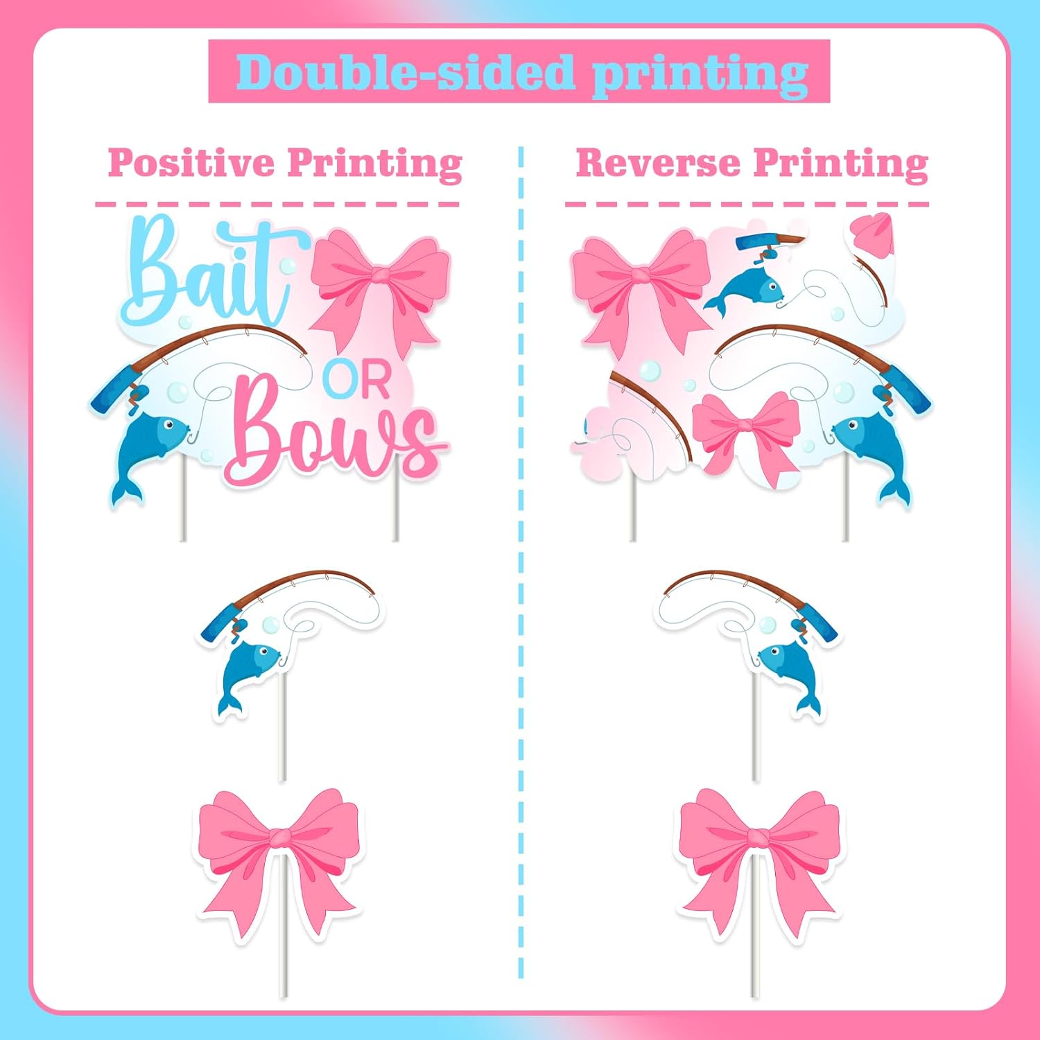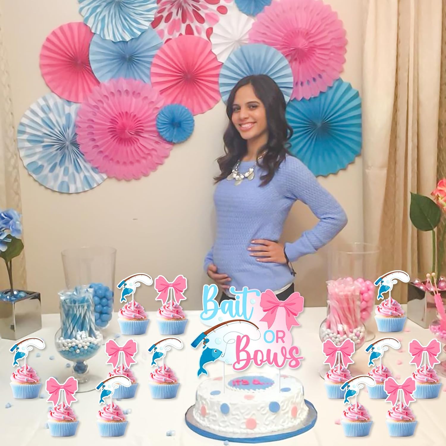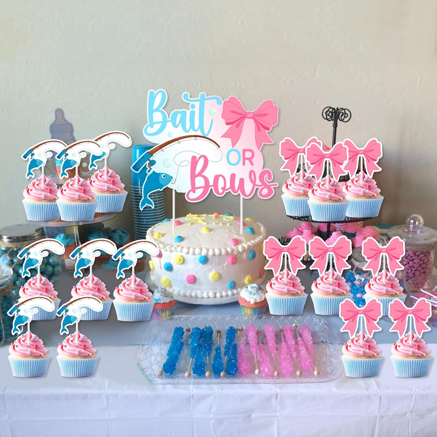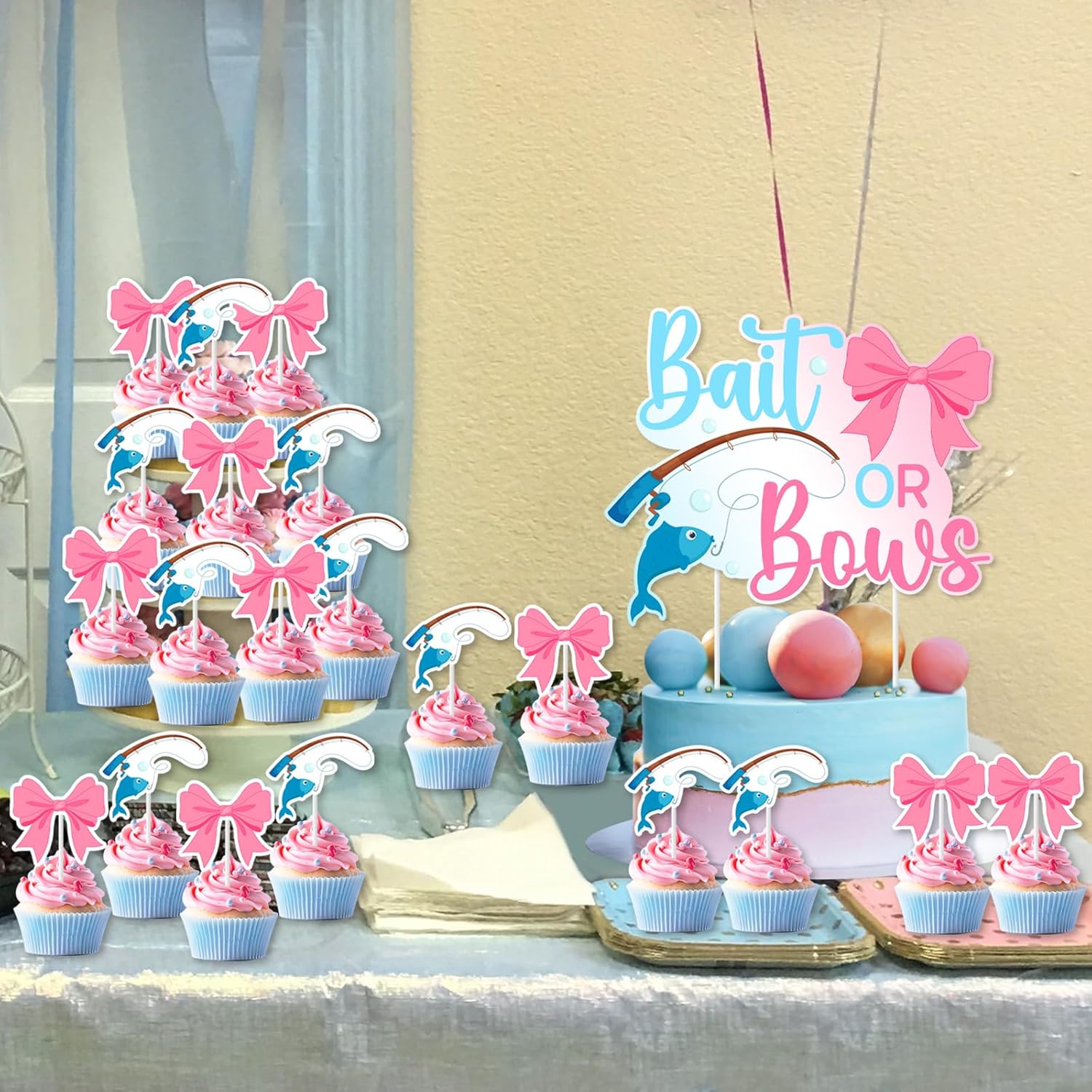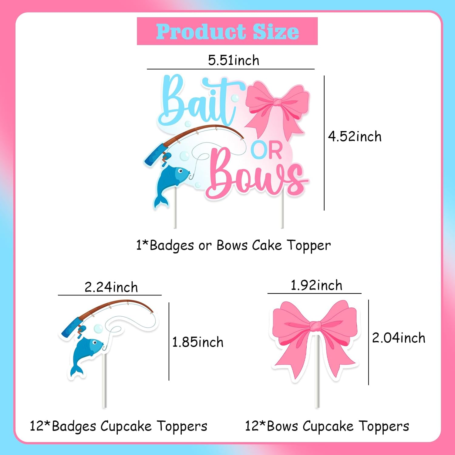 La confezione include: riceverai 24 toppers per cupcake (12 x 4,7 x 5,7 cm, 12 x 4,9 x 5,2 cm con design a fiocco) e 1 esca o fiocco da 11,5 x 14 cm. Decorazione con esca o fiocco per rivelare il genere: il design a tema esca o fiocco è molto adatto per ragazzi o ragazze e il colore dei toppers per torta alla pesca è brillante, il che è molto adatto per feste che rivelano il genere. Facile da usare: i punti adesivi inclusi nella confezione ti aiuteranno a fissare rapidamente i toppers per torta al palo. Basta posizionare l'asta nella torta e sarà fissata saldamente. Ampia applicazione: non solo può essere utilizzata come decorazione per torta, ma anche come supporto fotografico, molto adatta per scattare foto per registrare i momenti felici di esche o fiocchi, baby shower. Stampa fronte-retro: le decorazioni per torte grandi e piccole sono stampate su entrambi i lati, fare riferimento alla didascalia per disegni specifici. Se avete domande, non esitate a chiedercelo, vi daremo una risposta soddisfacente il prima possibile, grazie