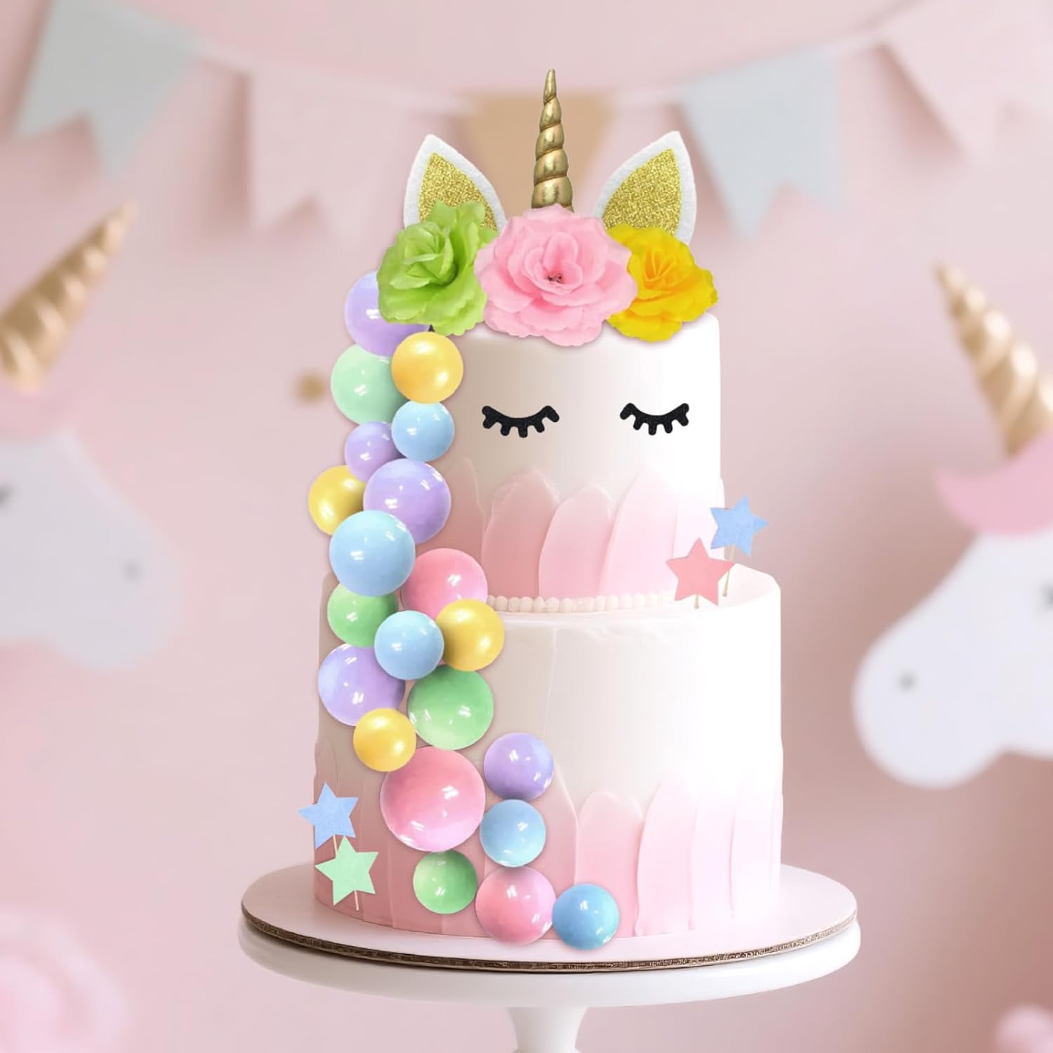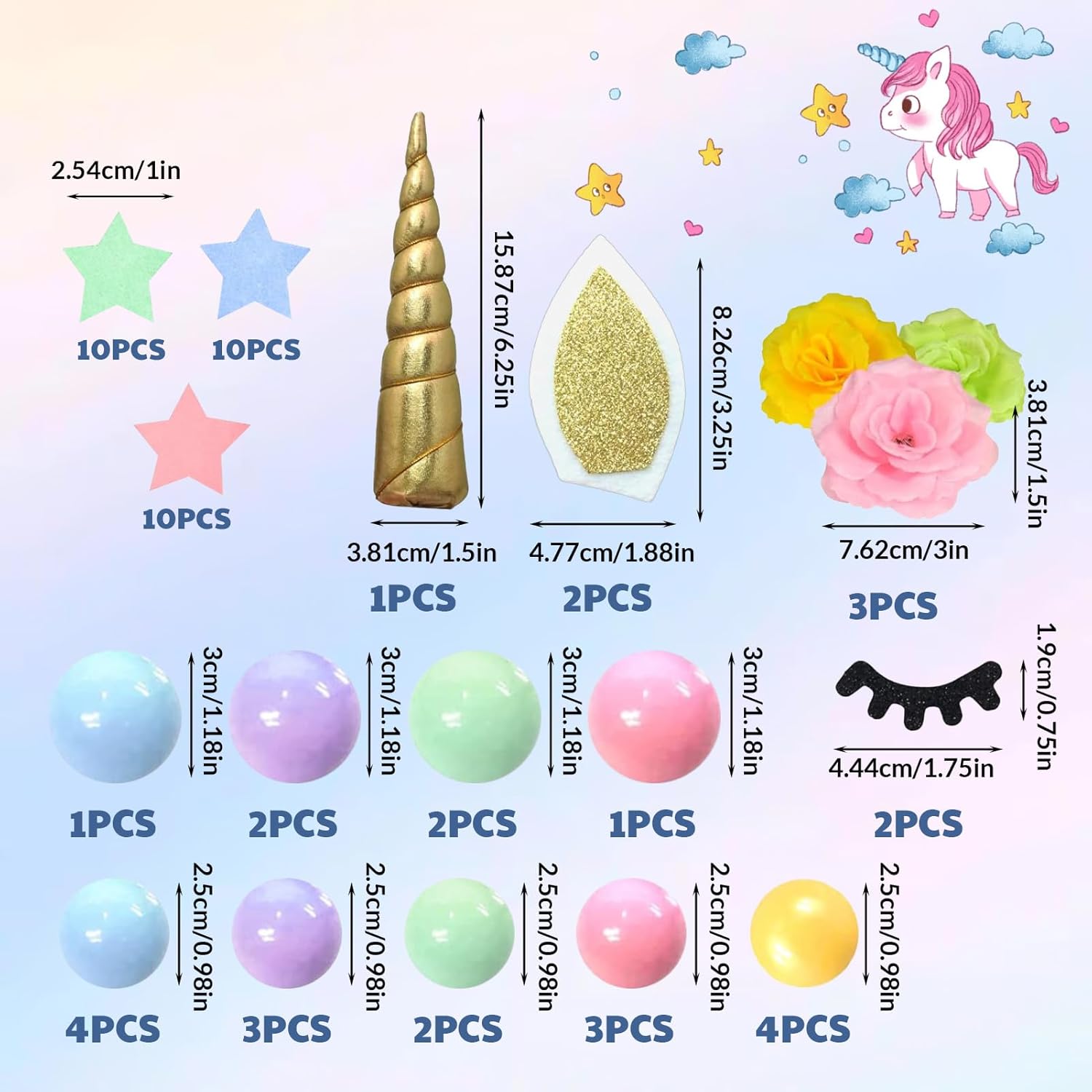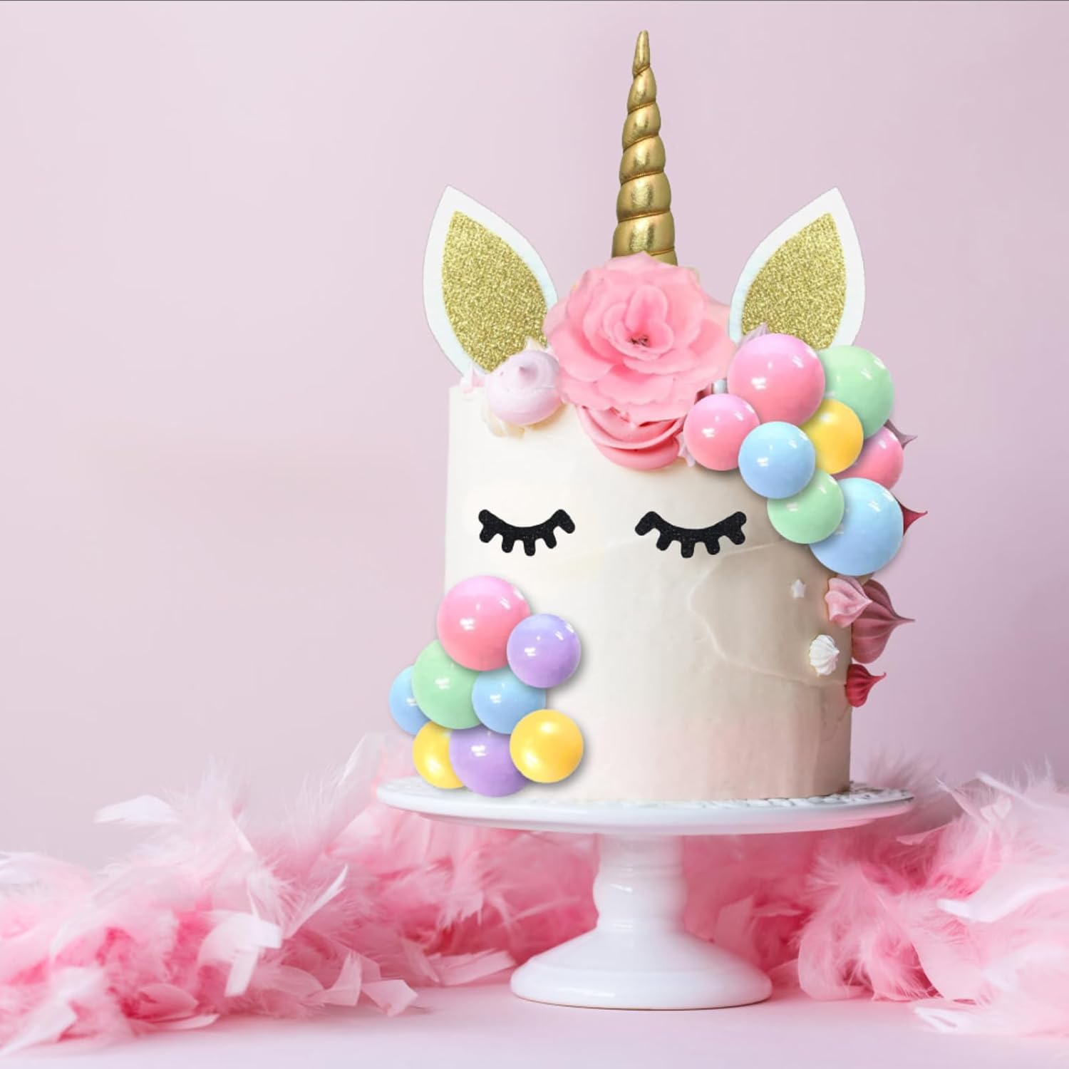 【Contenuto della confezione】: riceverai 1 set di topper per torta con unicorno, 22 palline, 30 stelle, 3 fiori artificiali. Le ciglia aggiungono un tocco vivace e adorabile alla tua torta di unicorno. 【Sicuro e riutilizzabile】: i nostri toppers per torta con unicorno sono sicuri (non commestibili) e possono essere utilizzati con sicurezza. Possono anche essere riutilizzati dopo la pulizia. 【Facile da usare】: basta inserire le decorazioni nella torta, quindi attaccare le ciglia con glassa o cannucce come desiderato - ed ecco che hai una bellissima torta di unicorno pronta da gustare! 【Versatile】: perfetto per compleanni, matrimoni, feste arcobaleno, anniversari, feste in giardino o tea party. Questa decorazione regala un'atmosfera magica e gioiosa a grandi e piccini. 【Regalo affascinante】: questo set di decorazioni per unicorno è un'idea regalo ideale per i tuoi cari o per te stesso. Crea una scintillante torta da favola per un'indimenticabile festa di compleanno a tema unicorno!