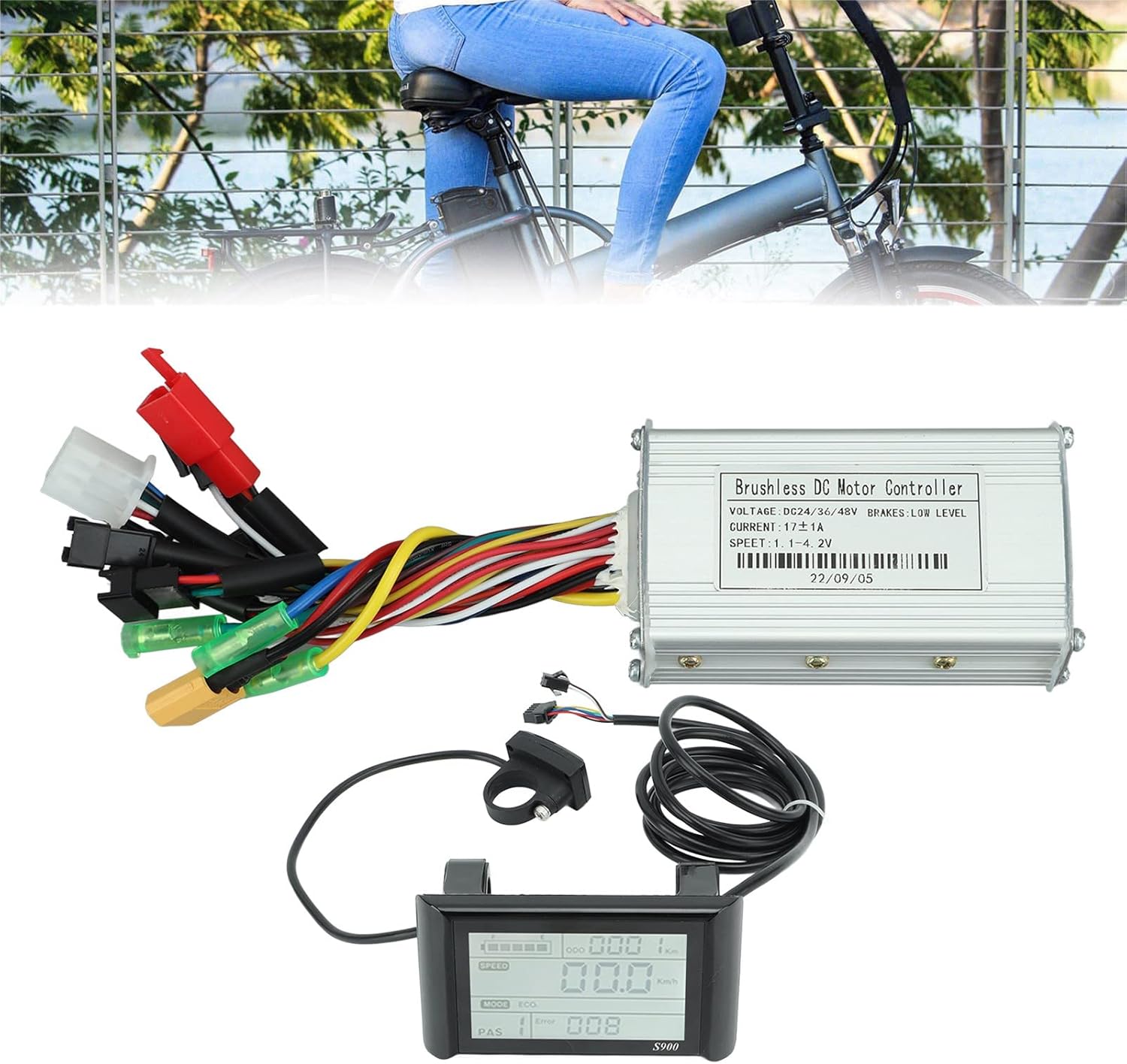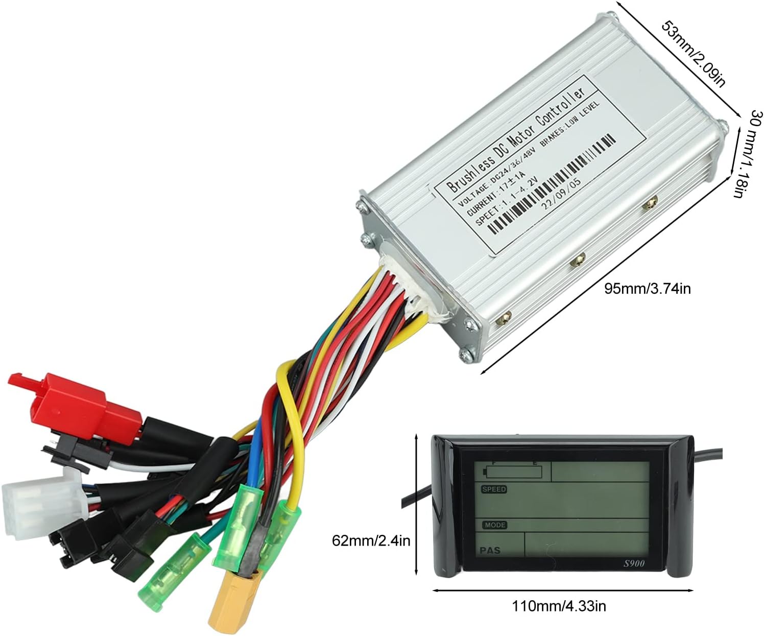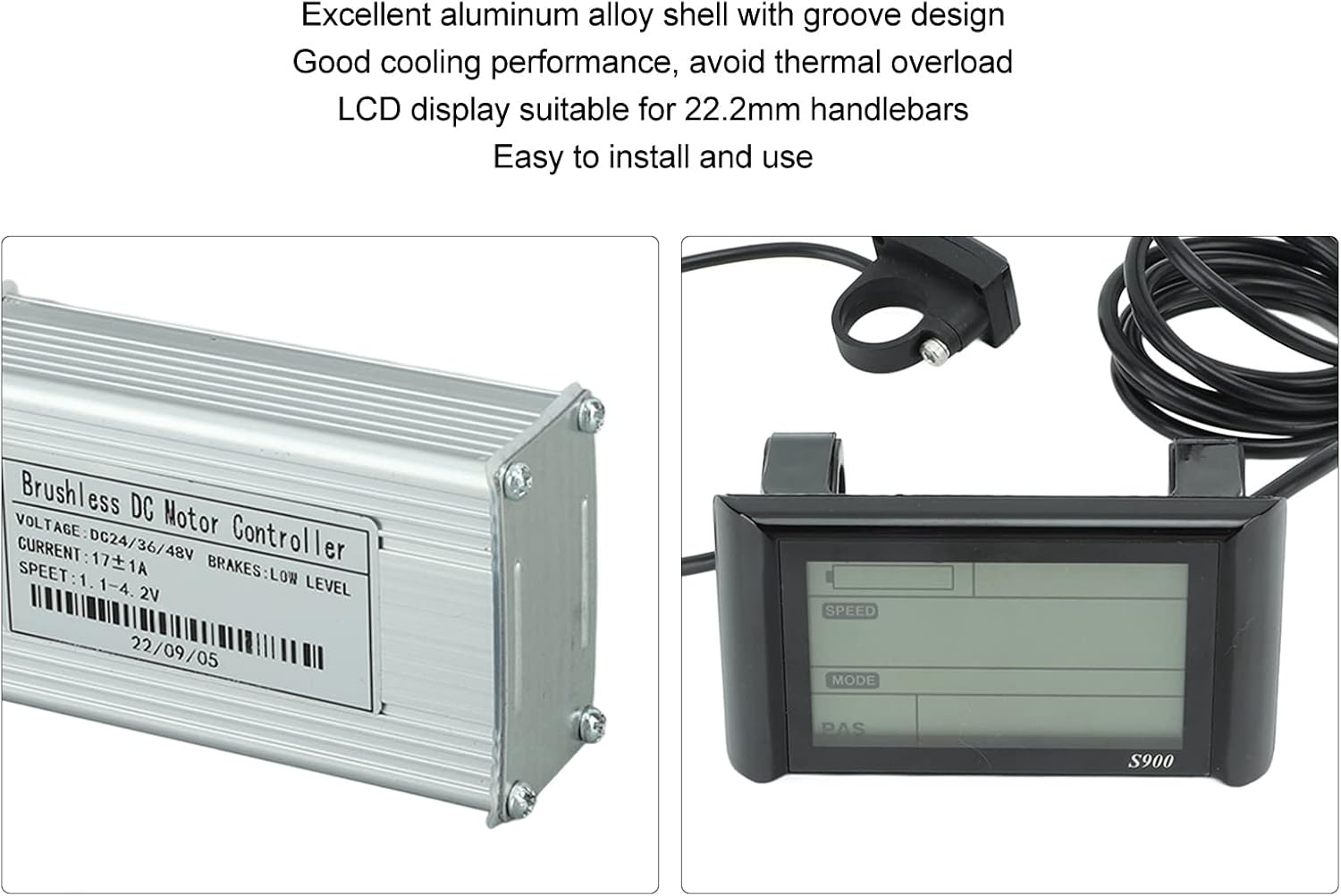 KIT DI CONVERSIONE: il kit di modifica al litio per bicicletta elettrica include un controller a onda sinusoidale a tre modalità da 17 A e un misuratore LCD S900. Questi componenti possono essere utilizzati singolarmente o combinati per una modifica completa della bicicletta elettrica. SOSTITUZIONE PERFETTA: Il kit controller è adatto per motori brushless Hall da 24 V, 36 V e 48 V 250 W-350 W, rendendolo una scelta perfetta per modificare biciclette elettriche, biciclette elettriche, scooter elettrici e sostituire parti danneggiate. Fornisce una soluzione conveniente per aggiornare e migliorare il tuo veicolo elettrico. MODALITÀ SUPPORTATA: Il kit controller dispone di una funzione di autoapprendimento. Quando il motore Hall funziona correttamente, funziona in modalità onda sinusoidale. In caso di malfunzionamento del motore Hall, passa automaticamente alla modalità onda quadra senza sensori Hall, garantendo funzionalità continua e facilità d'uso. DISPLAY COMPLETO: il misuratore LCD S900 è dotato di un guscio in ABS, che fornisce un'interfaccia chiara e intuitiva. Offre un controllo completo del veicolo e una visualizzazione digitale dello stato del veicolo. Il misuratore LCD può visualizzare la velocità di guida, la distanza di guida e altre informazioni essenziali, migliorando la tua esperienza di guida. LEGA DI ALLUMINIO DI RAFFREDDAMENTO: Il controller è costruito con un guscio in lega di alluminio di alta qualità progettato con scanalature per un'eccellente dissipazione del calore. Questo design protegge i circuiti interni dal sovraccarico termico e garantisce prestazioni e durata ottimali. Il misuratore LCD S900 è adatto per manubri da 22,2 mm ed è facile da installare, consentendo una perfetta integrazione nella configurazione della tua bicicletta elettrica.