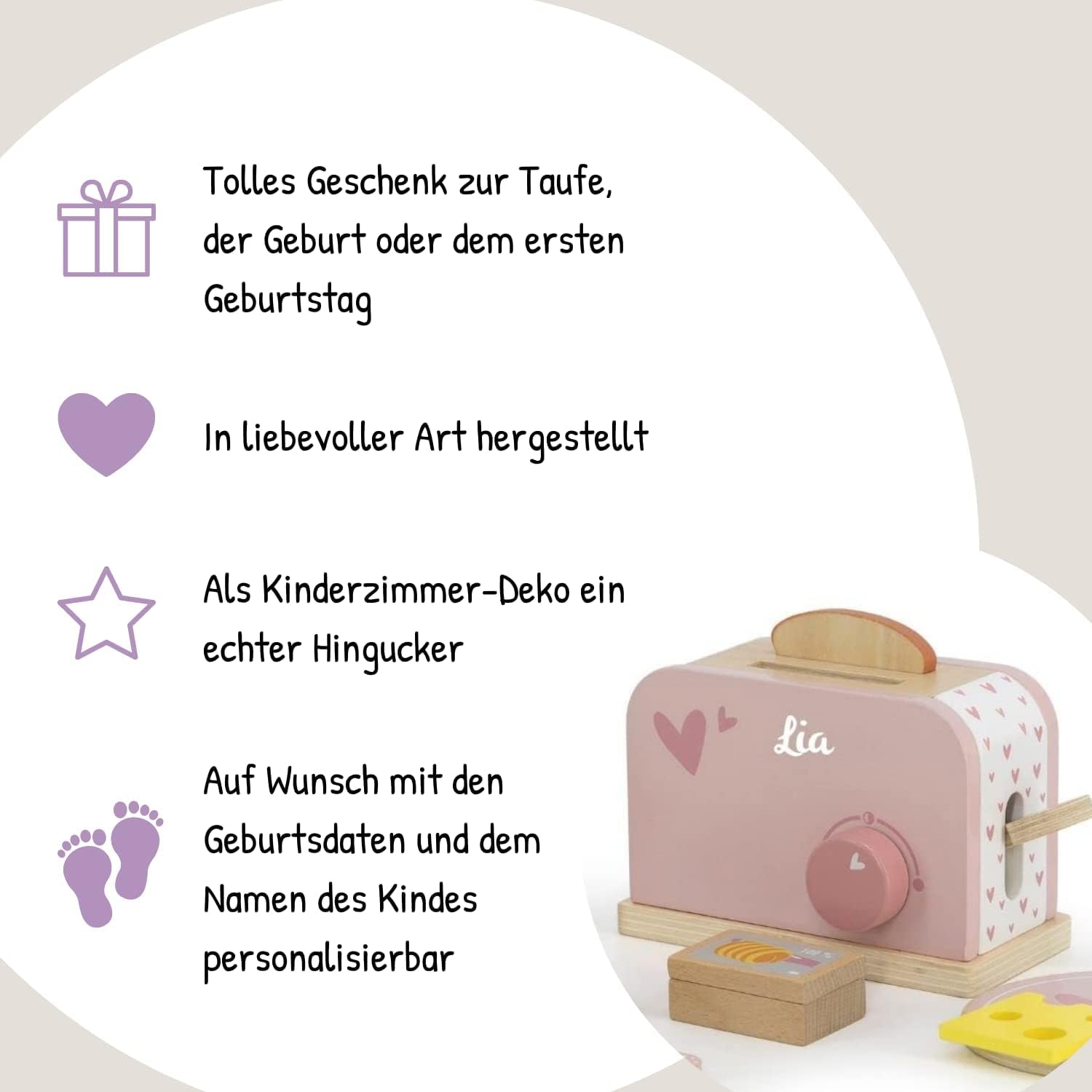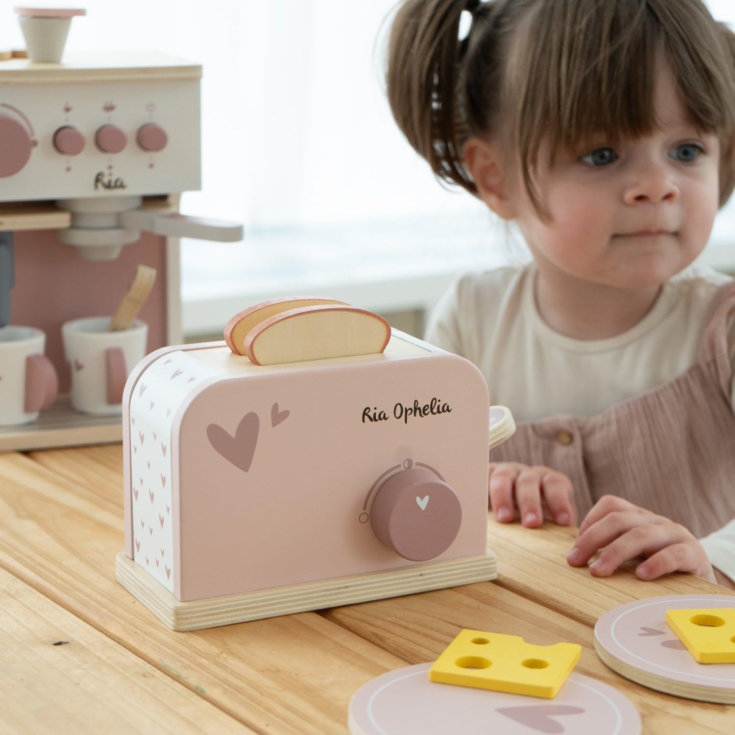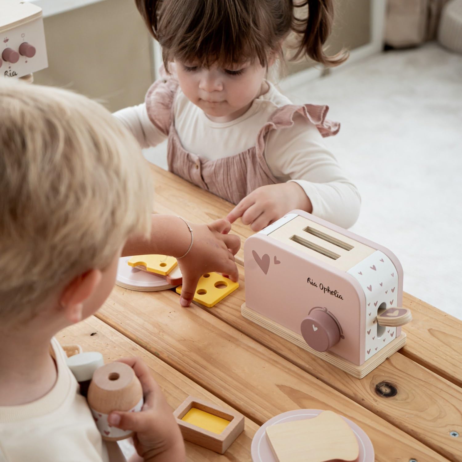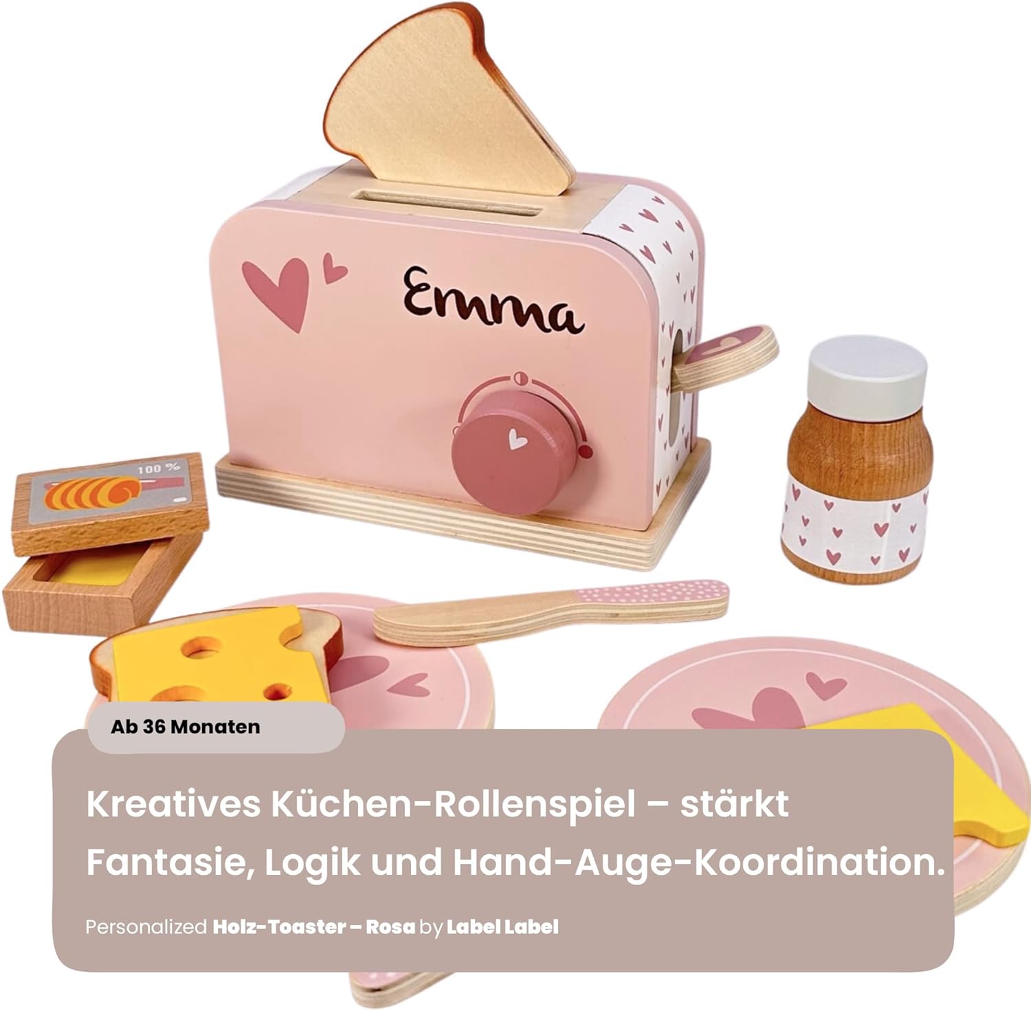 Divertimento per piccoli chef: tostapane realistico in legno rosa con accessori, ideale per giochi di ruolo creativi a colazione. Personalizzabile: grazie alla stampa del nome, il tostapane diventa un pezzo unico e un regalo personale. Giocattolo in legno di alta qualità: realizzato in modo sostenibile in legno robusto e dipinto con colori sicuri per i bambini, durevole e sicuro. Idea regalo unica: perfetta per compleanni, Natale o altre occasioni speciali. Fa brillare gli occhi dei bambini. Promozione integrata giocosamente: supporta le abilità motorie, la creatività, la coordinazione occhio-mano e le abilità sociali nella vita quotidiana.