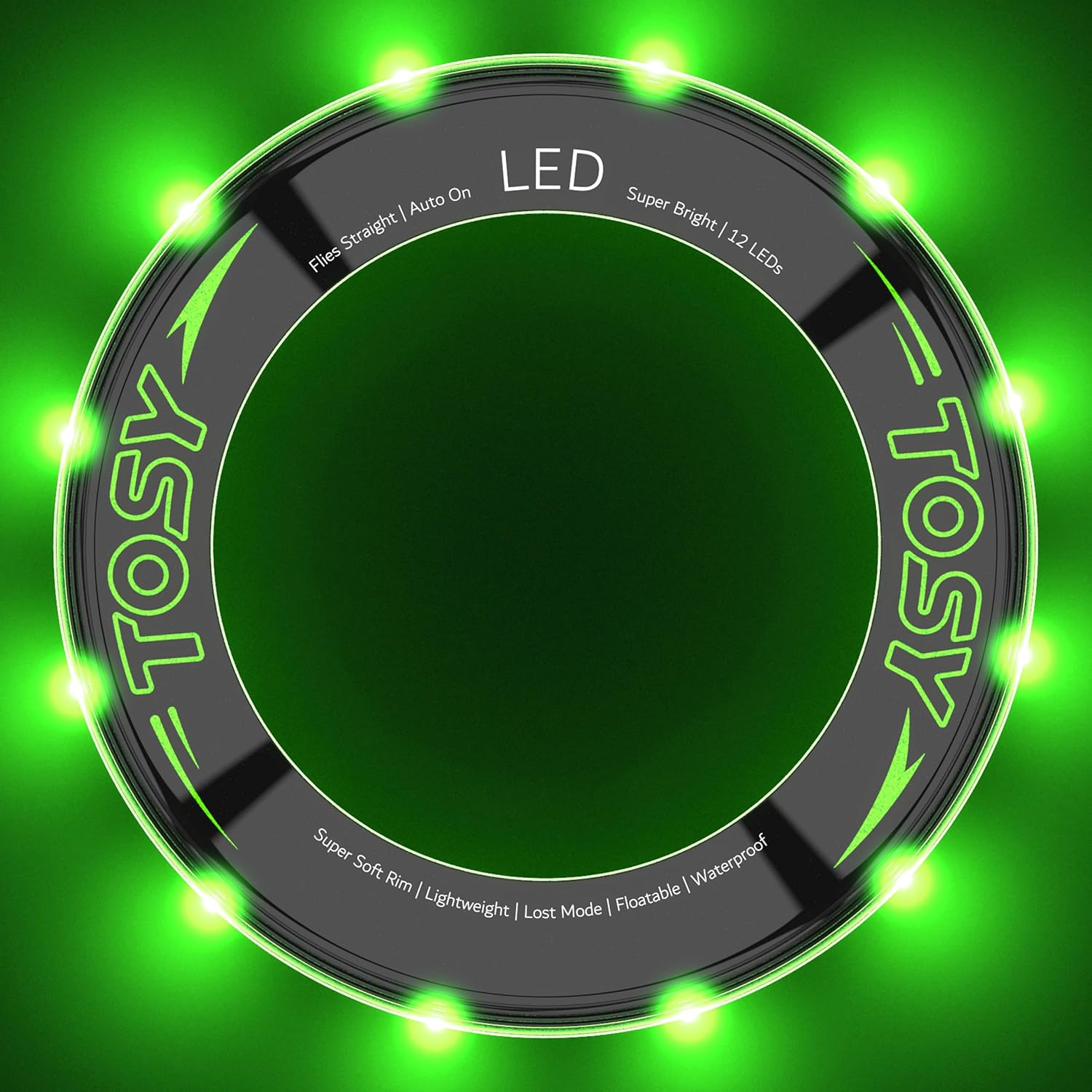 12 LED SUPER LUMINOSI - Essendo l'unico anello volante luminoso al mondo, adorerai giocare con il nostro esclusivo anello volante TOSY all'interno e all'esterno, giorno e notte, con i tuoi amici e familiari. Non crederai quanto è divertente finché non lo proverai! VOLA DRITTO AVANTI E SI ILLUMINA AUTOMATICAMENTE - Il nostro Anello Volante TOSY è leggero e ben bilanciato, è facile da lanciare, vola dritto e si alza fino a 30 metri. Durante il lancio, le luci si accendono e si spengono automaticamente per risparmiare le batterie. La fosforescenza e il bordo che si illumina al buio contribuiscono a rendere l'anello più facile da trovare. BORDO MORBIDO E GIOCO SICURO - Il bordo super morbido rende il lancio e la cattura senza sforzo per i giocatori di tutte le età, dai 5 anni in su. Completamente indolore, scomodo e sicuro da giocare in casa. La batteria inclusa dura fino a 4000 lanci e può essere facilmente sostituita seguendo le istruzioni. IMPERMEABILE E GALLEGGIANTE - Il nostro Anello Volante TOSY è un fantastico giocattolo per qualsiasi riunione, evento, festa, viaggio in campeggio o qualsiasi attività e gioco all'aperto/interno in spiaggia, piscina, parco, prato, giardino... per bambini e adulti. Non è consigliabile giocare con i cani. REGALO PERFETTO – Questa è davvero un'idea regalo imperdibile per le calze di Natale, i cesti pasquali, i compleanni o altre occasioni speciali perché è così divertente, di alta qualità, durevole e unico. Se hai domande o hai bisogno di aiuto, contatta il nostro servizio clienti (indirizzo email stampato sul prodotto).