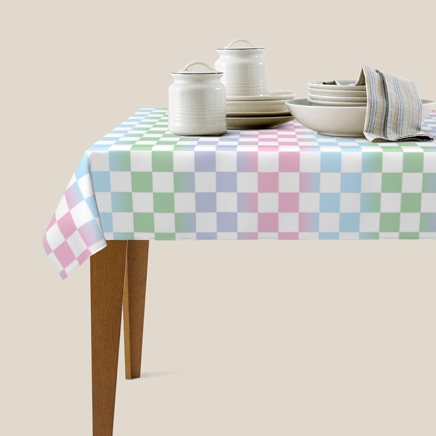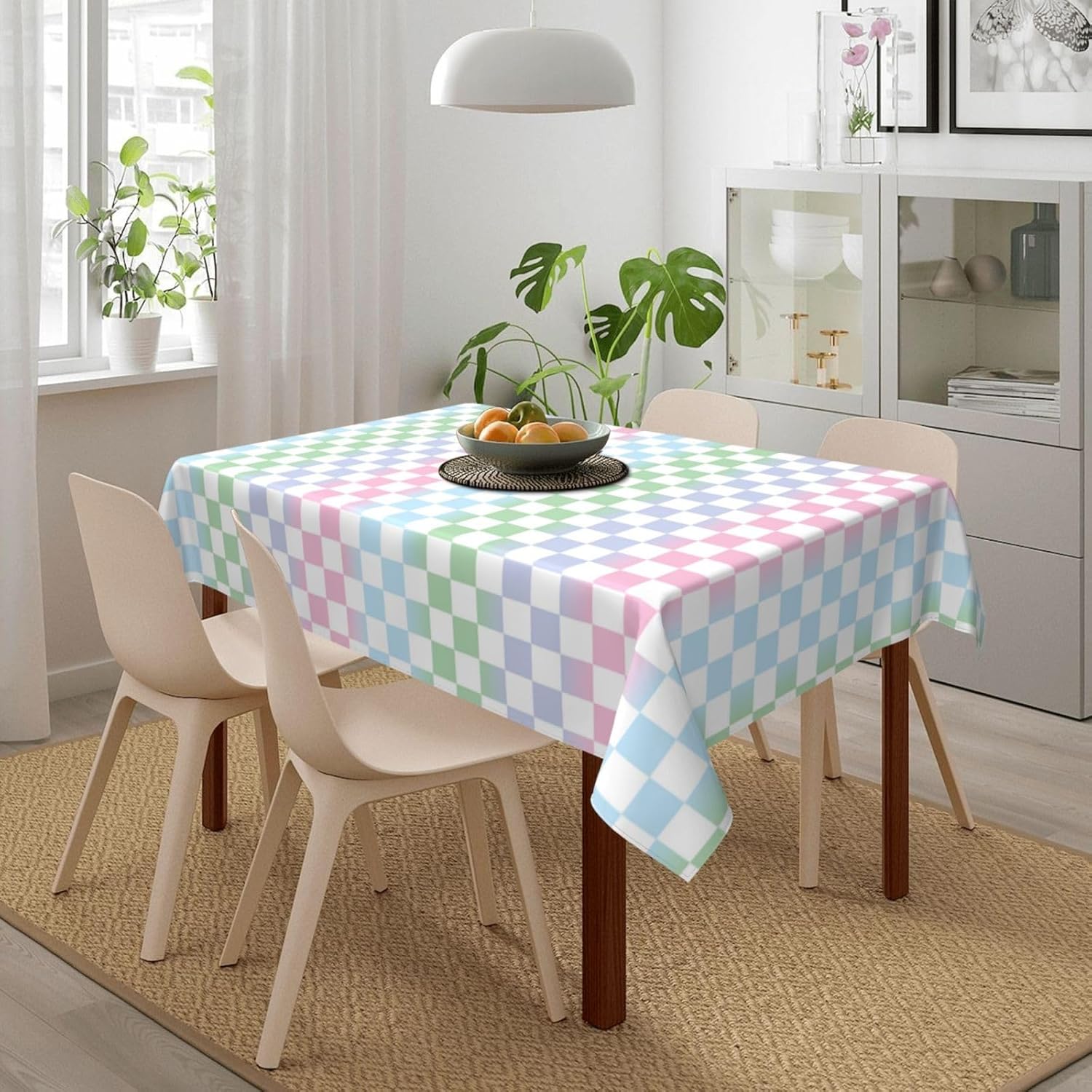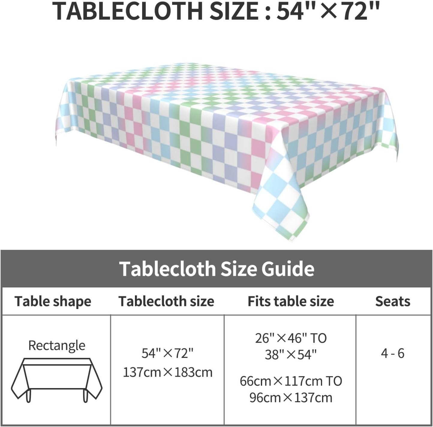 Tessuto tovaglia: la nostra tovaglia colorata a scacchiera è realizzata in tessuto poliestere di alta qualità, che offre una sensazione morbida e accogliente. Il materiale resistente all'acqua protegge il tuo tavolo da schizzi e macchie, rendendolo una tovaglia ideale per varie occasioni. Resistente alle pieghe e riutilizzabile: questa tovaglia colorata a scacchiera è resistente alle pieghe e può essere facilmente lavata e riutilizzata per mantenere il tuo tavolo da pranzo fresco e pulito. Perfetto per scopi decorativi e funzionali, sia come tovaglia da pranzo che come tovaglia da esterno. Dimensioni della tovaglia: 54" x 72". Questa tovaglia rettangolare a scacchiera colorata si adatta a tavoli da 26" x 46" a 38" x 54". MULTIUSO: La nostra tovaglia colorata a scacchiera è adatta a qualsiasi ambiente interno o esterno, inclusi bar, cene, brunch, buffet, picnic, matrimoni e feste. È un'aggiunta versatile alla decorazione della tua tavola, adatta come tovaglia da picnic o tovaglia da esterno. Decorazione della casa: queste colorate tovaglie rettangolari a scacchiera non solo proteggono il tuo tavolo da graffi e macchie, ma aggiungono anche un tocco festoso alla tua sala da pranzo. La tovaglia è perfetta per valorizzare l'arredamento della tua casa mantenendo la tavola pulita e protetta