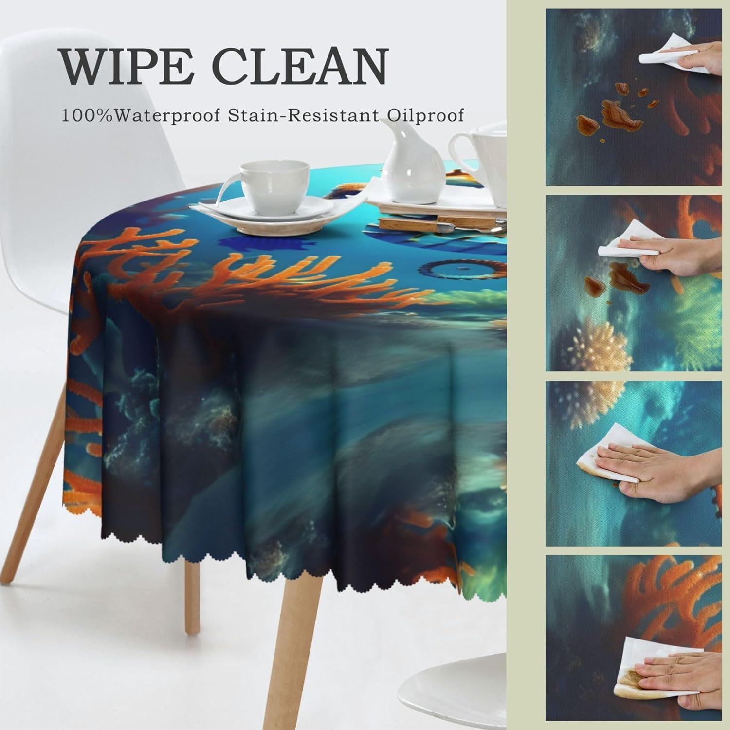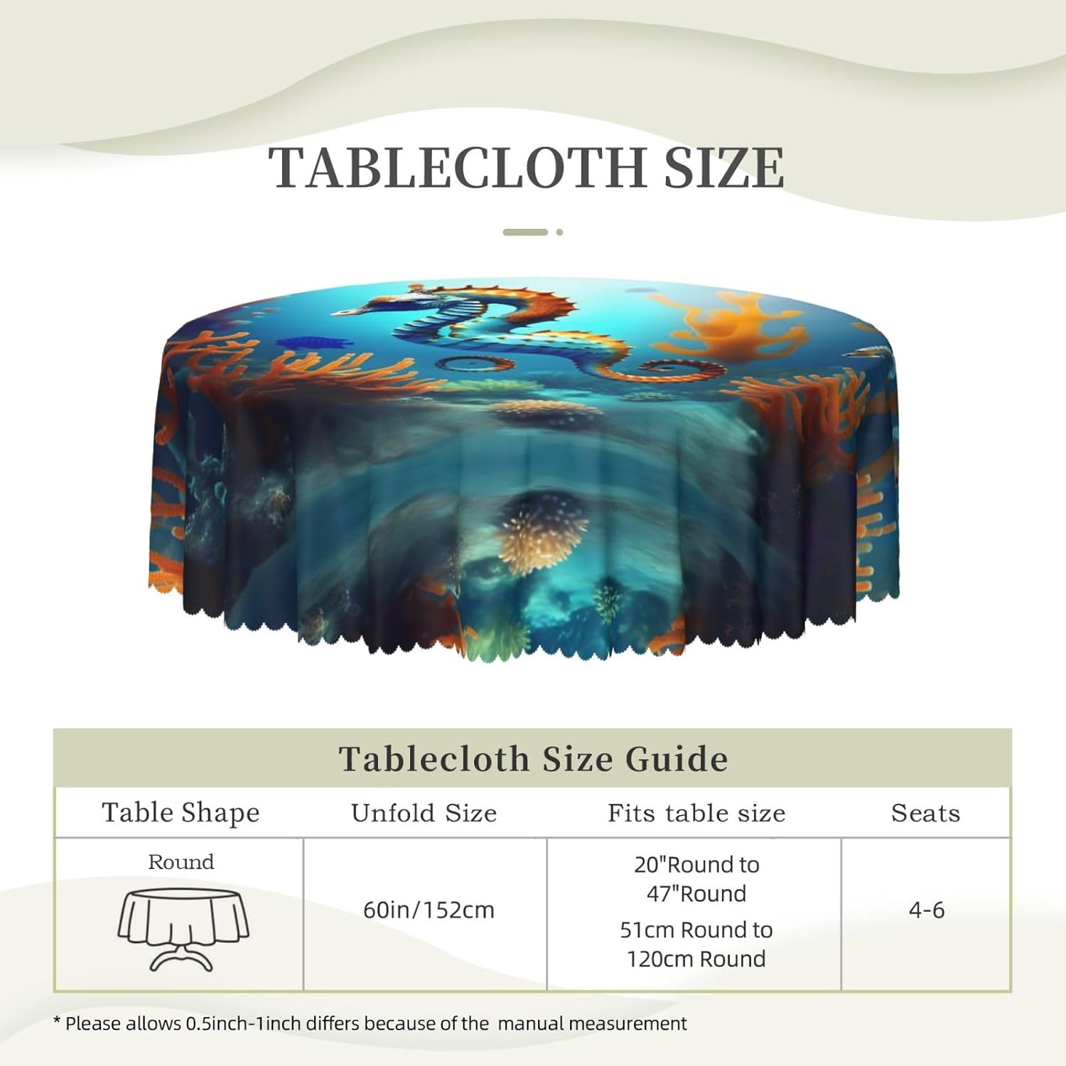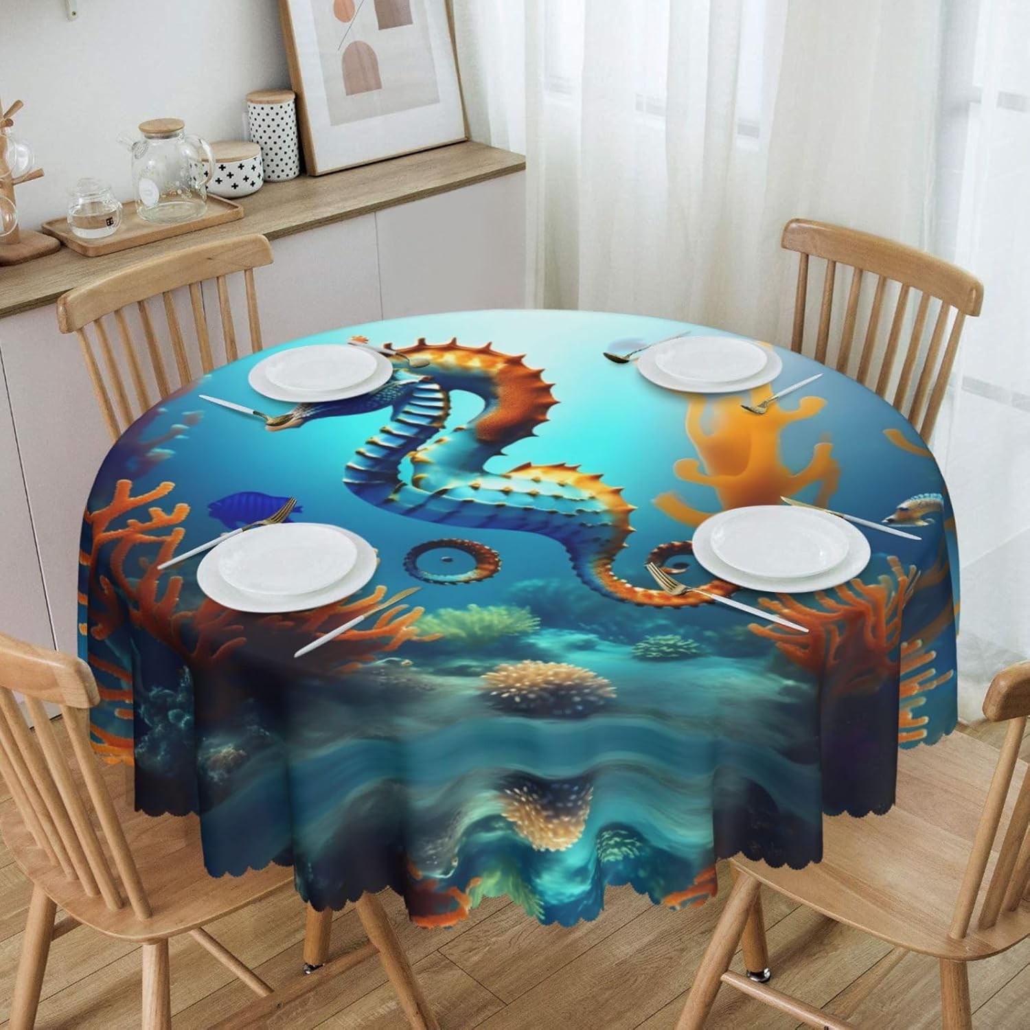 Tovaglia rotonda Seahorse da 60 pollici di diametro con dettagli eleganti e raffinati, adatta per tavoli da pranzo e sale da pranzo familiari, che migliora l'atmosfera della stanza, come un'opera d'arte. le cene aggiungono calore, i picnic uniscono natura e cibo e le feste di matrimonio sono elementi decorativi, adatti a tutti i tipi di tavole rotonde. Morbido al tatto: la tovaglia sembra seta, ha una buona resistenza alle pieghe, protegge il piano del tavolo dalle macchie, rende il piano del tavolo pieno di vitalità e un nuovo aspetto. La tovaglia è facile da pulire: può essere lavata a mano o in lavatrice e non può essere sbiancata per evitare che sbiadisca.