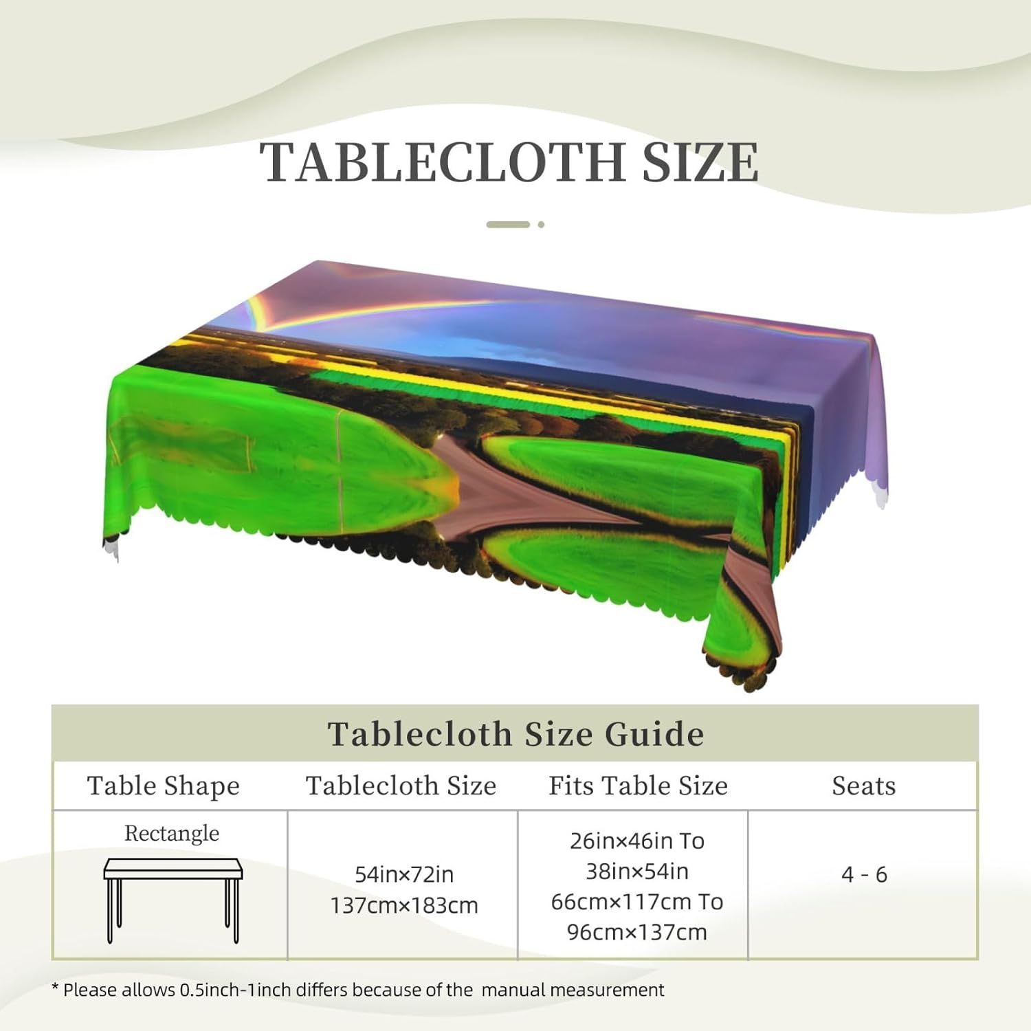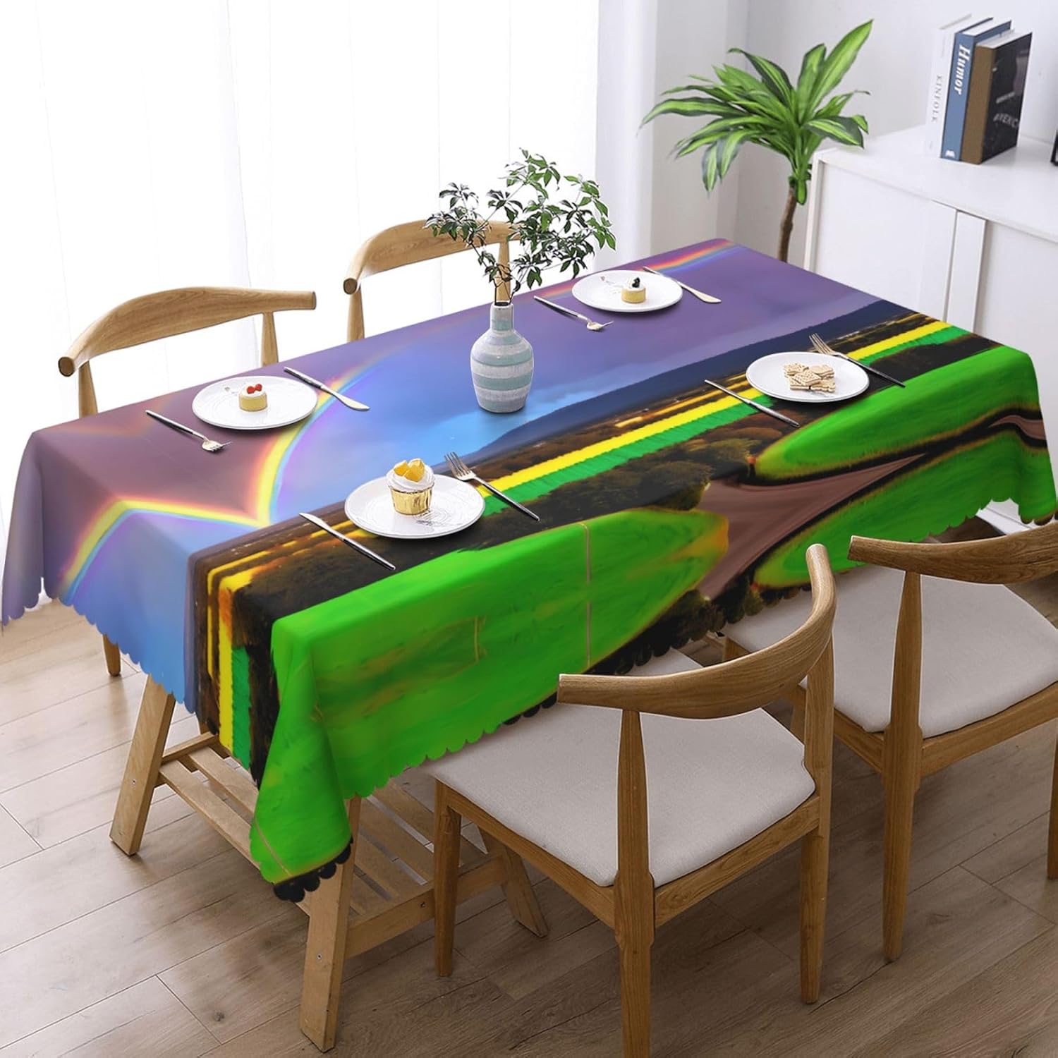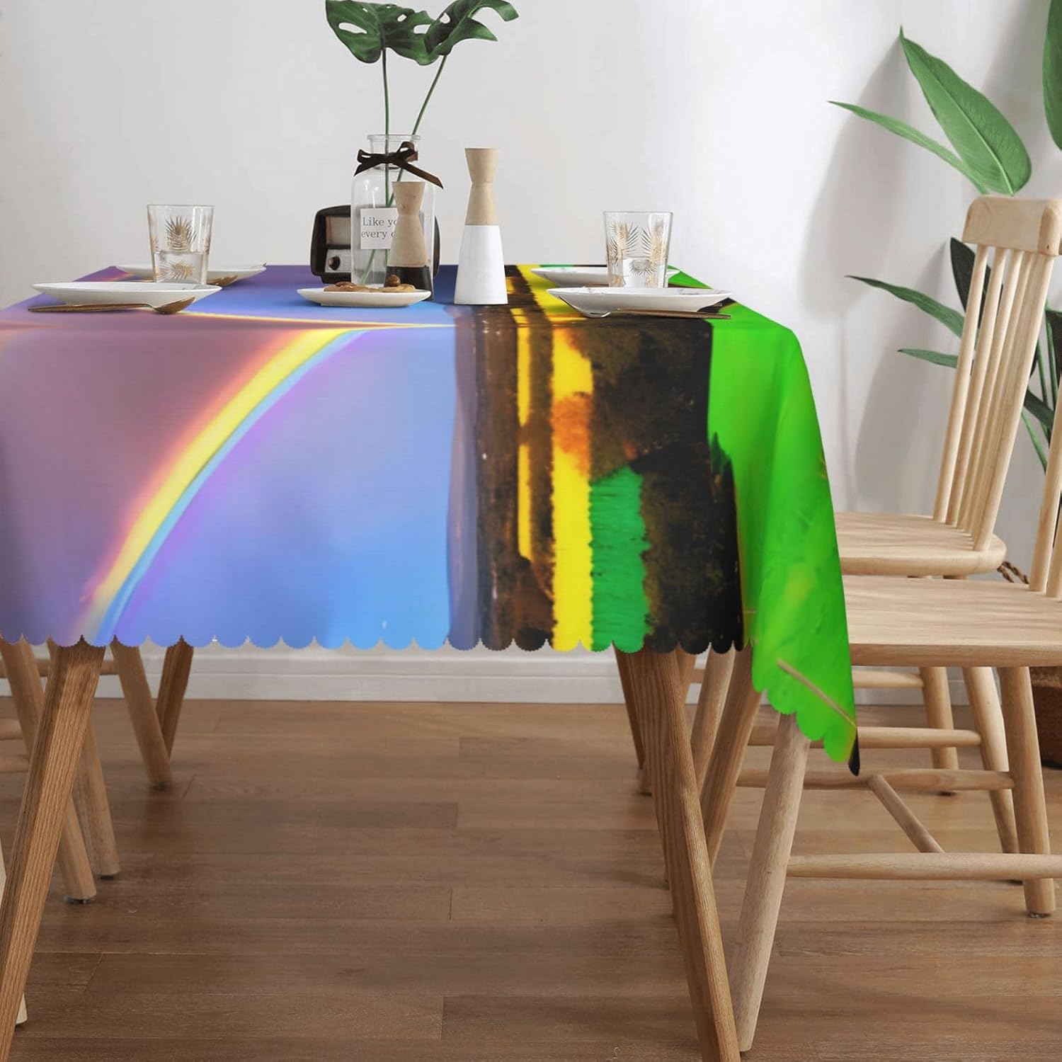 Il prodotto adotta un design di stampa solo fronte a tutta larghezza, fibra di poliestere al 100%, consistenza leggera, buona flessibilità, facile da riporre e organizzare. Il materiale è un tessuto impermeabile, morbido, antirughe, lavabile e riutilizzabile, adatto per proteggere e decorare tavoli da pranzo, proteggere tavoli e mobili da graffi, macchie, ecc., creando un'atmosfera calda ed elegante per l'ambiente da pranzo. Questa tovaglia è adatta a qualsiasi luogo interno ed esterno come bar, cene, brunch, buffet, picnic, matrimoni, feste, ecc., aggiungendo un fascino unico ad ogni momento speciale. Una tovaglia quadrata dalla forma unica con un bordo in pizzo semicircolare accuratamente progettato. Lavare a mano o in lavatrice a temperatura ambiente. Non candeggiare per evitare di danneggiare il colore e il materiale della tovaglia. Durante la stiratura, mantenere la temperatura bassa (sotto i 100 ℃). Il prodotto è stampato su un lato, realizzato in 100% poliestere, morbido al tatto e resistente alle pieghe, lavabile e riutilizzabile e può essere utilizzato in molteplici occasioni.