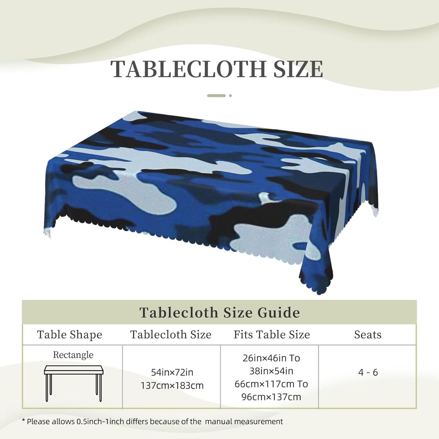 Questa tovaglia decorativa rettangolare con motivo mimetico blu misura 137 x 183 cm. Tovaglia con motivo mimetico blu realizzata in materiale poliestere, calda e morbida, buona resistenza alle pieghe, può essere lavata e riutilizzata, protegge dalla polvere e protegge da ammaccature, scheggiature e graffi. La tovaglia con motivo mimetico blu può essere utilizzata sia all'interno che all'esterno, ideale per feste, matrimoni, campeggio, patio, compleanni in famiglia, buffet, barbecue, tavoli da cucina, ecc. Tovaglia quadrata con stampa mimetica blu, bordo in pizzo semicircolare, Attenzione: non candeggiare, non esporre alla luce solare, è accettabile sia il lavaggio a mano che in lavatrice a temperatura ambiente e la stiratura a bassa temperatura. Se hai problemi o domande, contattaci, ti risponderemo entro 24 ore