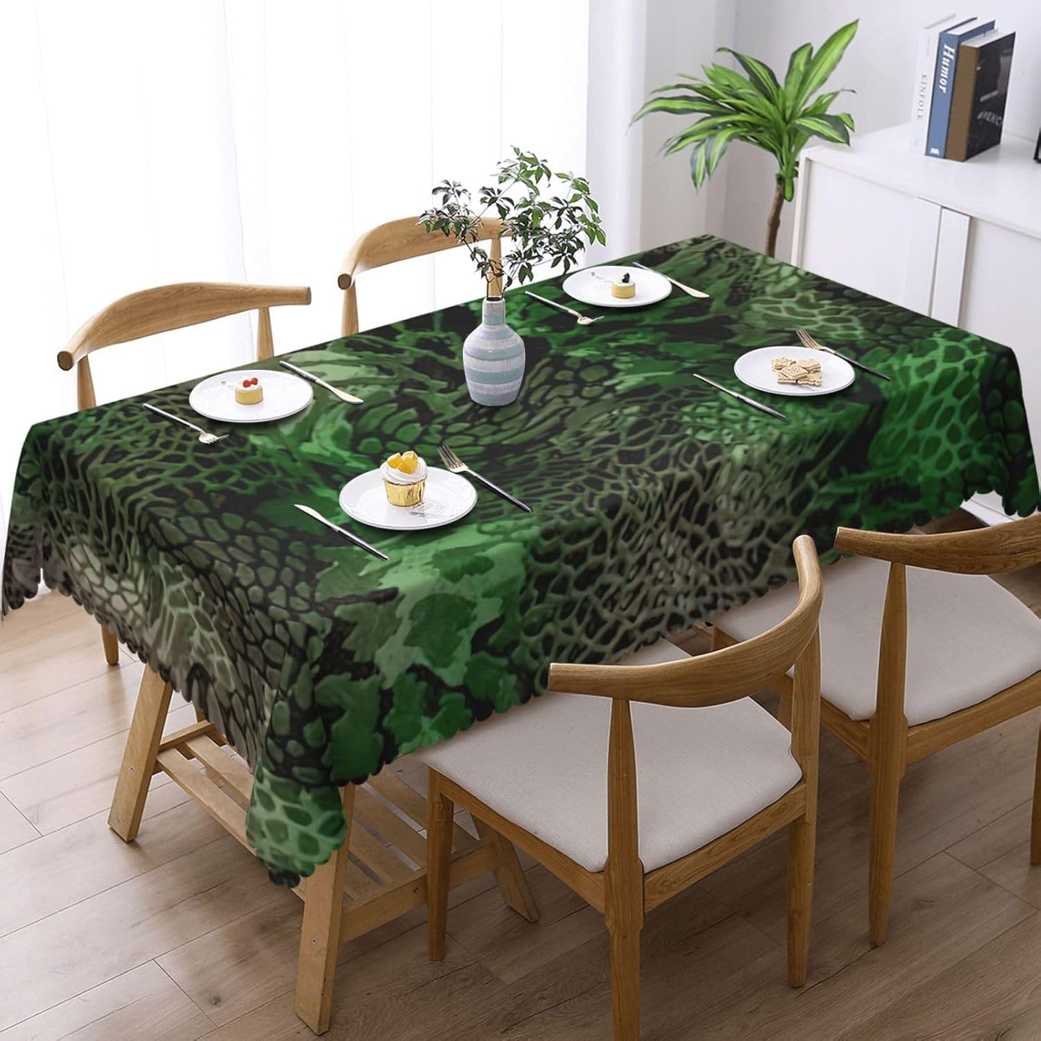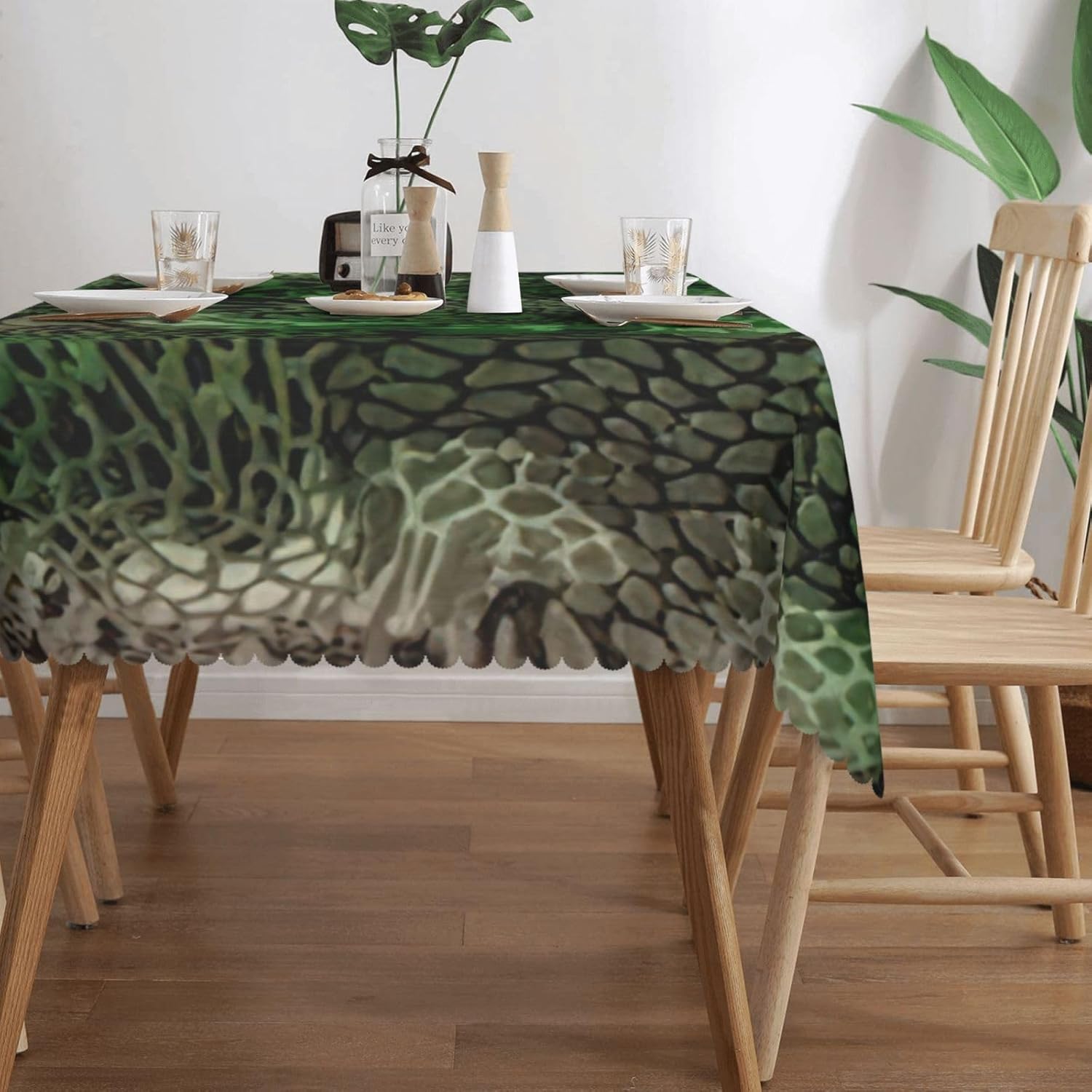 Questa tovaglia decorativa rettangolare con motivo serpente verde è 137x183 cm. Tovaglia con motivo serpente verde realizzata in materiale poliestere, calda e morbida, buona resistenza alle pieghe, può essere lavata e riutilizzata, protegge dalla polvere e protegge da ammaccature, scheggiature e graffi. Tovaglia verde con motivo serpente, può essere utilizzata sia all'interno che all'esterno, ideale per feste, matrimoni, campeggio, patio, compleanno in famiglia, buffet, barbecue, tavoli da cucina, ecc. Tovaglia quadrata verde con motivo serpente, bordo in pizzo semicircolare, Attenzione: non candeggiare, non esporre alla luce solare, è accettabile sia il lavaggio a mano che in lavatrice a temperatura ambiente e la stiratura a bassa temperatura. Se hai problemi o domande, ti preghiamo di contattarci, ti risponderemo entro 24 ore
