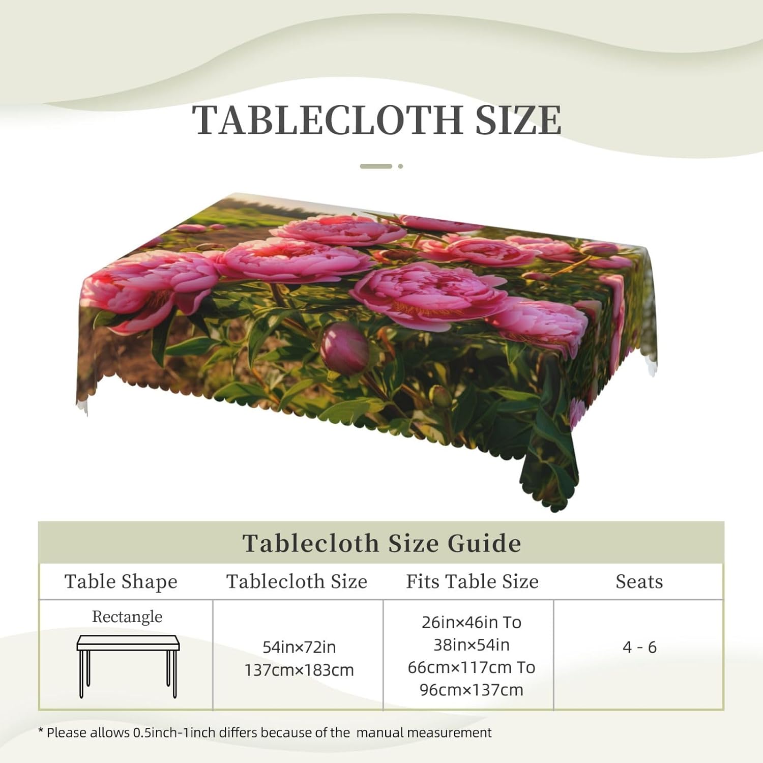 Questa tovaglia rettangolare peonie rosa è 54 "x 72" tovaglia peonie rosa realizzata in materiale poliestere, calda e morbida, buona resistenza alle pieghe, può essere lavata e riutilizzata, protegge dalla polvere e protegge da ammaccature, scheggiature e graffi. Tovaglia peonie rosa, utilizzabile sia all'interno che all'esterno, ideale per feste, matrimoni, campeggio, patio, compleanno in famiglia, buffet, barbecue, tavoli da cucina, ecc. Mazzo quadrato di peonie rosa, bordo con pizzo mezzo giro. Attenzione: non candeggiare, non esporre alla luce solare, sono accettabili sia il lavaggio a mano che il lavaggio in lavatrice a temperatura ambiente e la stiratura a bassa temperatura. Se hai problemi o domande, contattaci, ti risponderemo entro 24 ore