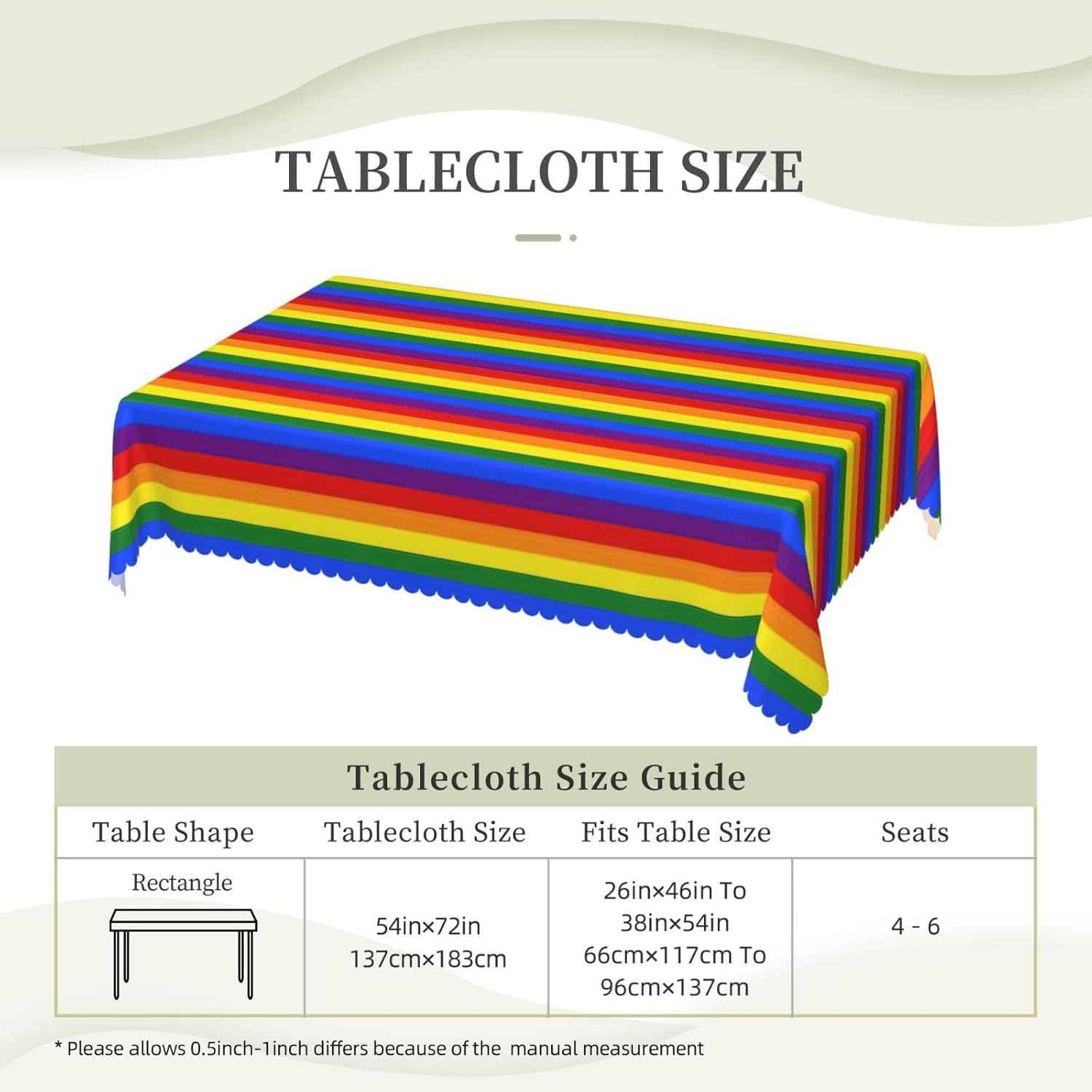 Questa tovaglia rettangolare con motivo arcobaleno misura 137x183 cm. Tovaglia con motivo arcobaleno realizzata in materiale poliestere, calda e morbida, buona resistenza alle pieghe, può essere lavata e riutilizzata, protegge dalla polvere e protegge da ammaccature, scheggiature e graffi. Tovaglia con motivo arcobaleno, può essere utilizzata sia all'interno che all'esterno, ideale per feste, matrimoni, campeggio, patio, compleanno in famiglia, buffet, barbecue, tavoli da cucina, ecc. Tovaglia quadrata con motivo arcobaleno, bordo in pizzo semicircolare, Attenzione: non candeggiare, non esporre alla luce solare, è accettabile sia il lavaggio a mano che in lavatrice a temperatura ambiente e la stiratura a bassa temperatura. Se hai problemi o domande, ti preghiamo di contattarci, ti risponderemo entro 24 ore