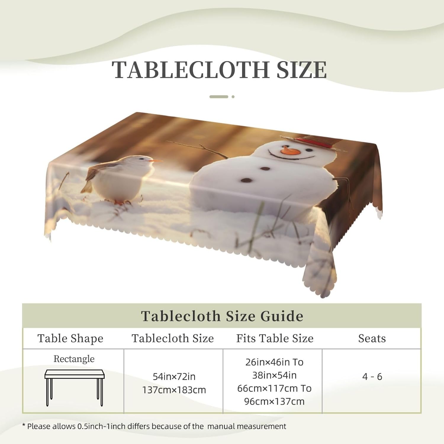 Questa tovaglia rettangolare con pupazzo di neve e uccelli è 54 "x 72" con stampa di pupazzi di neve e uccelli, realizzata in materiale poliestere, calda e morbida, buona resistenza alle pieghe, può essere lavata e riutilizzata, protegge dalla polvere e protegge da ammaccature, scheggiature e graffi. Tovaglia con stampa pupazzo di neve e uccelli, può essere utilizzata sia all'interno che all'esterno, ideale per feste, matrimoni, campeggio, patio, compleanno in famiglia, buffet, barbecue, tavoli da cucina, ecc. Tovaglia quadrata con stampa pupazzo di neve e uccelli, bordo in pizzo semicircolare, Attenzione: non candeggiare, non esporre alla luce solare, sono accettabili sia il lavaggio a mano che in lavatrice a temperatura ambiente e la stiratura a bassa temperatura. Se avete problemi o domande, non esitate a contattarci, vi risponderemo entro 24 ore