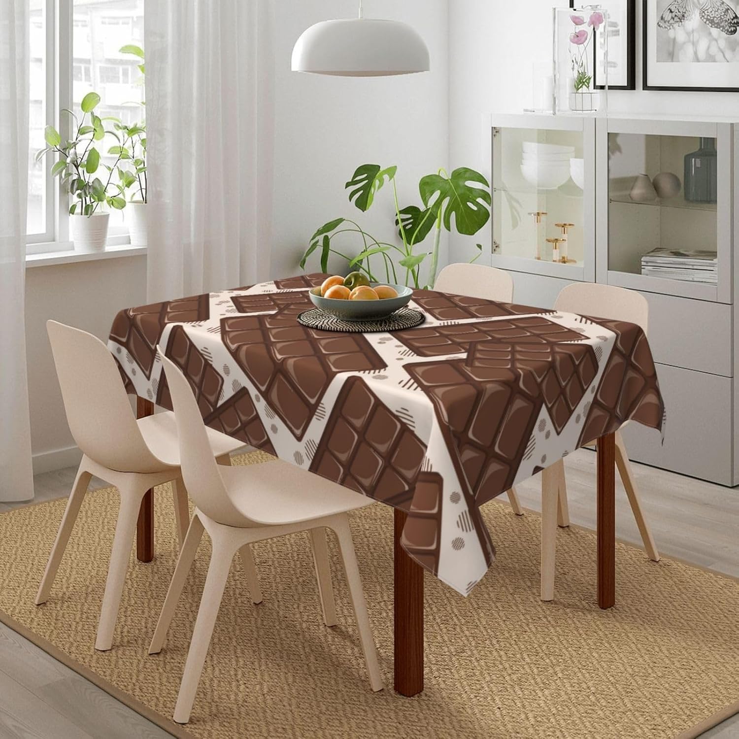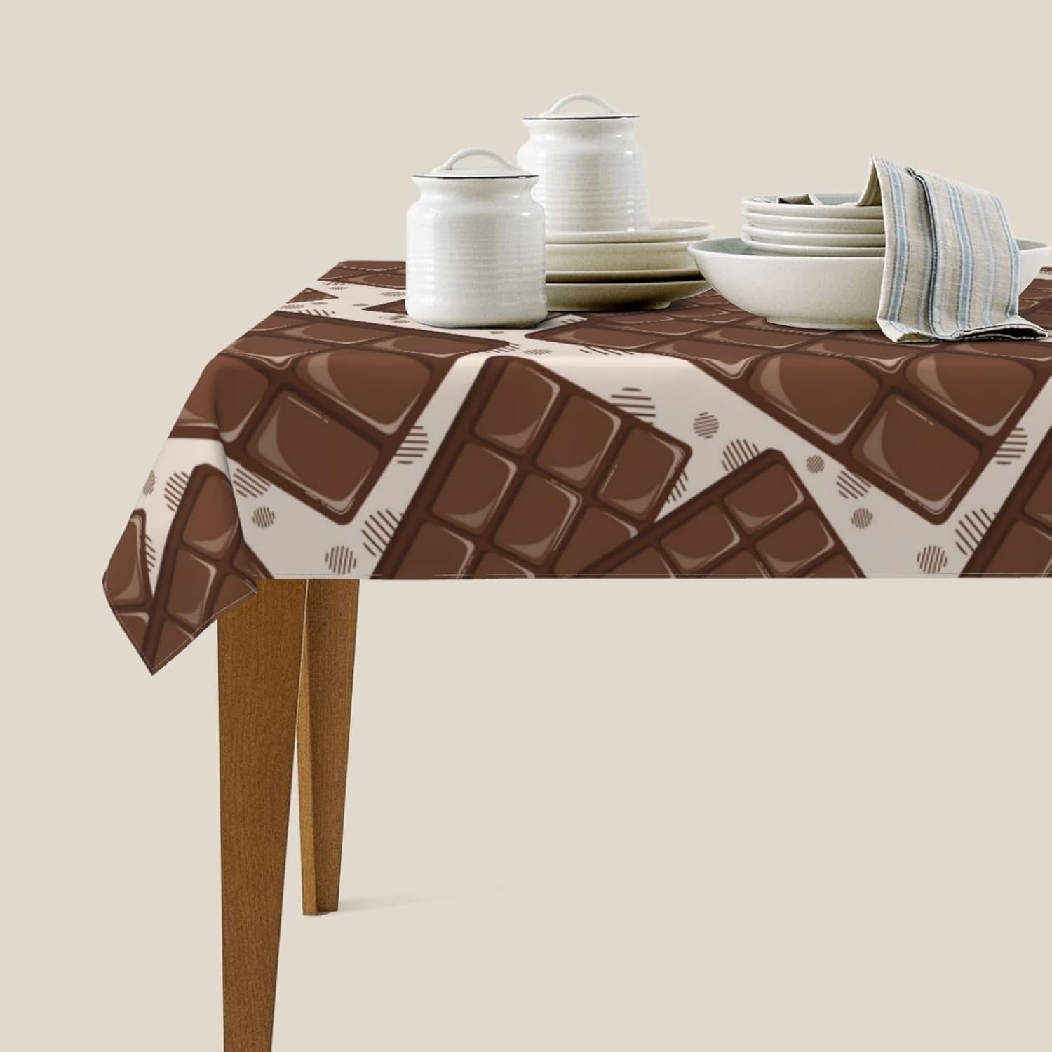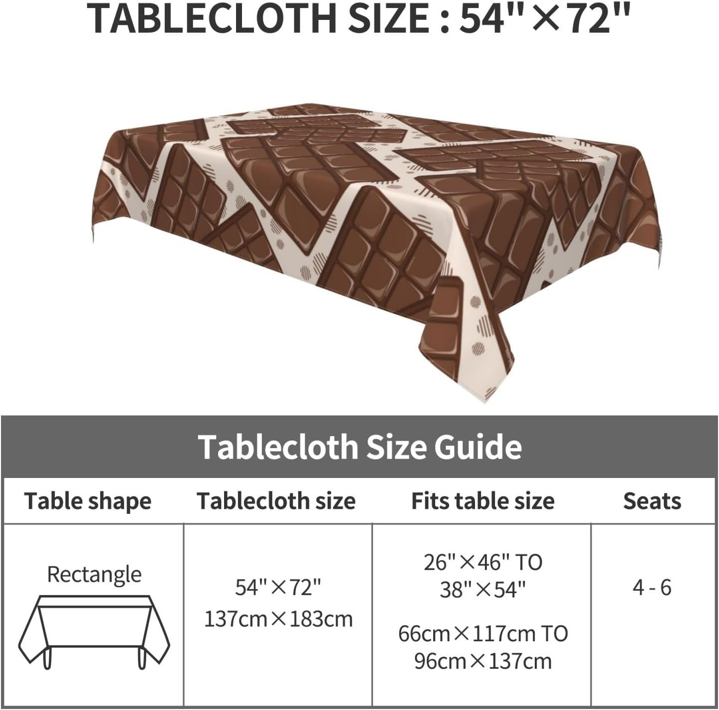 Tessuto tovaglia: la nostra graziosa tovaglia con motivo cioccolato è realizzata in tessuto poliestere di alta qualità, fornendo un tocco morbido e accogliente. Il materiale resistente all'acqua protegge il tuo tavolo da schizzi e macchie, rendendolo una tovaglia ideale per varie occasioni.,Resistente alle pieghe e riutilizzabile: questa graziosa tovaglia con motivo cioccolato è resistente alle pieghe e può essere facilmente lavata e riutilizzata per mantenere il tuo tavolo da pranzo fresco e pulito. Perfetto per scopi decorativi e funzionali, sia come tovaglia da pranzo che come tovaglia da esterno. Dimensioni della tovaglia: 54" x 72". Questa graziosa tovaglia rettangolare con motivo cioccolato si adatta a tavoli da 26" x 46" a 38" x 54". Uso versatile: la nostra graziosa tovaglia con motivo cioccolato è adatta a qualsiasi ambiente interno o esterno, inclusi caffè, cene, brunch, buffet, picnic, matrimoni e feste. È un'aggiunta versatile alla decorazione della tua tavola, adatta come tovaglia da picnic o tovaglia da esterno.,Decorazioni per la casa: queste graziose tovaglie con motivo cioccolato non solo proteggono il tuo tavolo da graffi e macchie, ma aggiungono anche un tocco festoso alla tua sala da pranzo. La tovaglia è perfetta per valorizzare l'arredamento della tua casa mantenendo la tavola pulita e protetta
