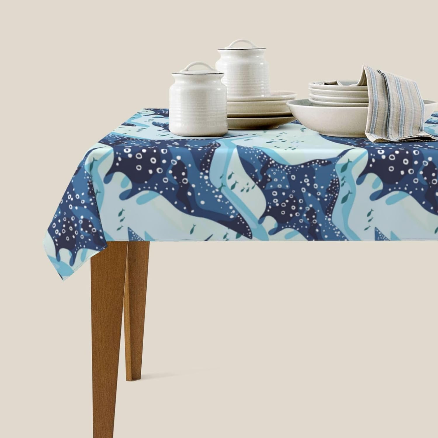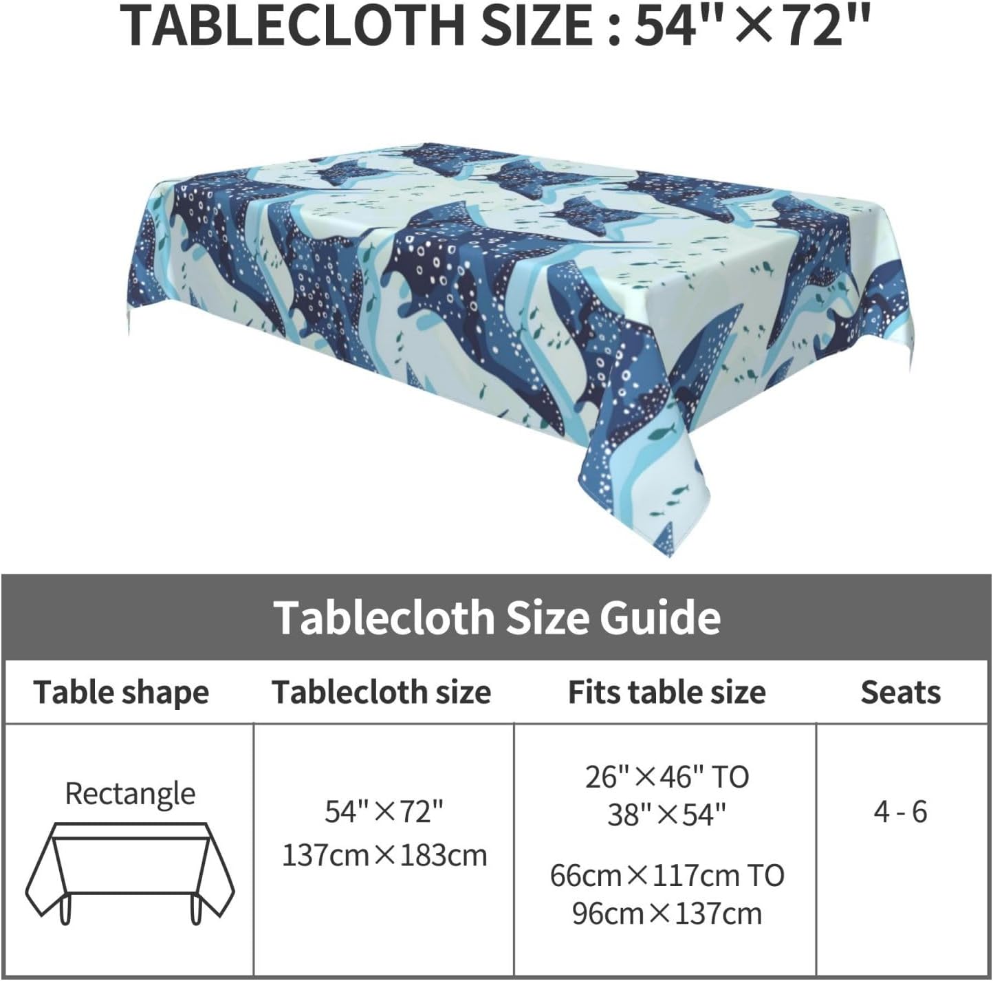 Tessuto tovaglia: la nostra fantastica tovaglia con pesce blu raggio è realizzata in tessuto di poliestere di alta qualità per una sensazione morbida e accogliente. Il materiale resistente all'acqua protegge il tuo tavolo da schizzi e macchie, rendendolo una tovaglia ideale per varie occasioni. Perfetto per scopi decorativi e funzionali, sia come tovaglia da pranzo che come tovaglia da esterno. Dimensioni della tovaglia: 54" x 72". Questa tovaglia rettangolare con pesce razza è adatta a tavoli da 26" x 46" a 38" x 54". È un'aggiunta versatile alla decorazione della tua tavola, adatta come tovaglia da picnic o tovaglia da esterno.,Decorazioni per la casa: queste tovaglie rettangolari blu freddo di razza non solo proteggono il tuo tavolo da graffi e macchie, ma aggiungono anche un tocco festoso alla tua sala da pranzo. La tovaglia è perfetta per valorizzare l'arredamento della tua casa mantenendo la tavola pulita e protetta